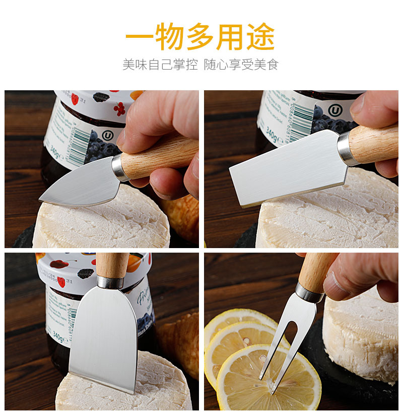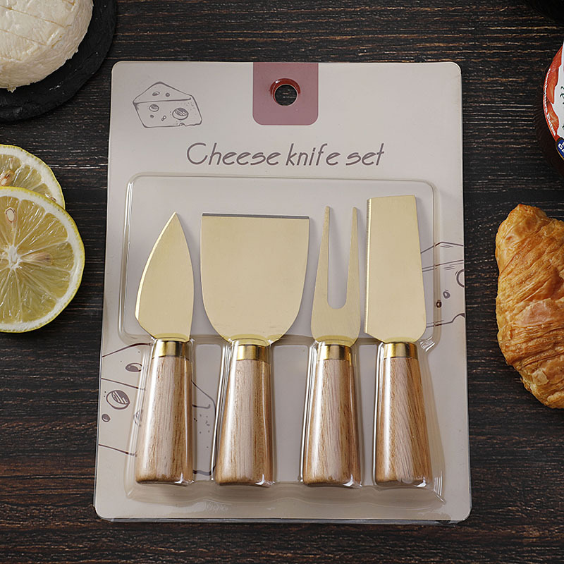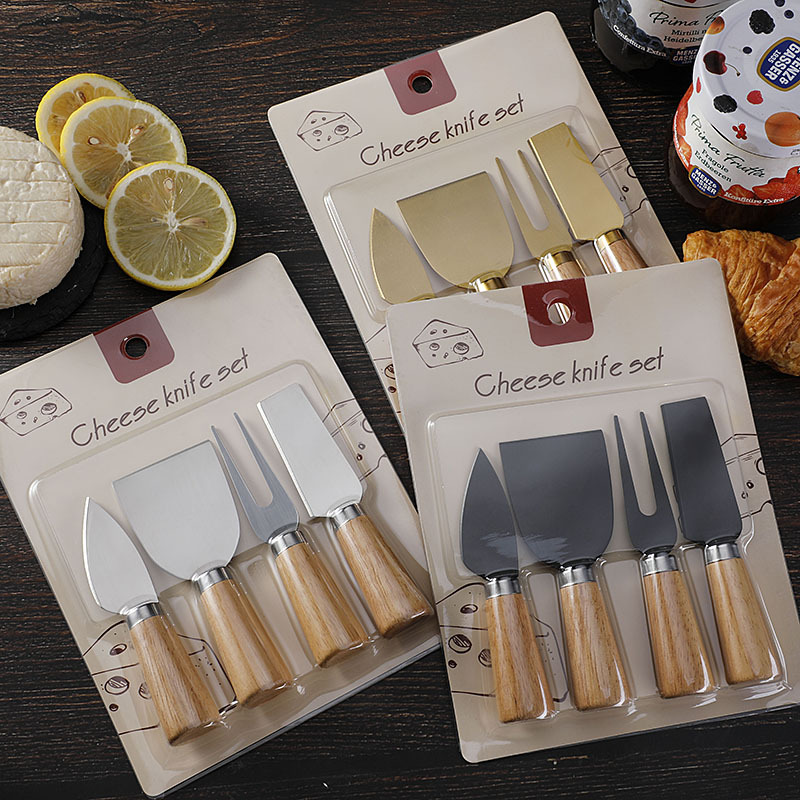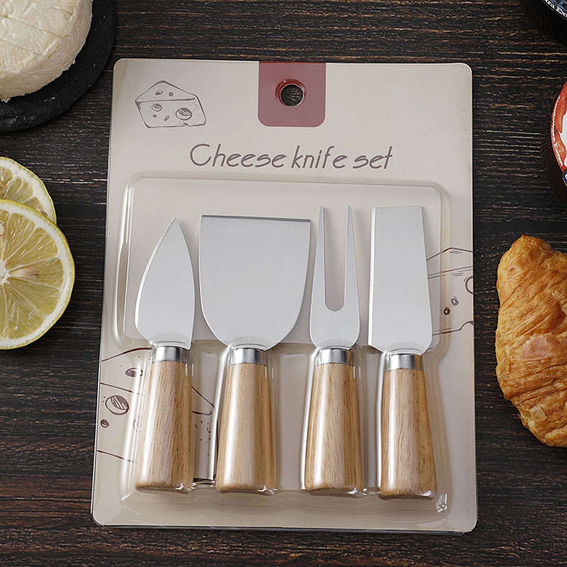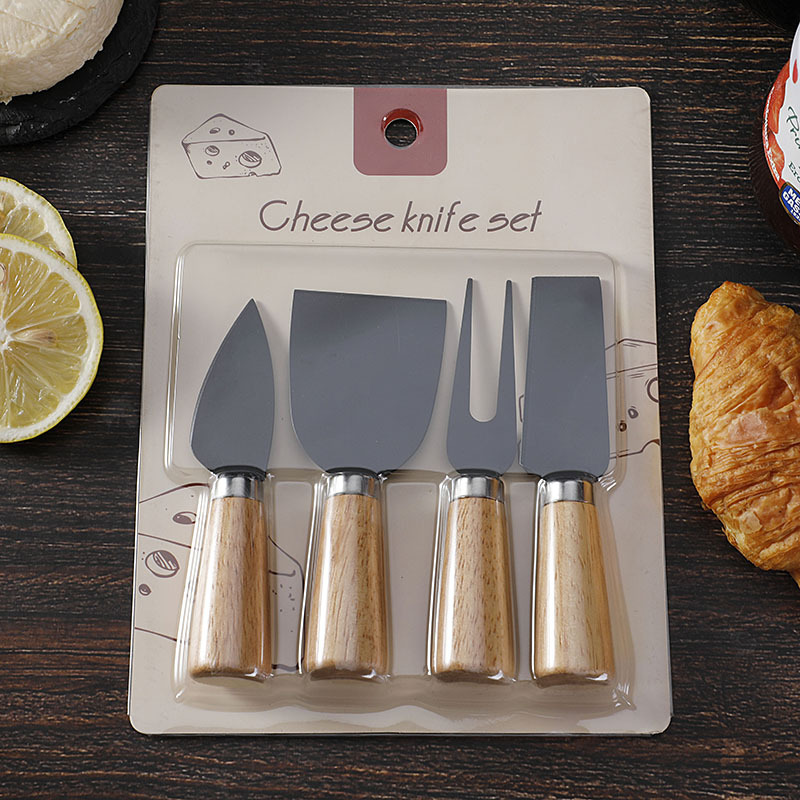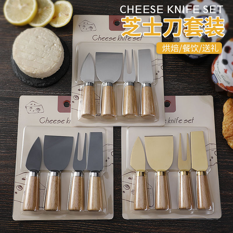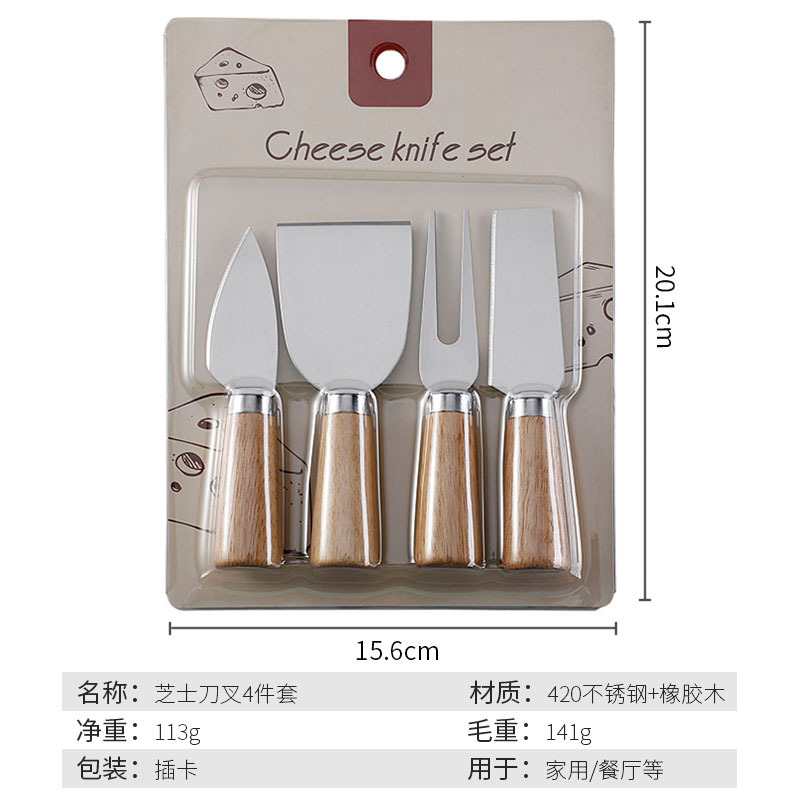 跨境现货橡胶木柄奶酪工具插卡包装刀叉铲套装不锈钢芝士刀四件套