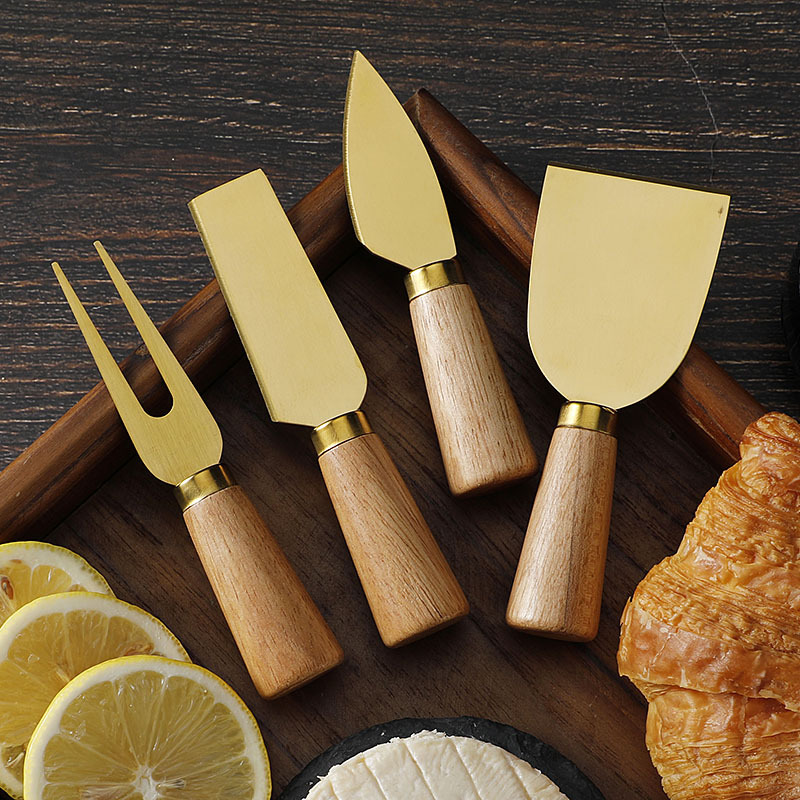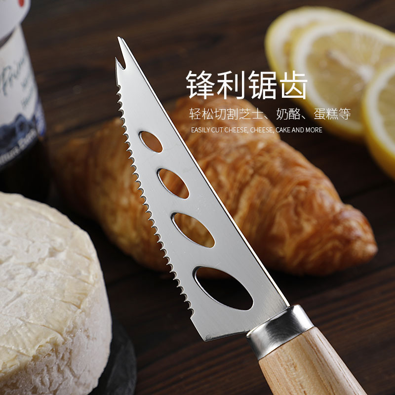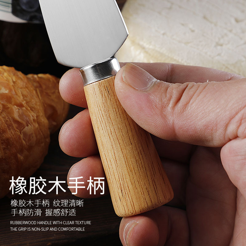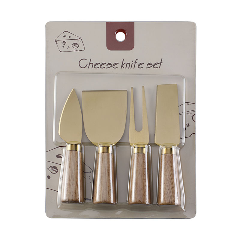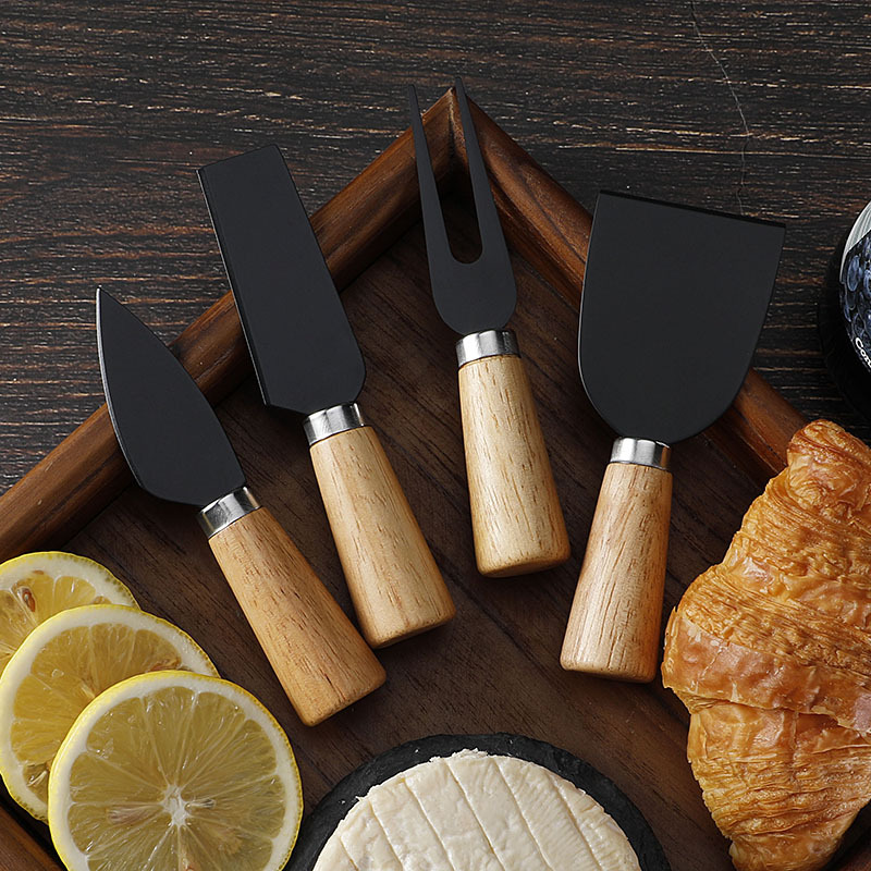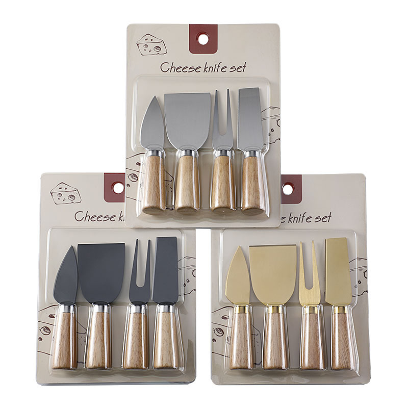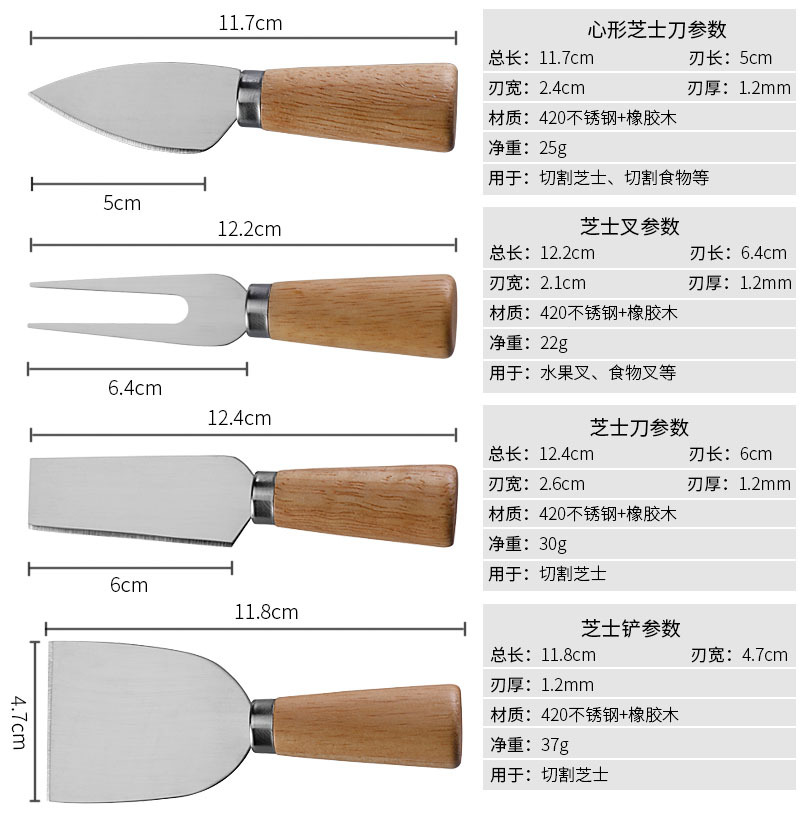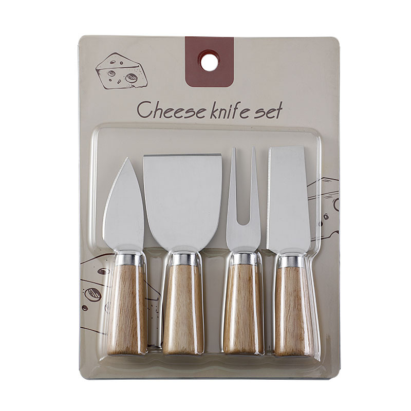 跨境现货橡胶木柄奶酪工具插卡包装刀叉铲套装不锈钢芝士刀四件套