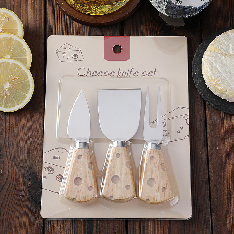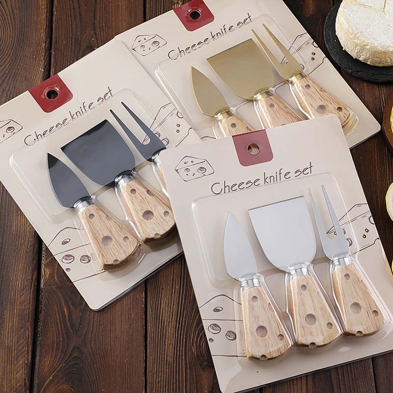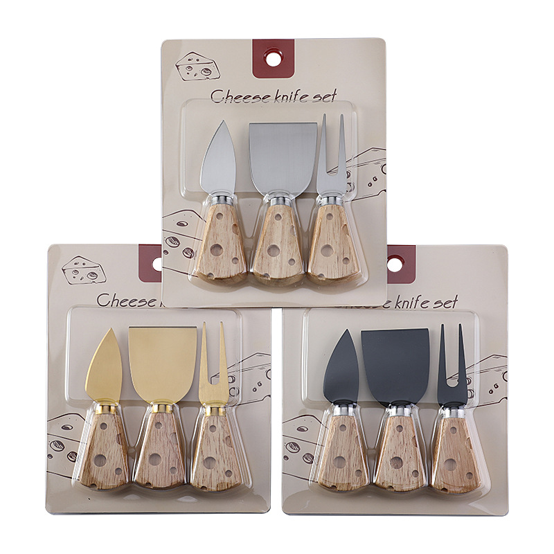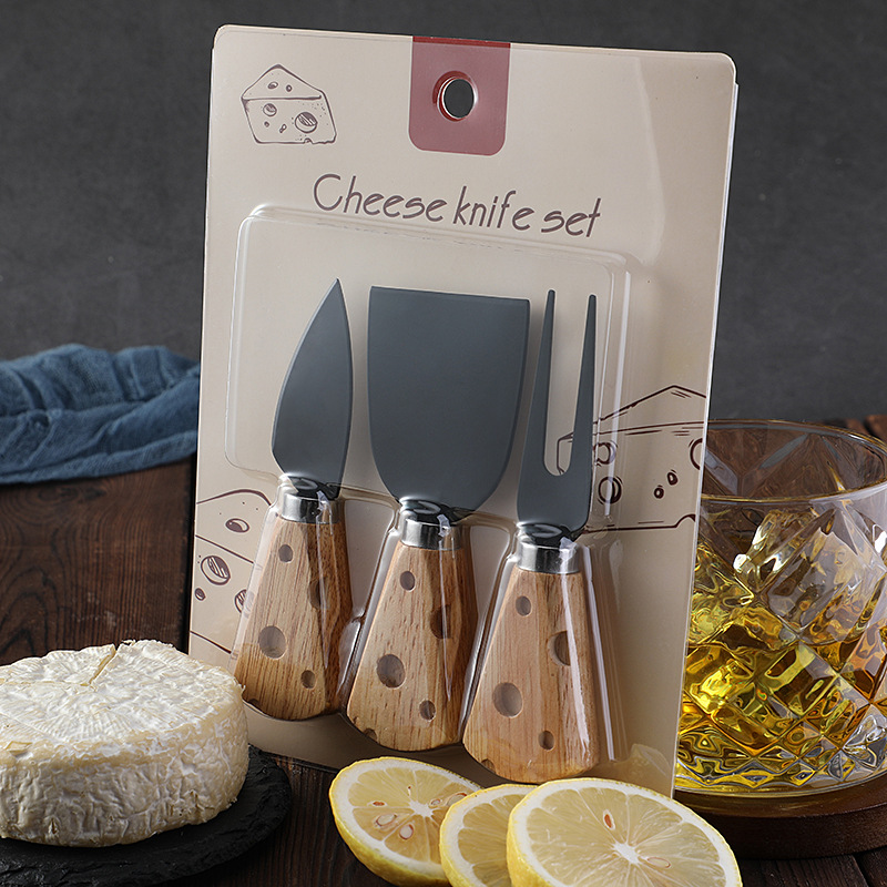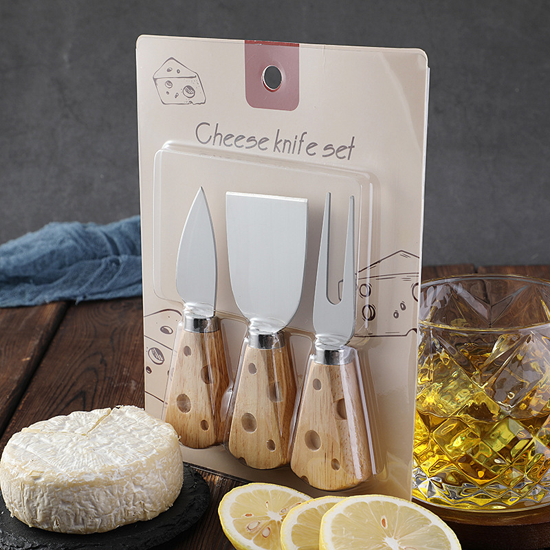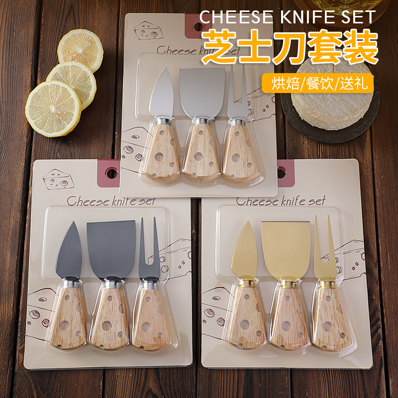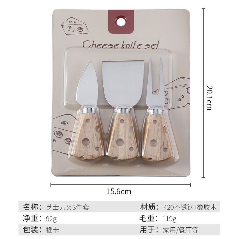 跨境现货橡胶木柄芝士刀奶酪刀套装三件套插卡包装西式餐具套装