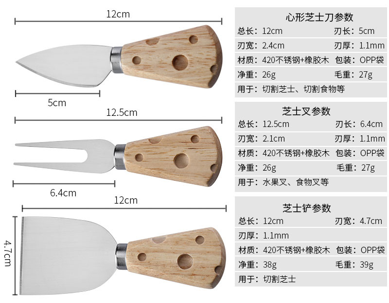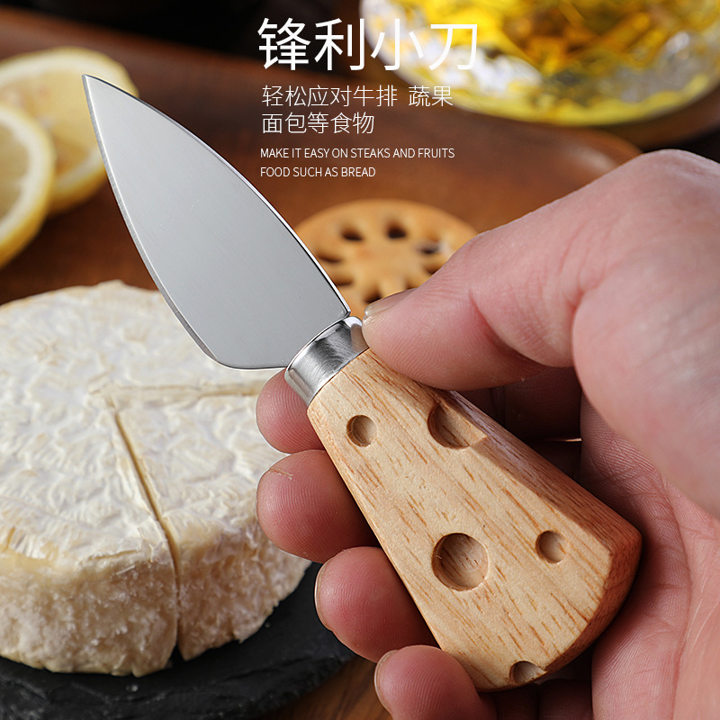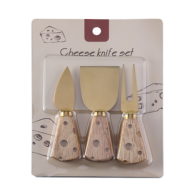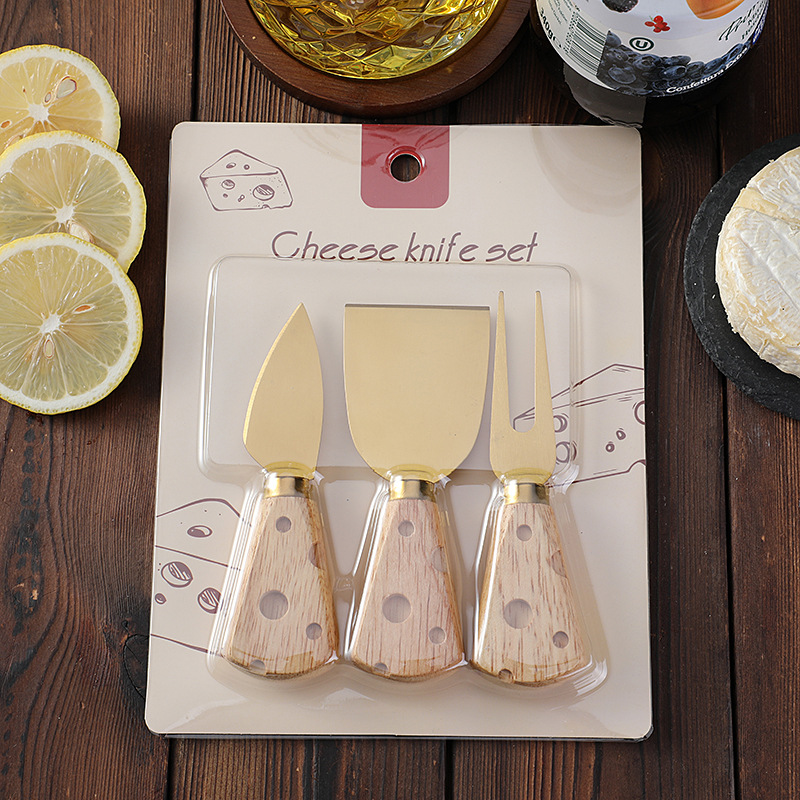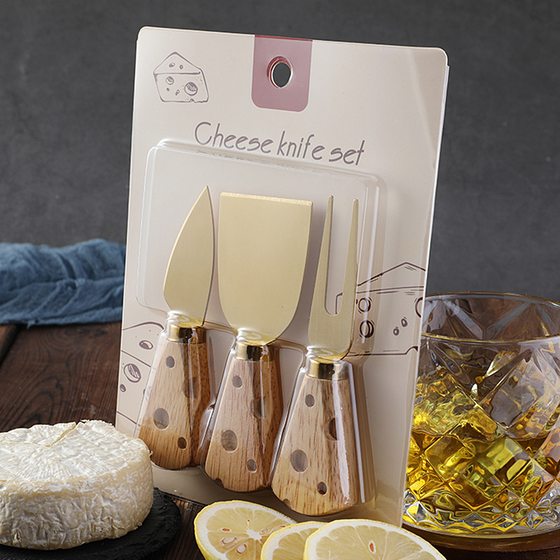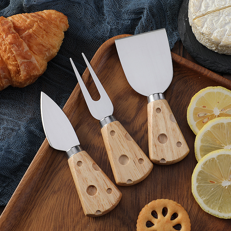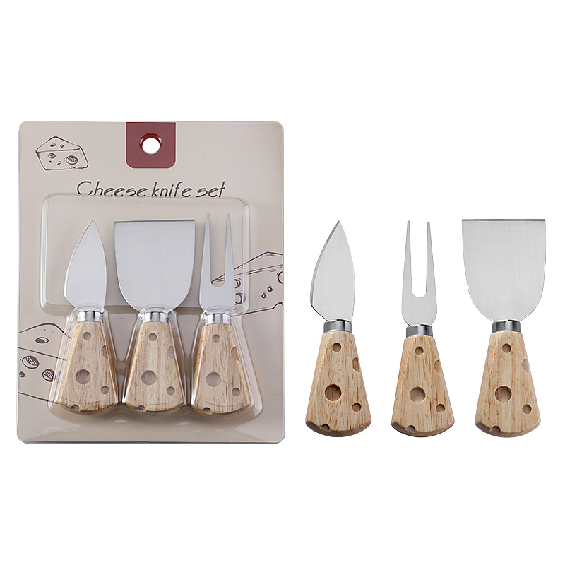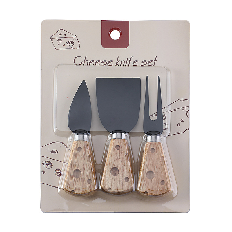跨境现货橡胶木柄芝士刀奶酪刀套装三件套插卡包装西式餐具套装