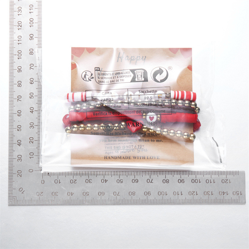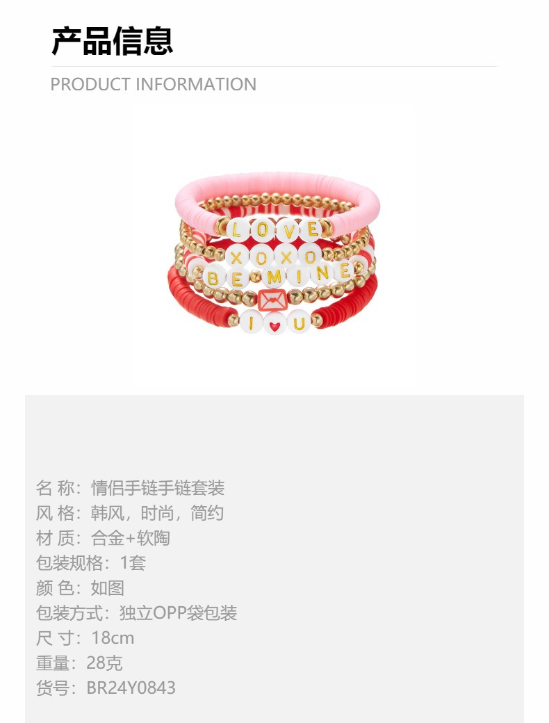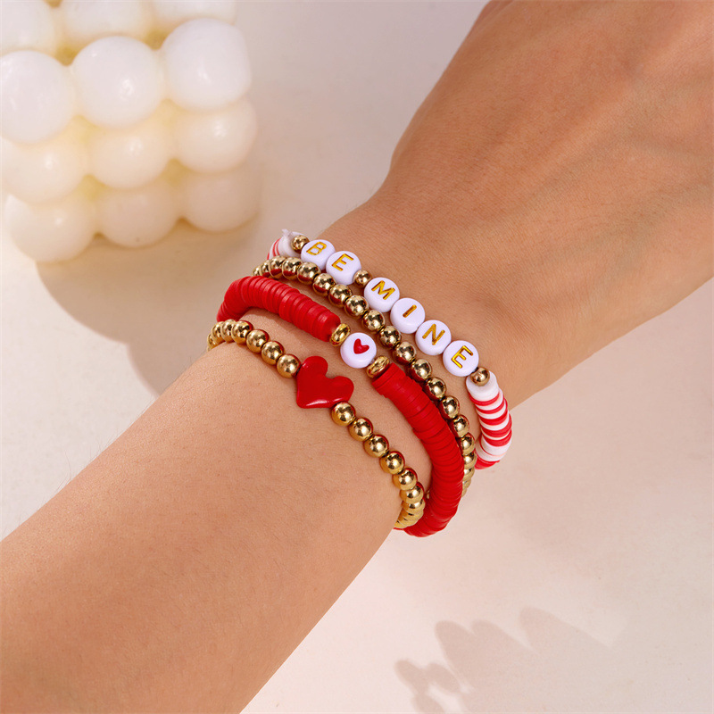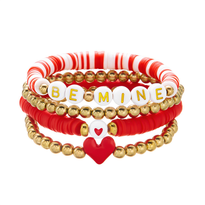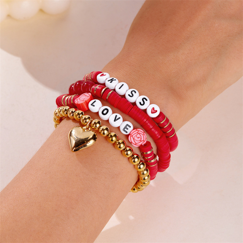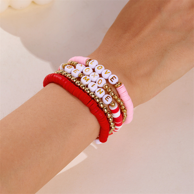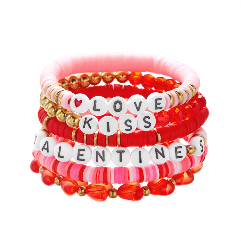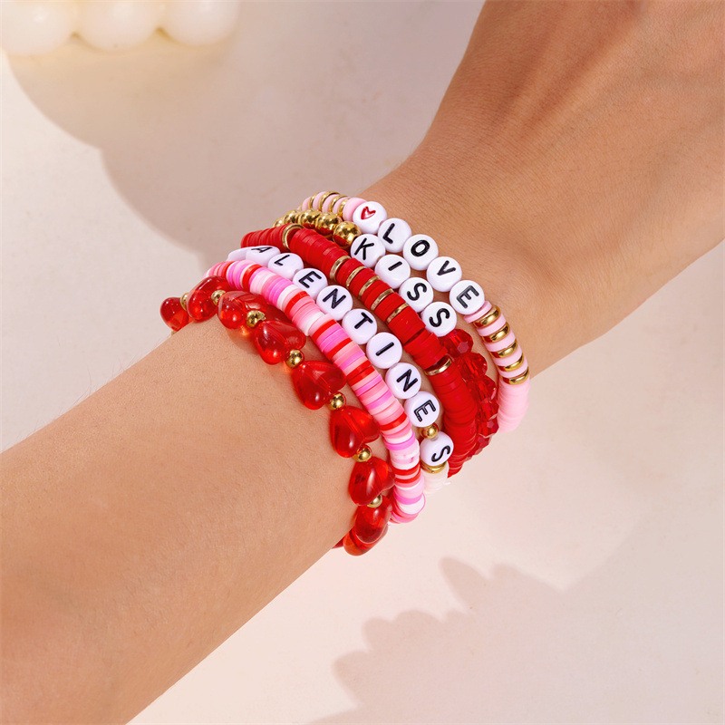 跨境新款软陶串珠弹力手链多层叠戴粉红色爱心吊坠情人节手链批发