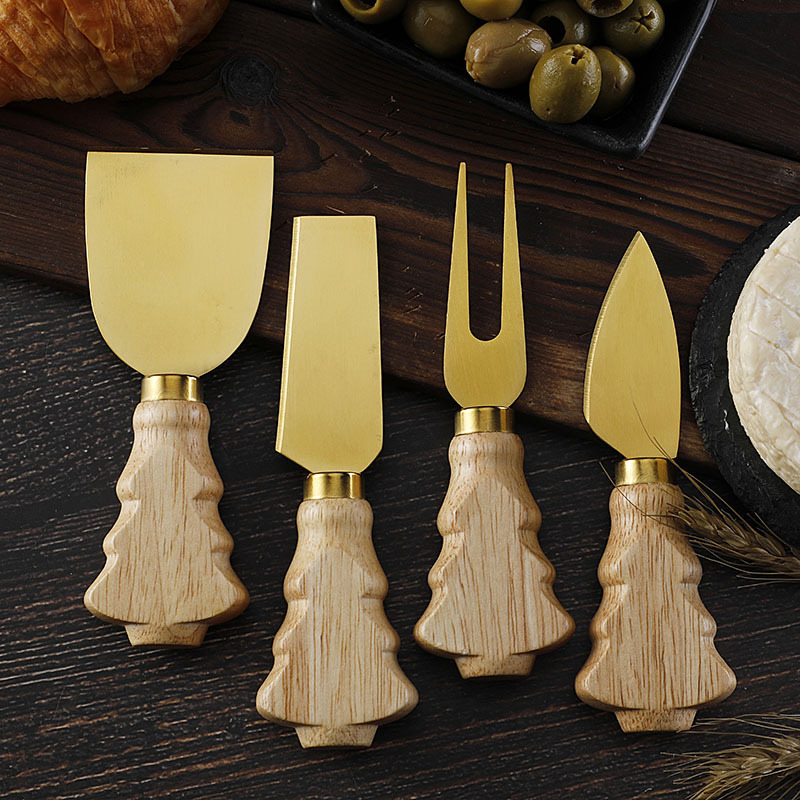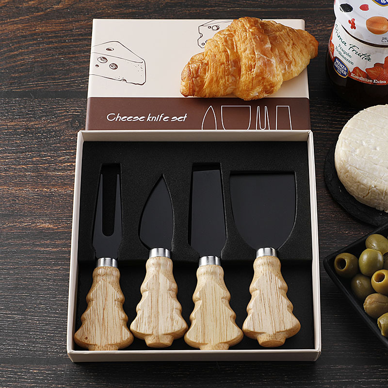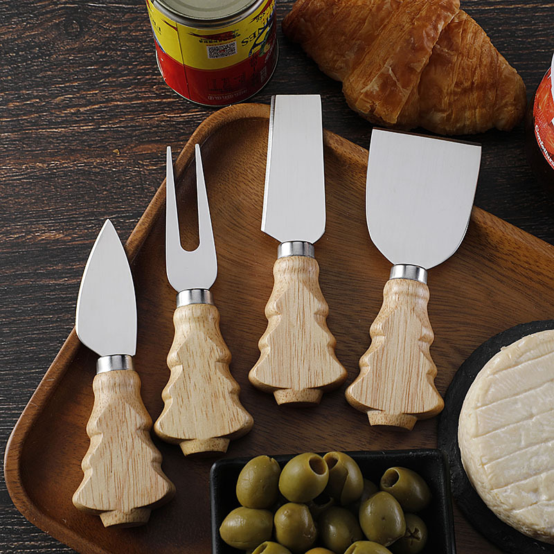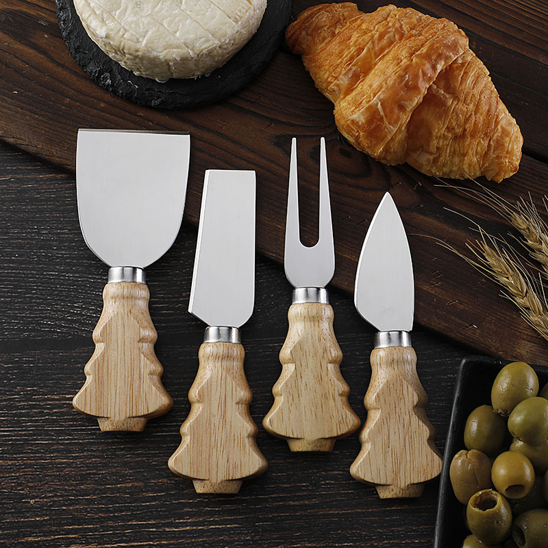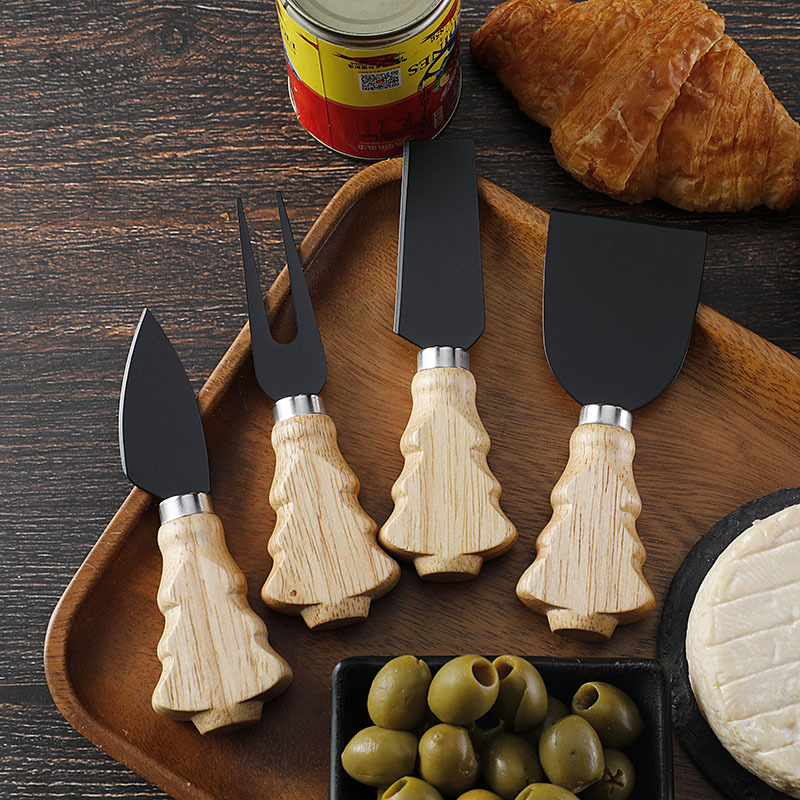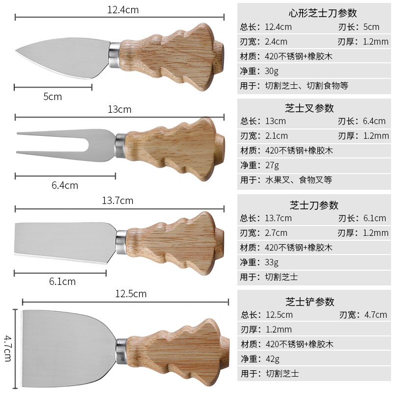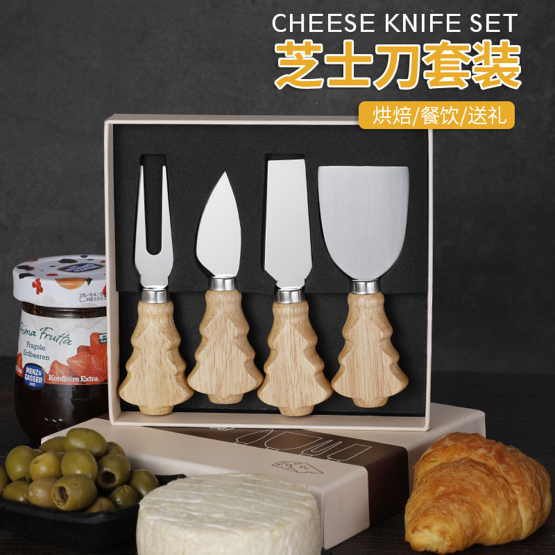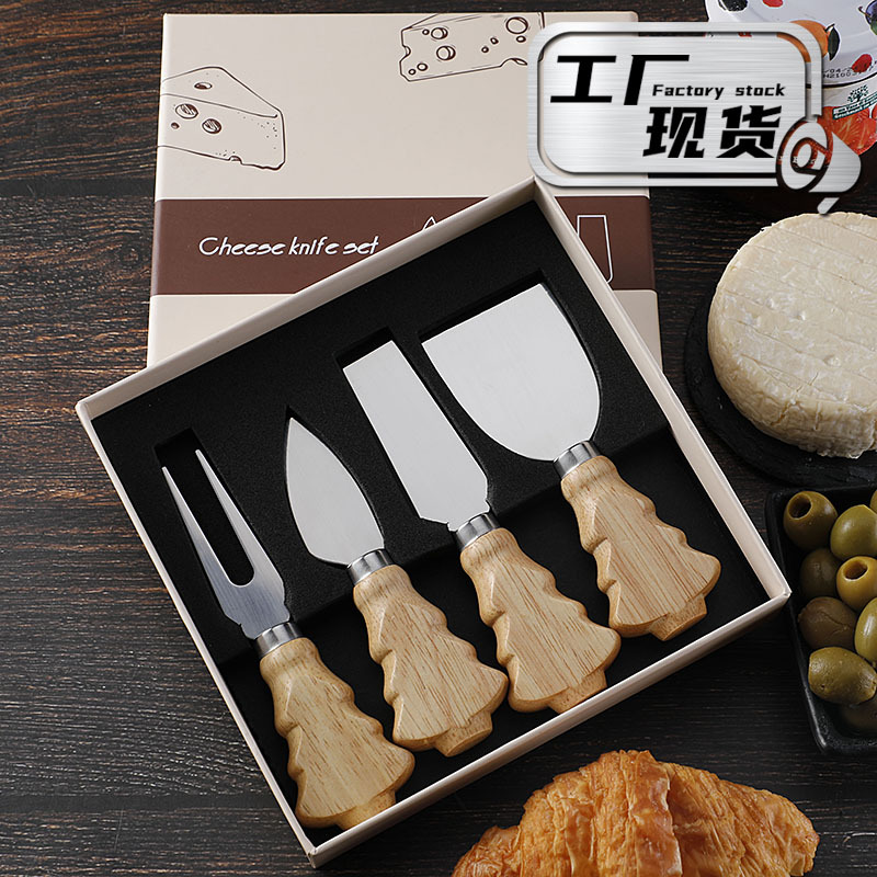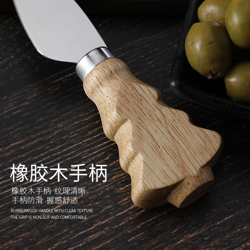 跨境刀具套装不锈钢黄油刀奶酪刀橡胶木圣诞树芝士刀套装4件套