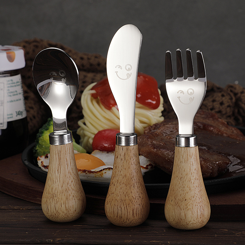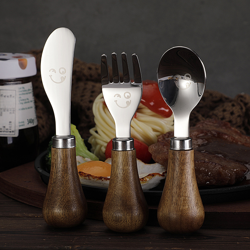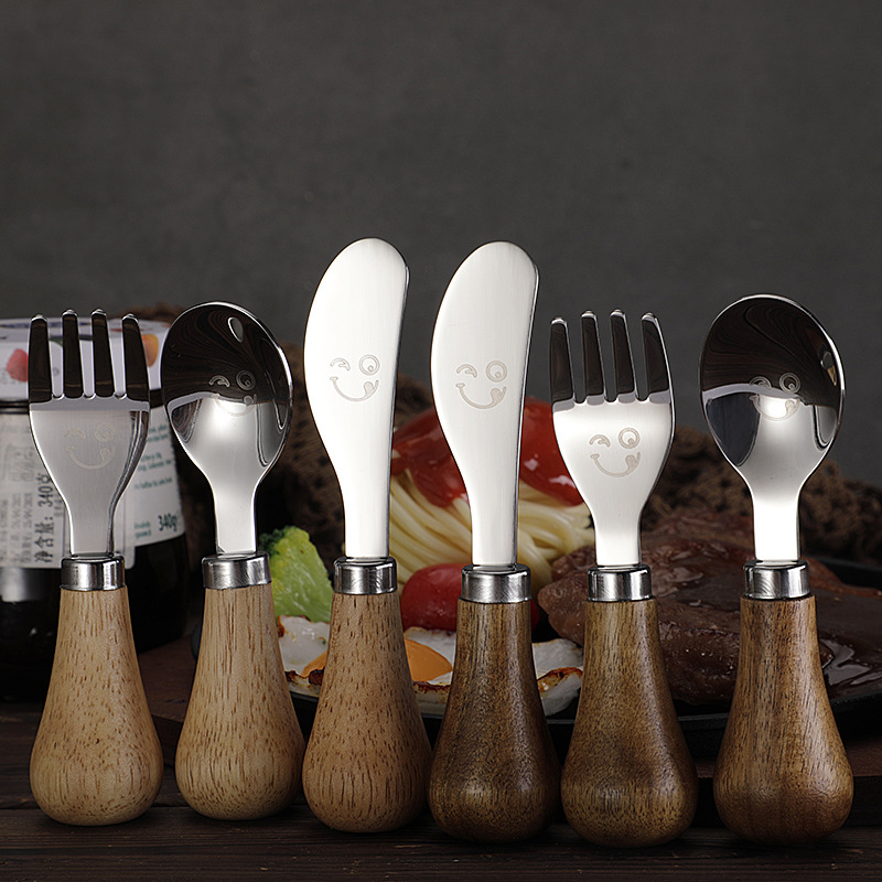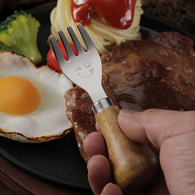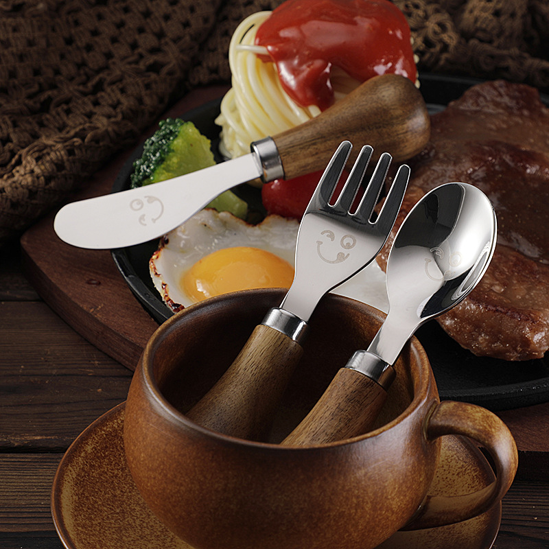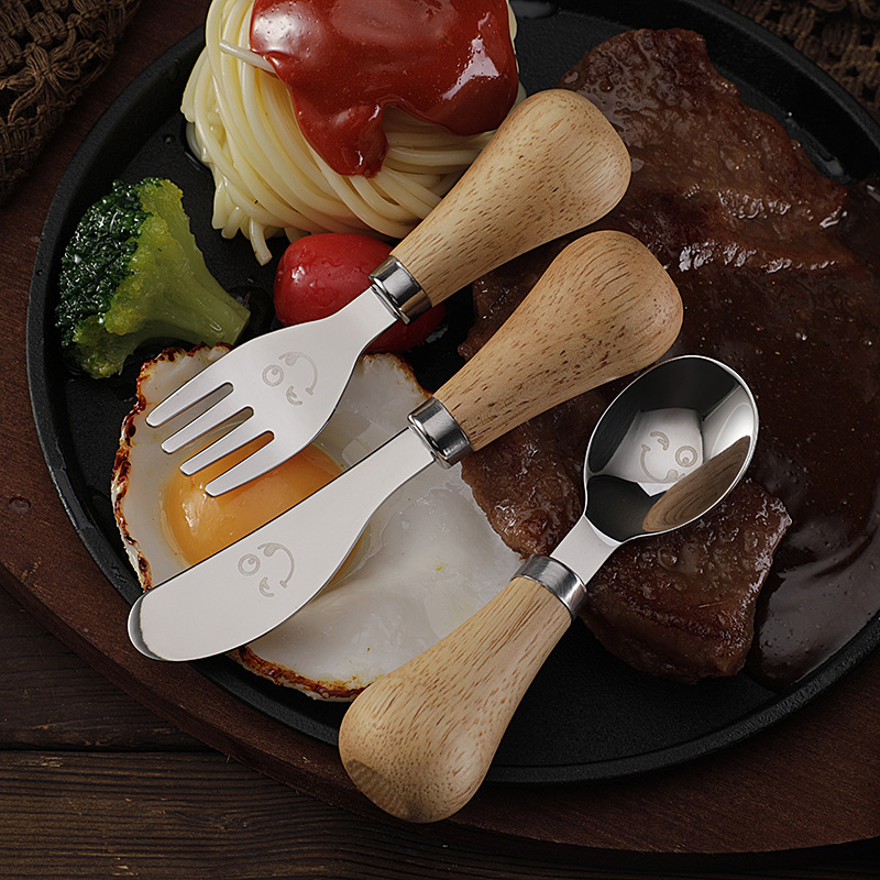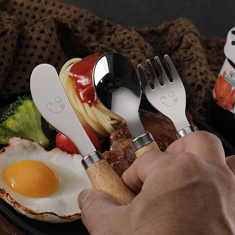 现货西餐甜品勺304不锈钢儿童笑脸餐具套装木柄可立餐勺餐叉餐刀