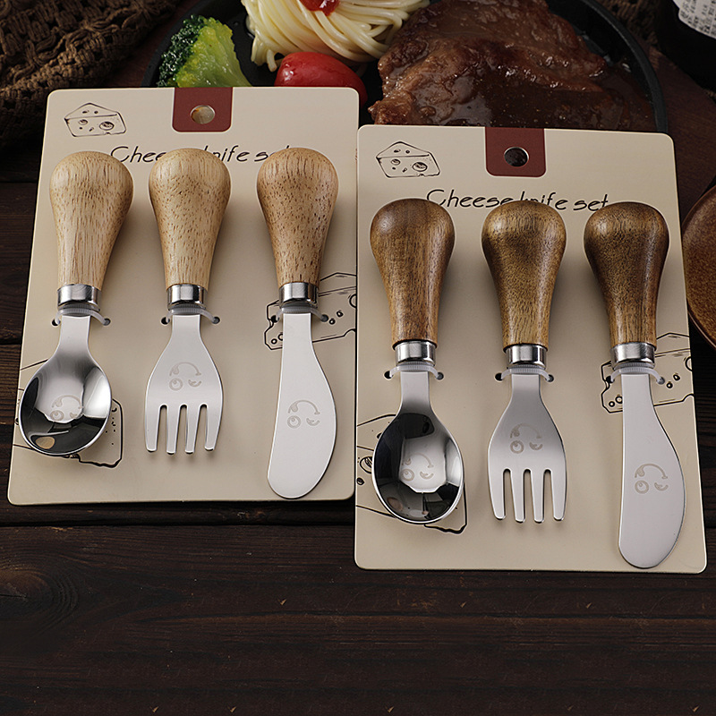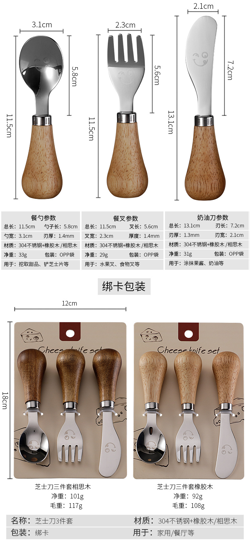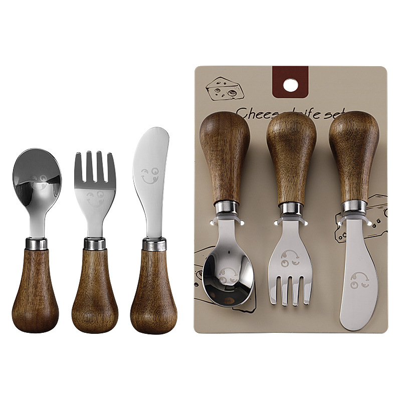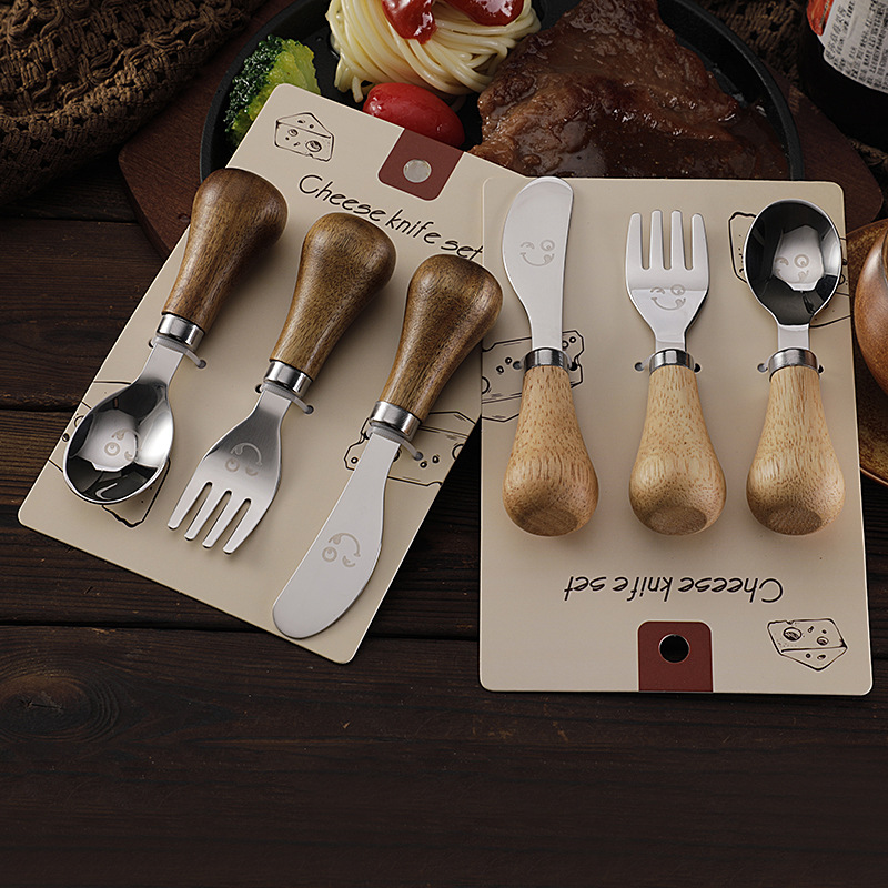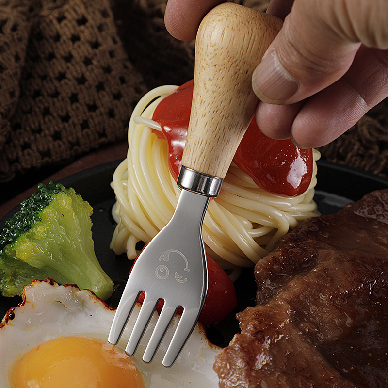 现货西餐甜品勺304不锈钢儿童笑脸餐具套装木柄可立餐勺餐叉餐刀