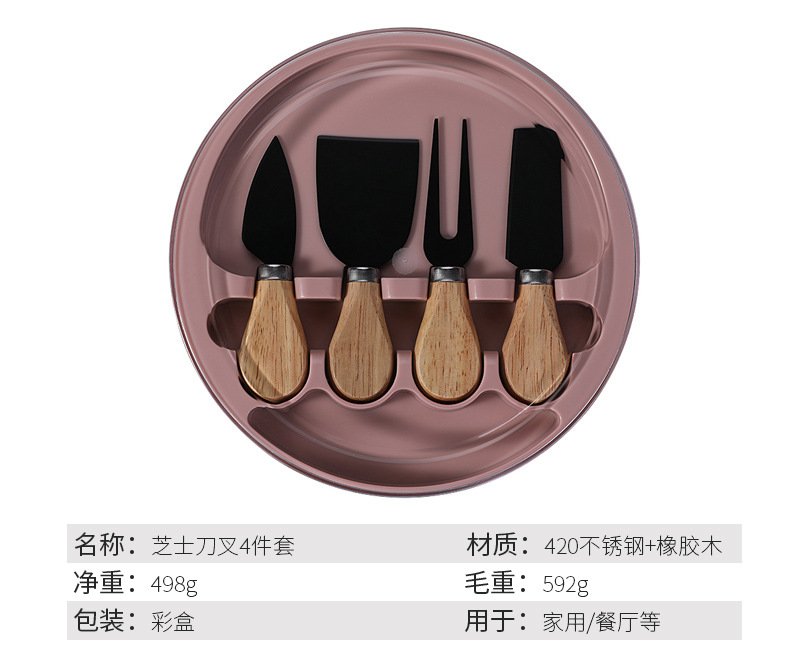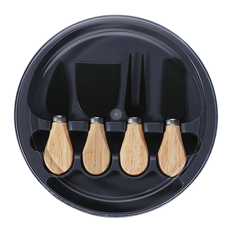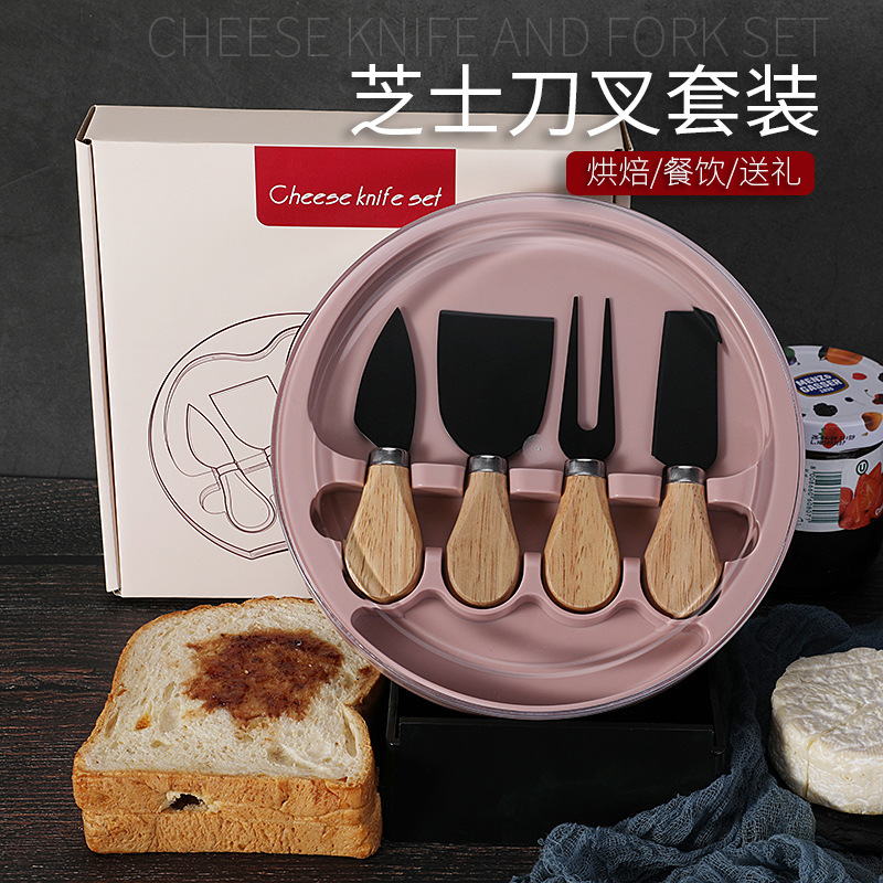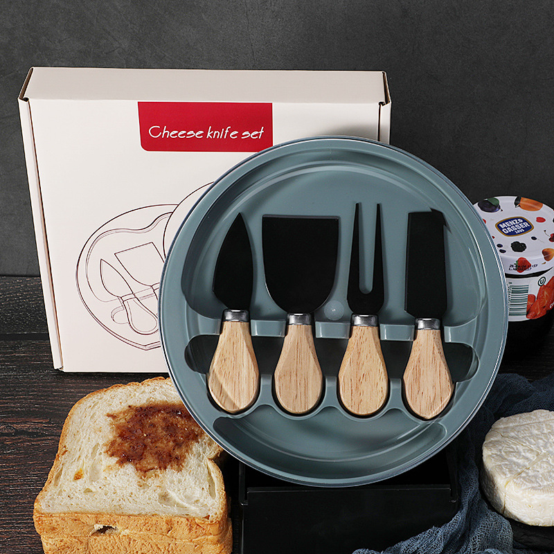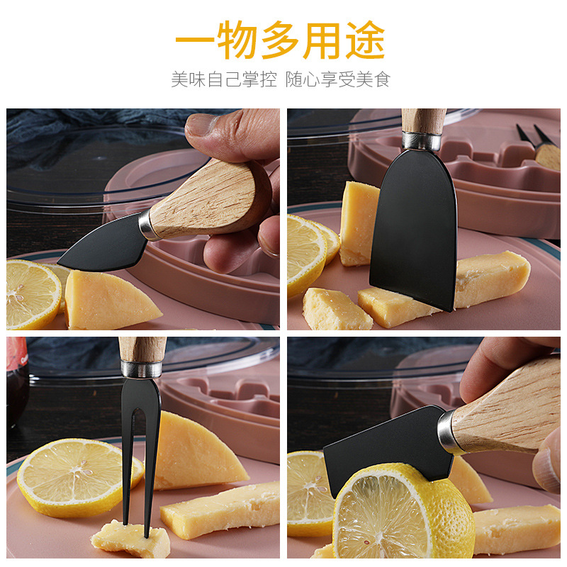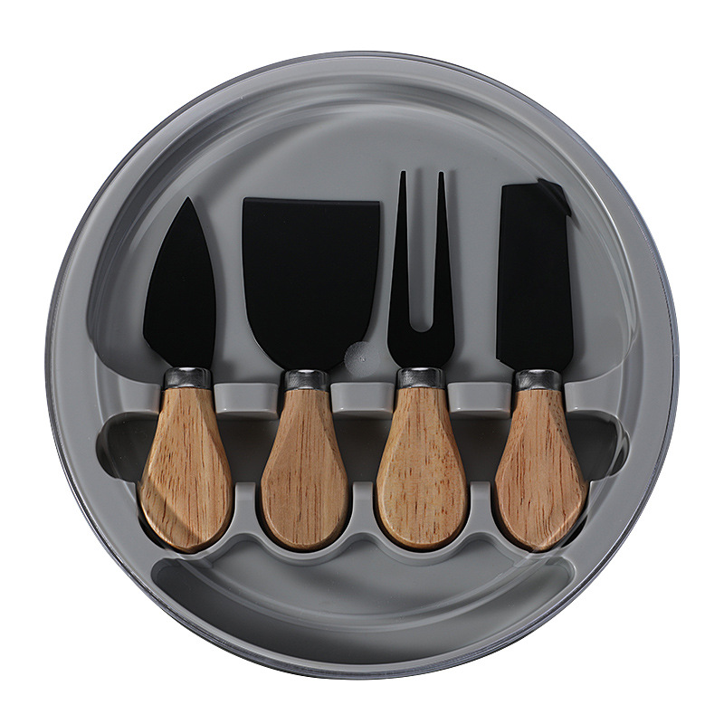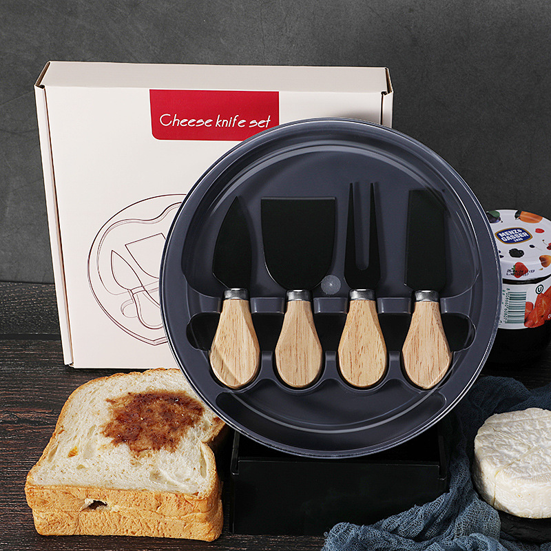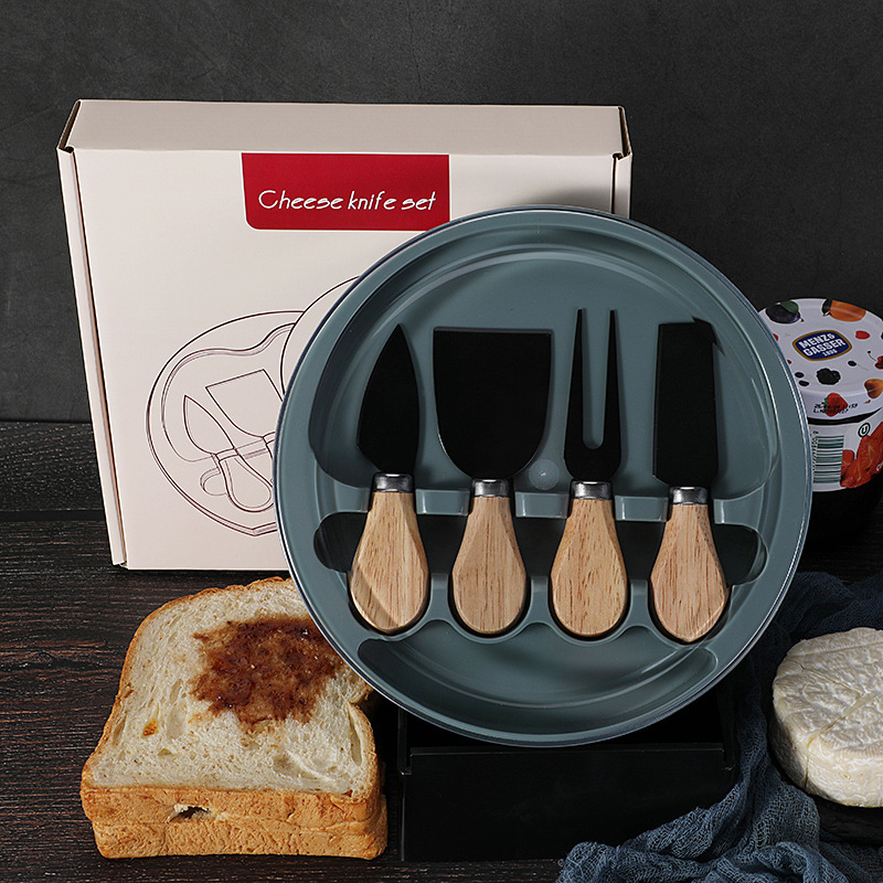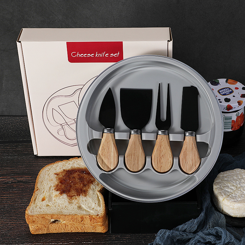创意配橡木柄奶酪刀黄油黑色不锈钢盒装4件套芝士刀套装蛋糕