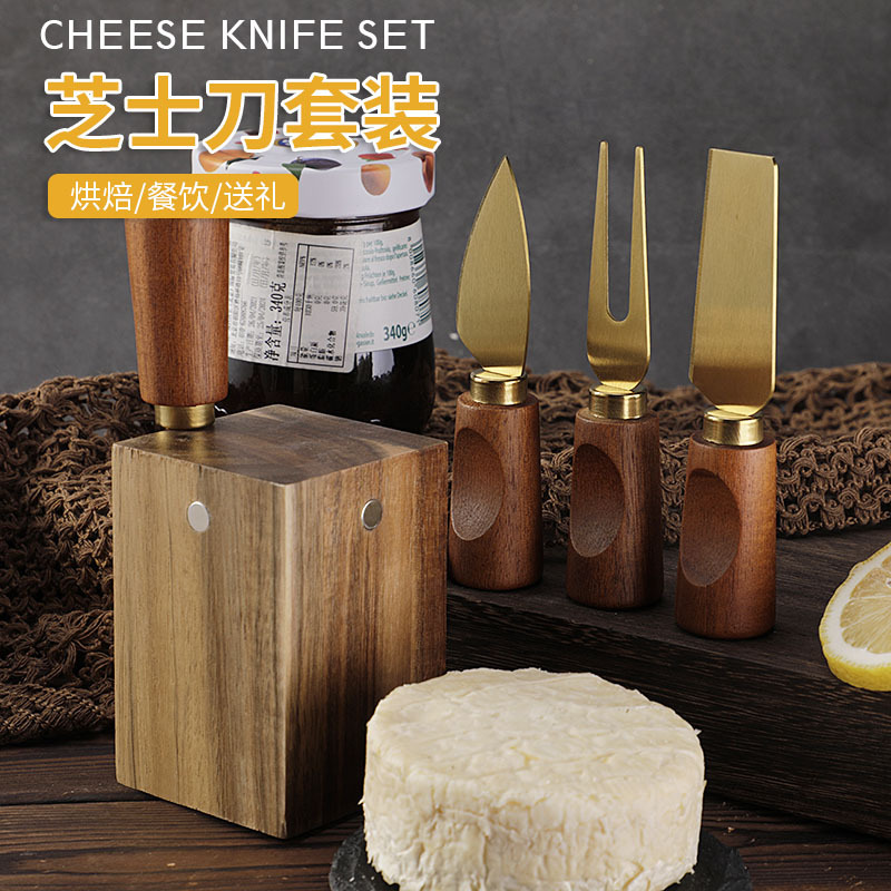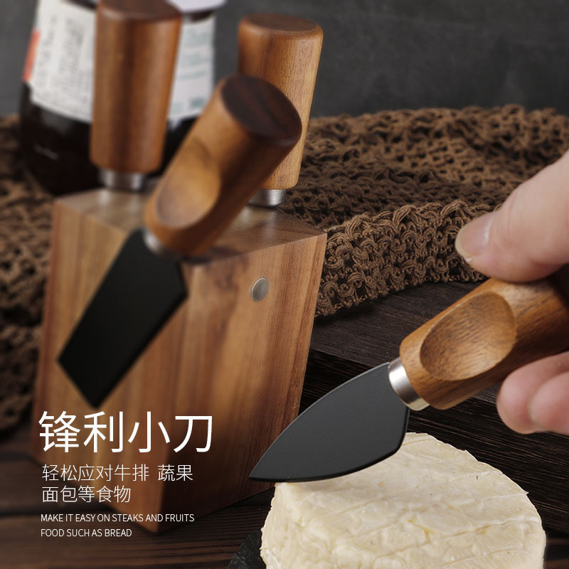 工厂现货相思木座奶酪刀套装不锈钢芝士刀叉铲黄油刀芝士刀5件套