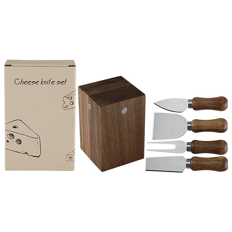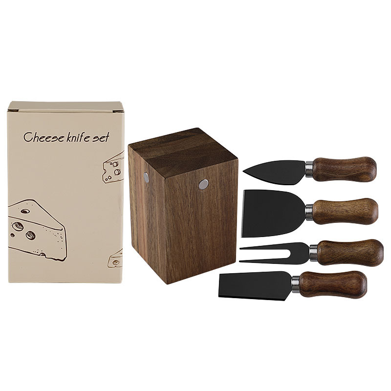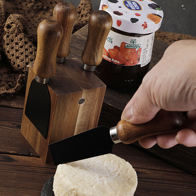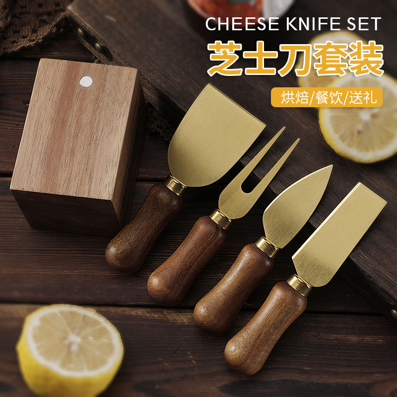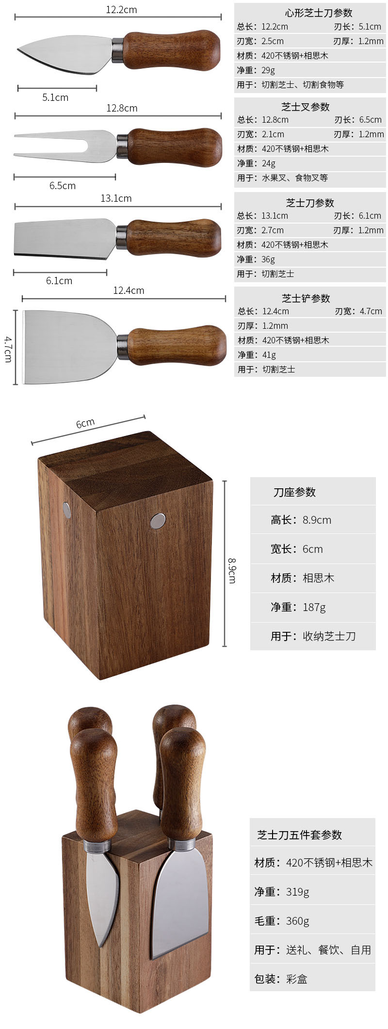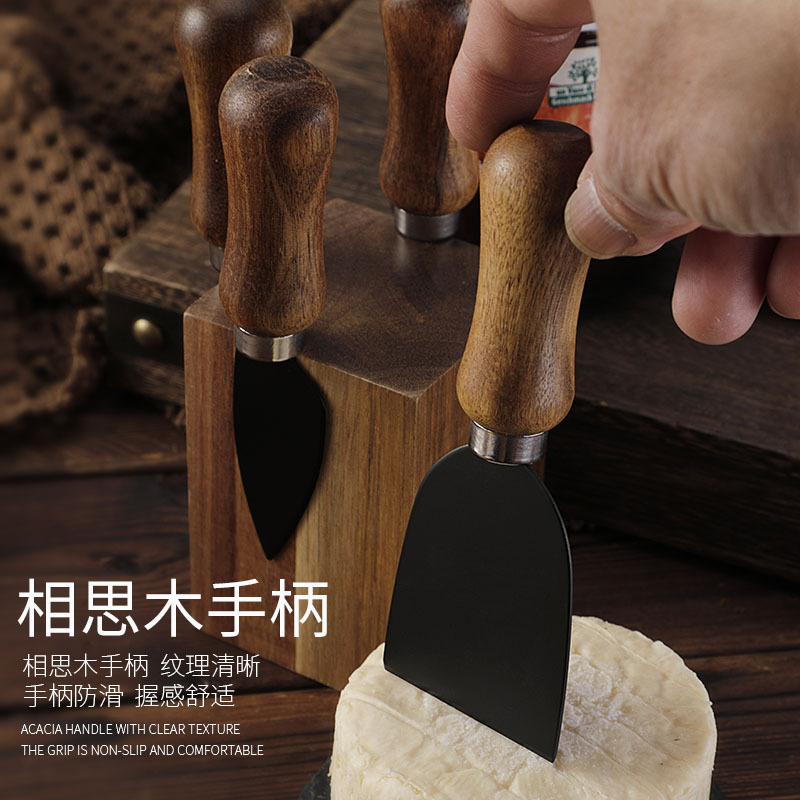 跨境现货磁吸相思木座芝士刀五件套不锈钢奶酪芝士刀叉套装芝士铲