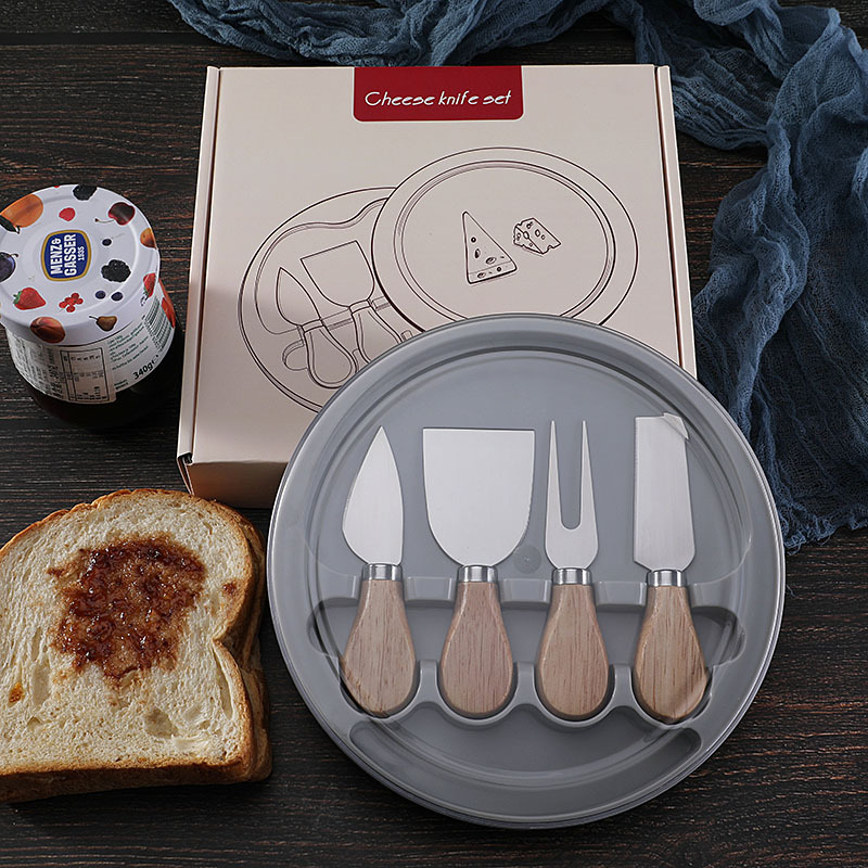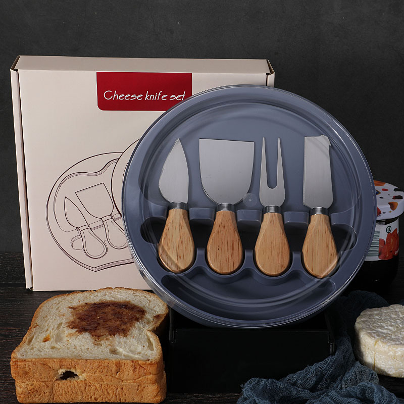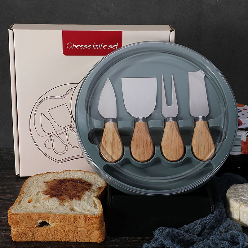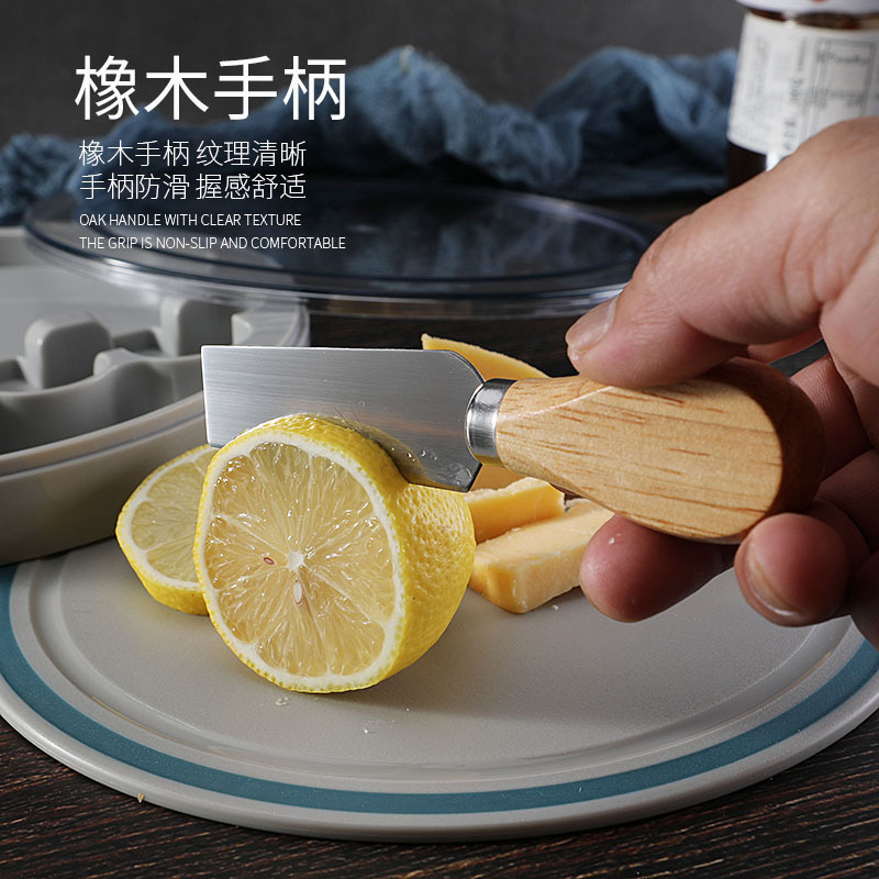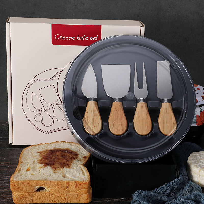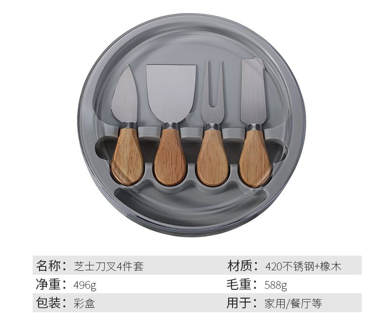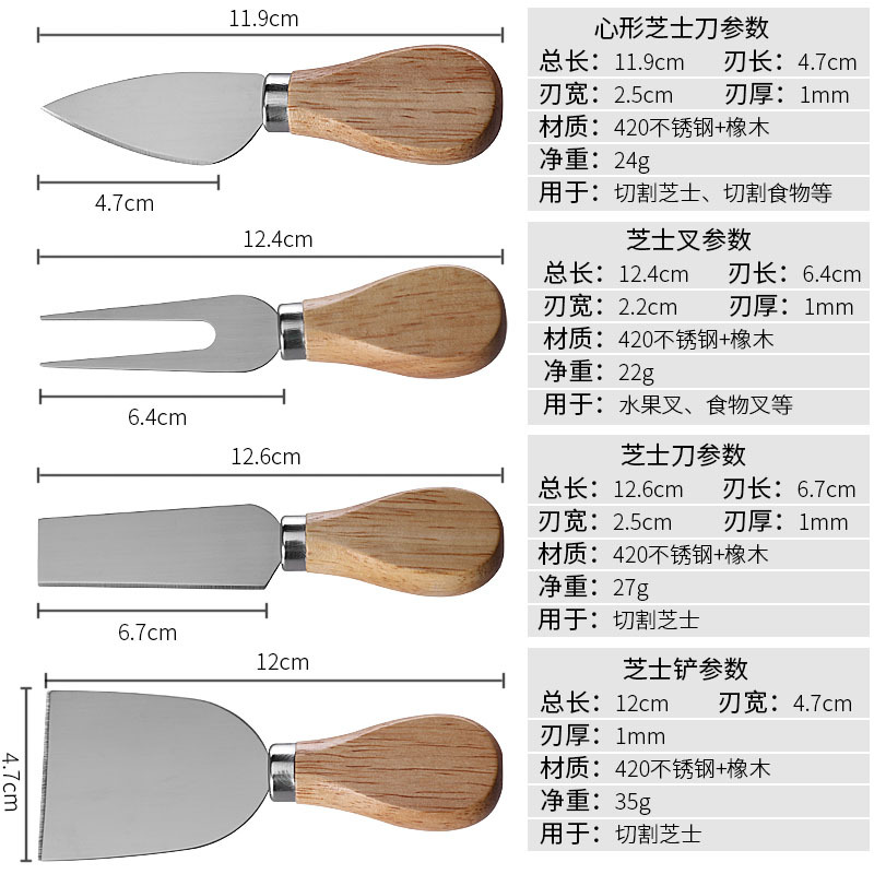 新款盒装4件套奶油奶酪刀叉套装不锈钢芝士工具橡木柄芝士刀配
