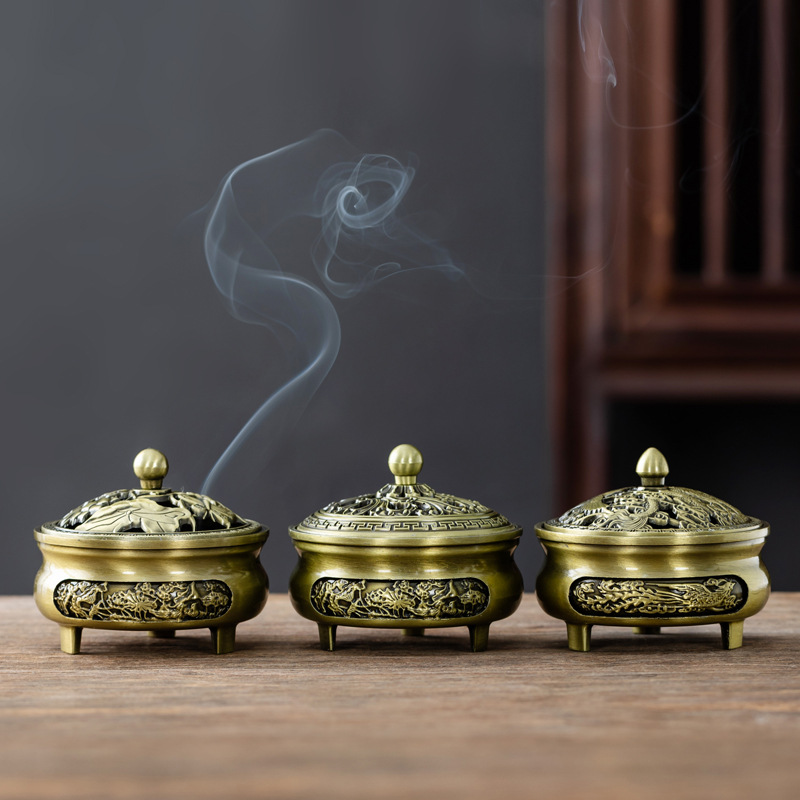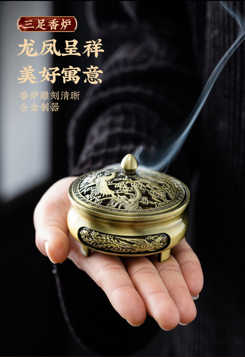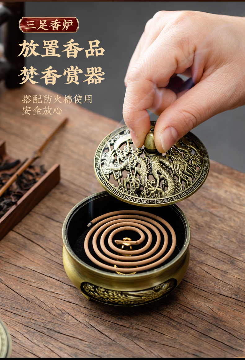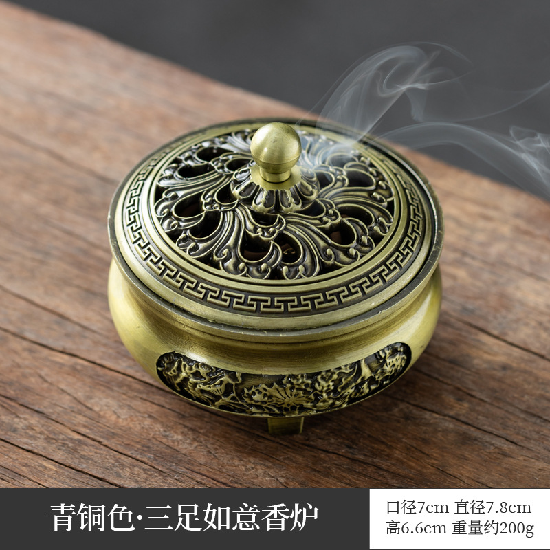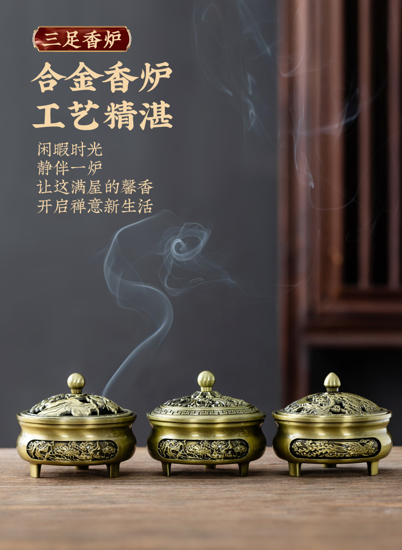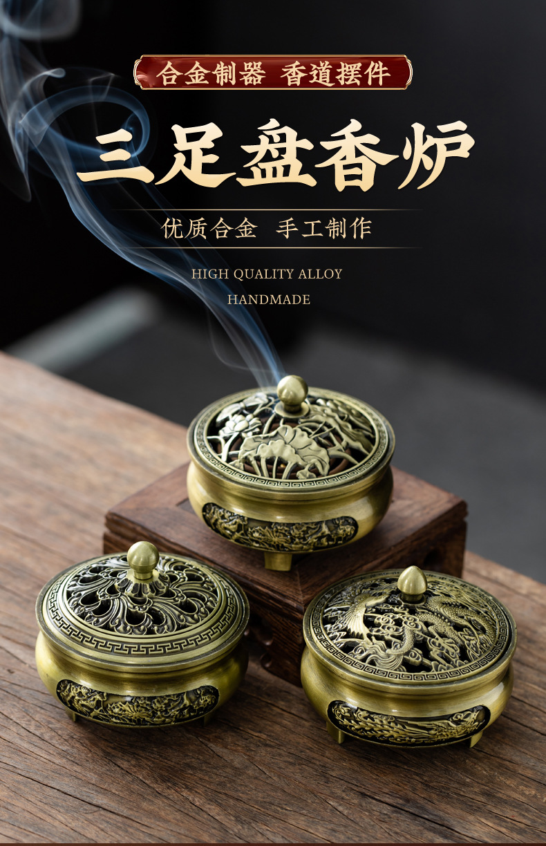 仿古合金三足雕花盘香炉家用室内香薰炉摆件禅意茶道檀香香炉批发