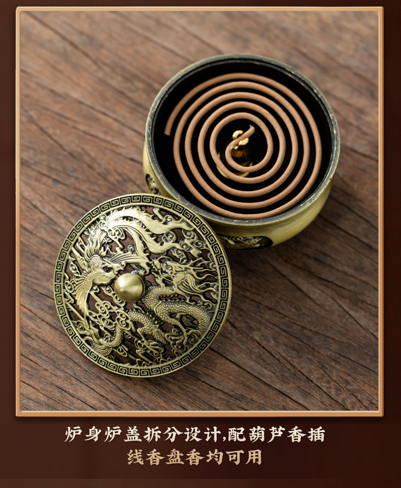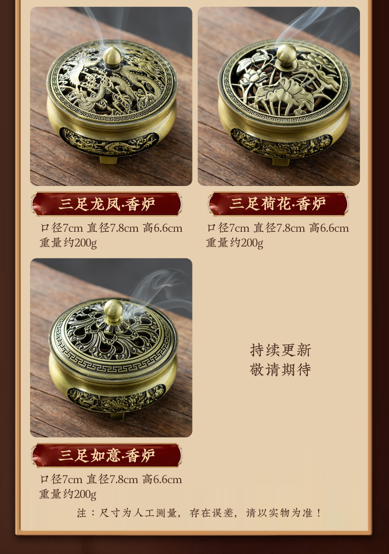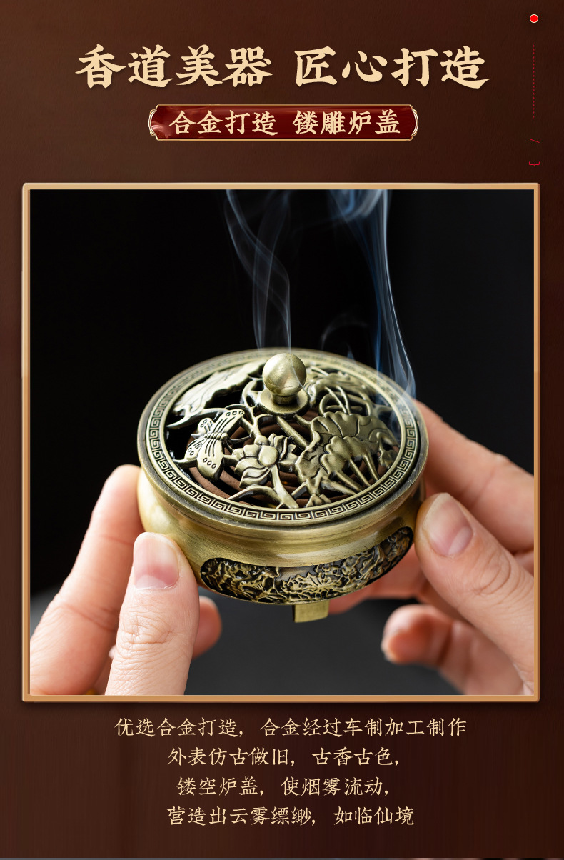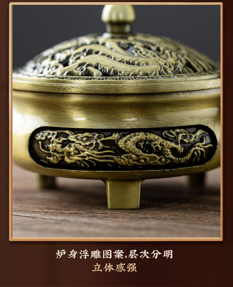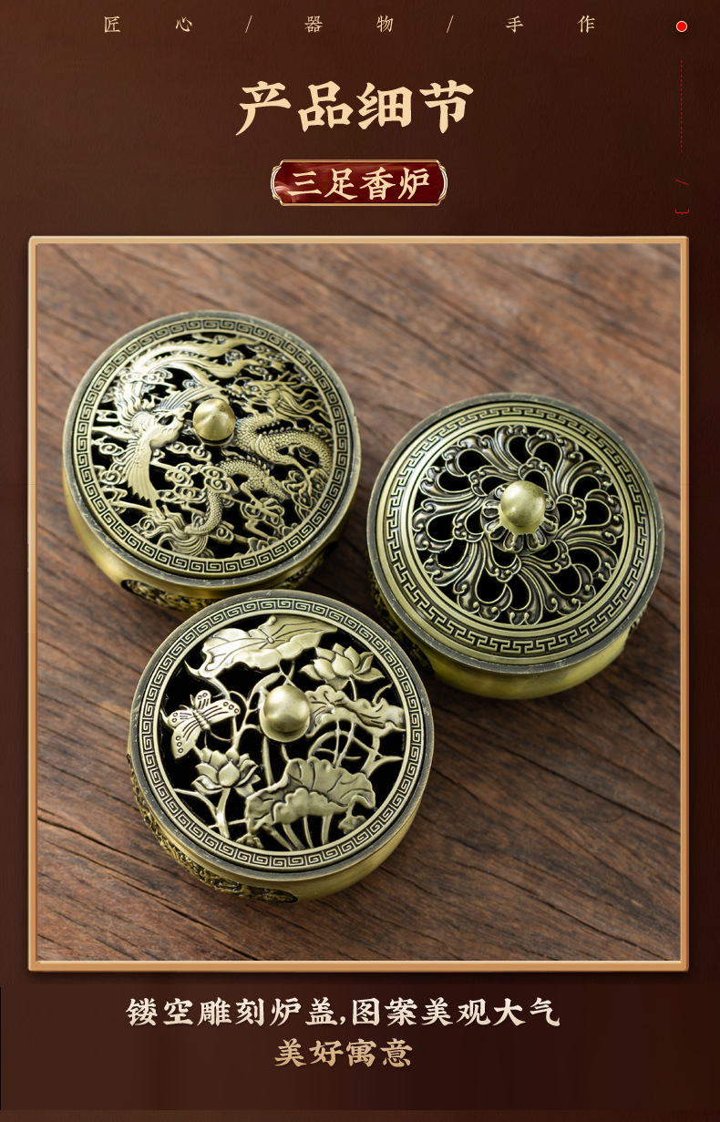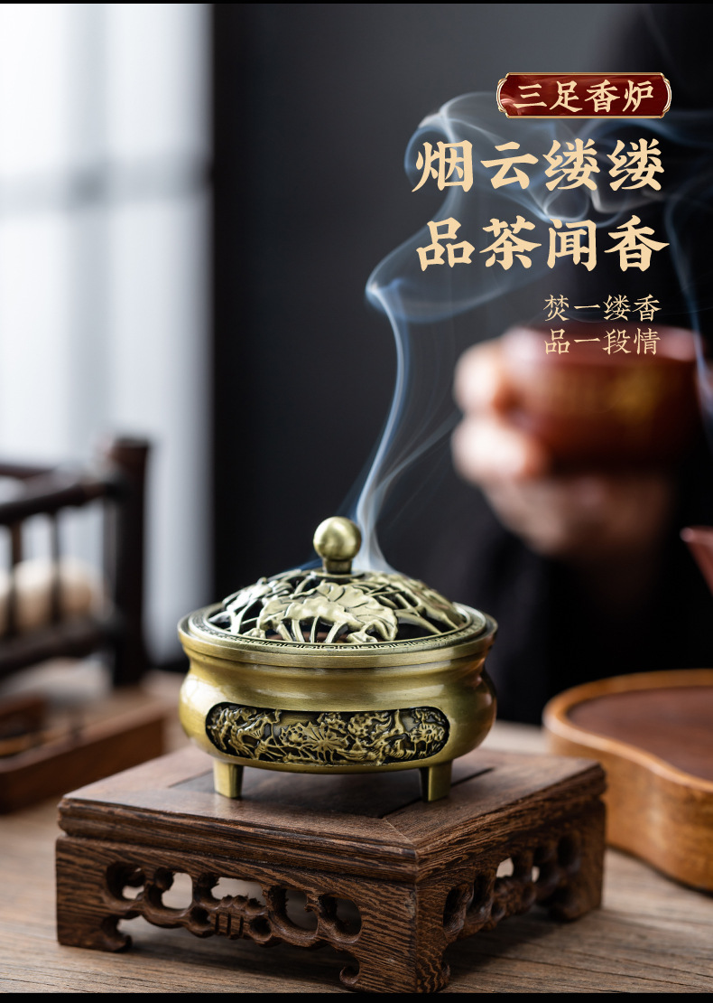 仿古合金三足雕花盘香炉家用室内香薰炉摆件禅意茶道檀香香炉批发