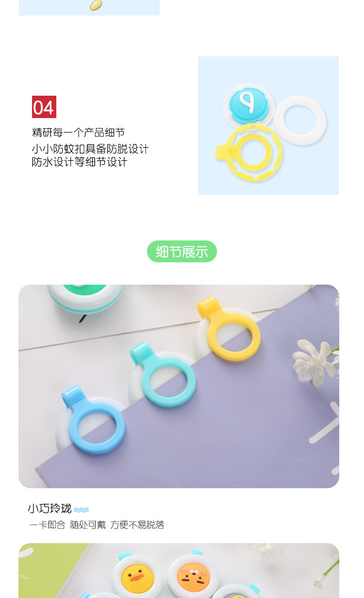 | solid essential oil mosquito repellent buckle(固体精油驱蚊扣) | USD $0.0 | 343080 piece available |