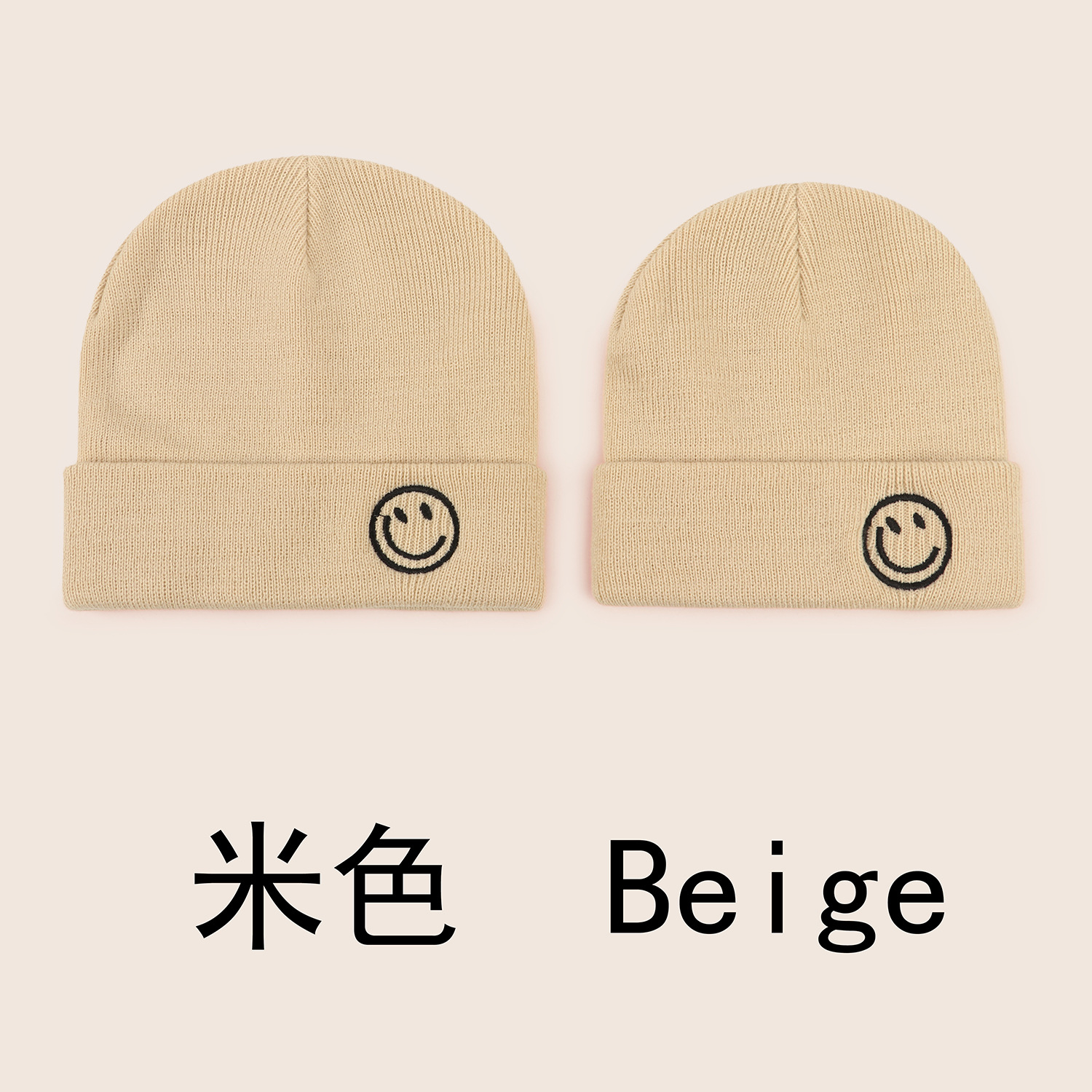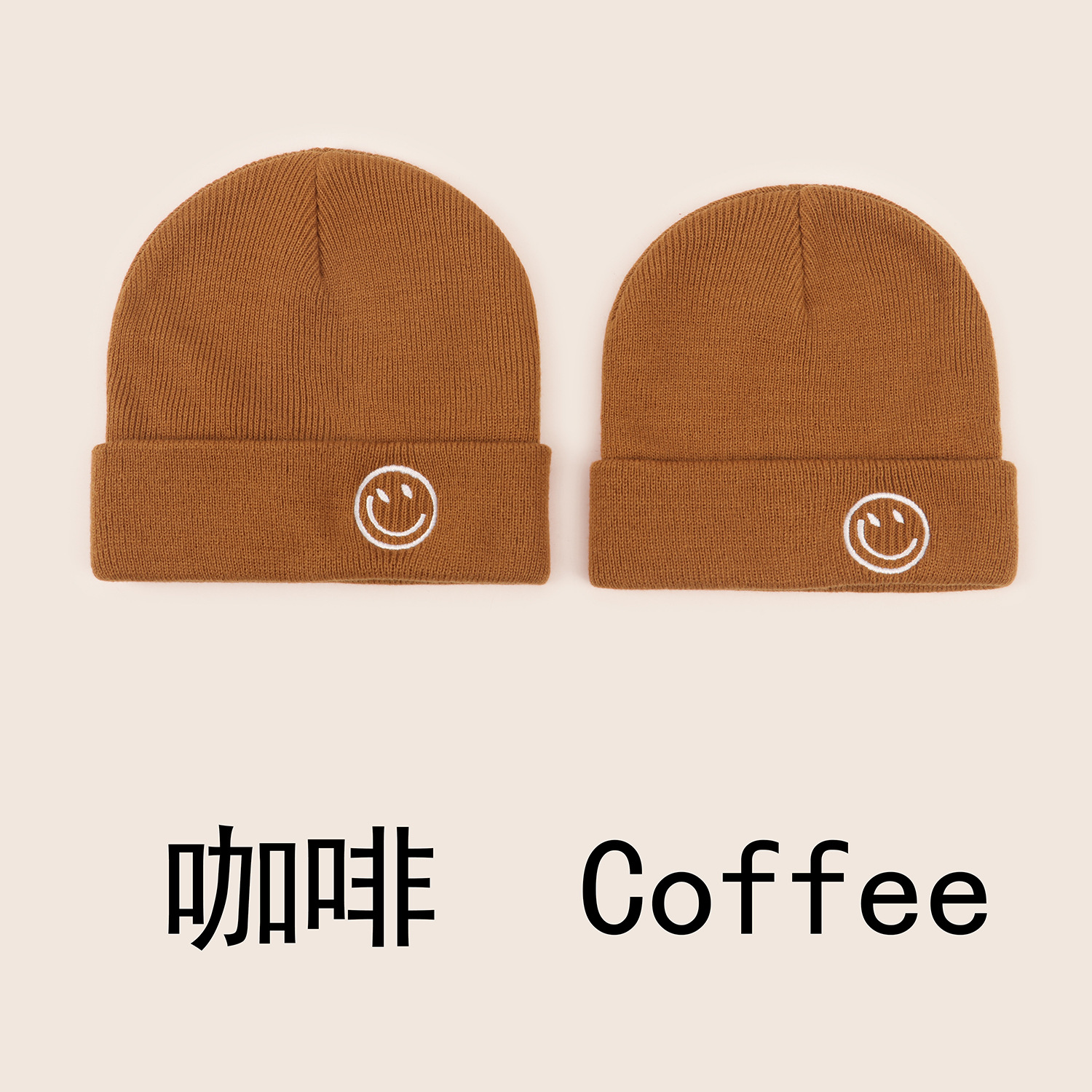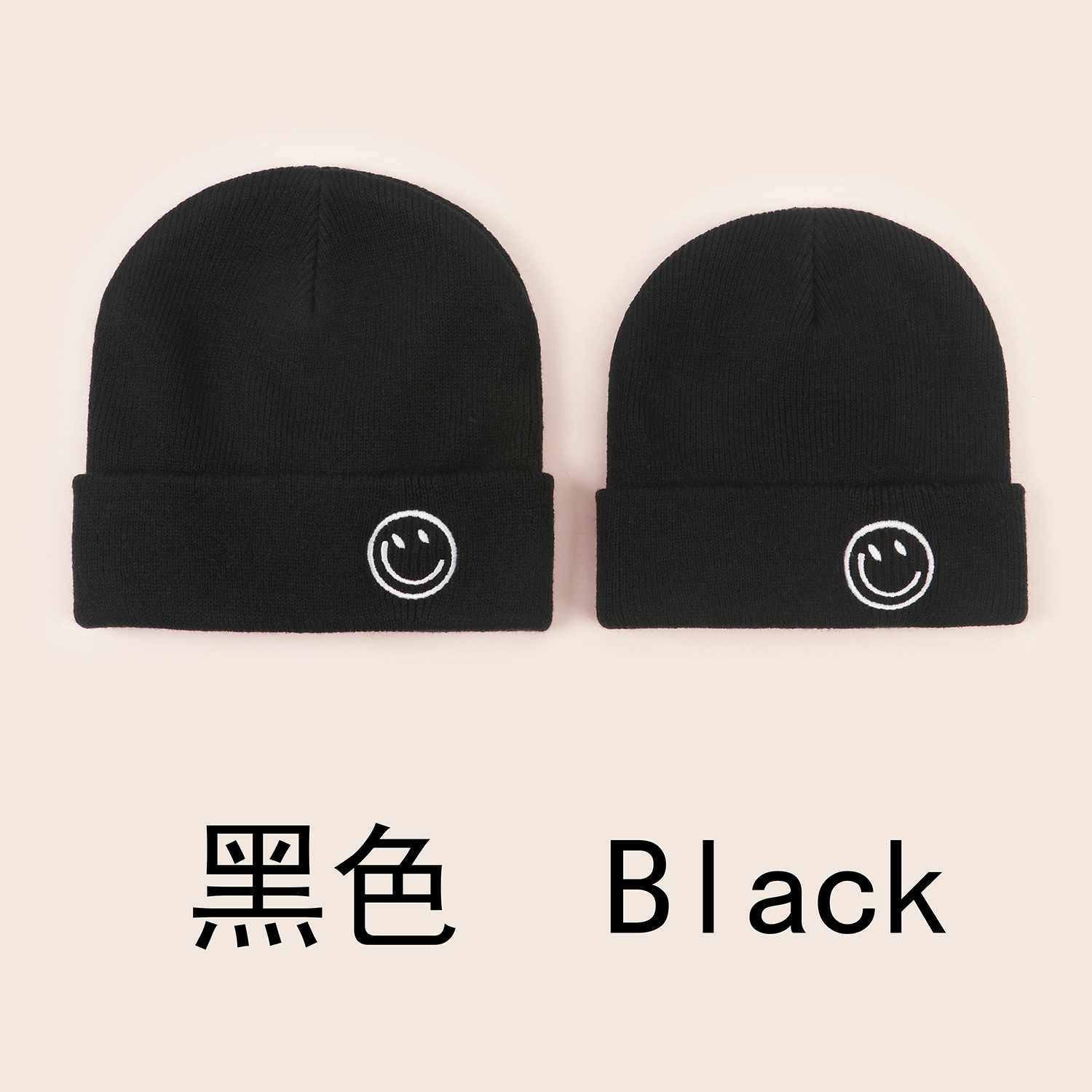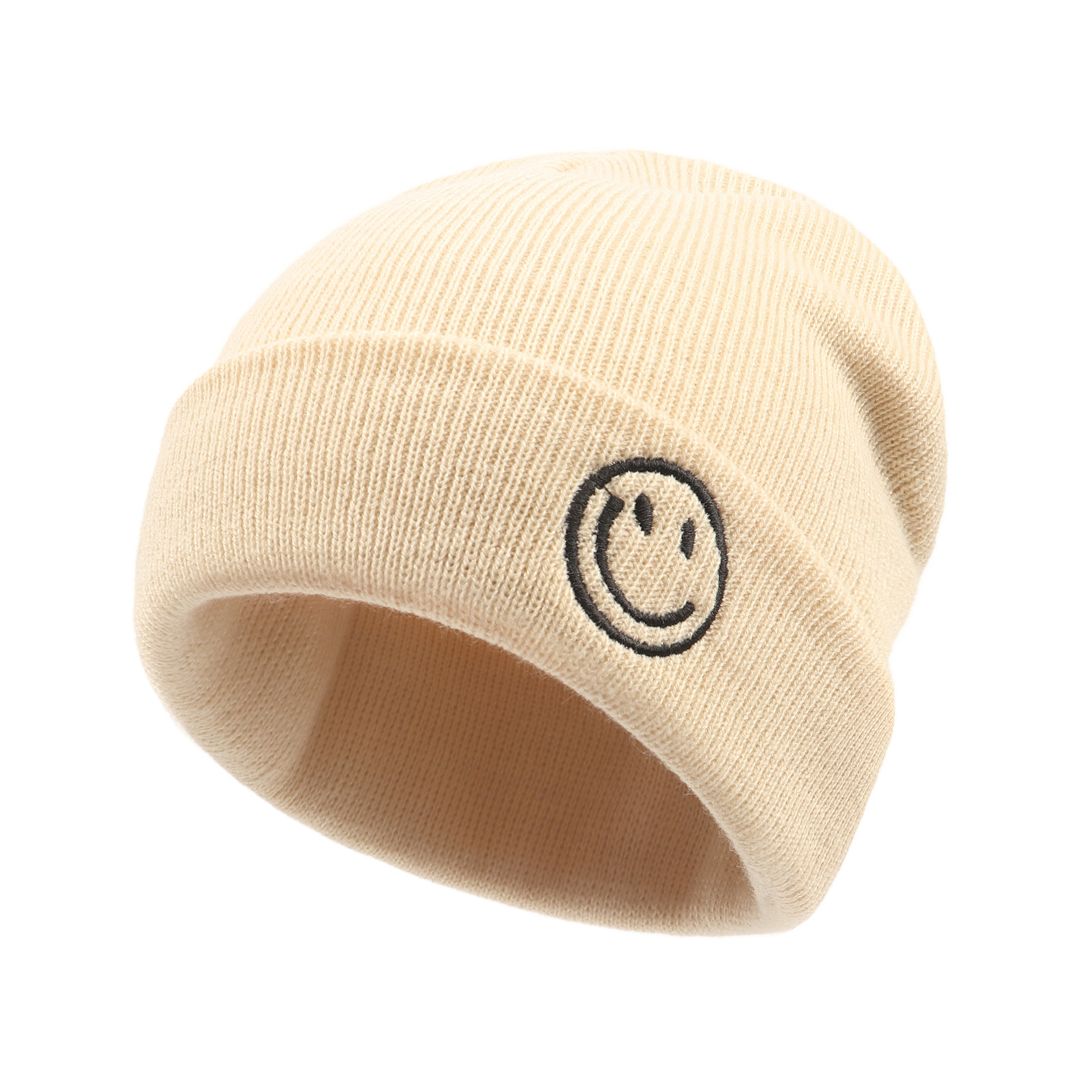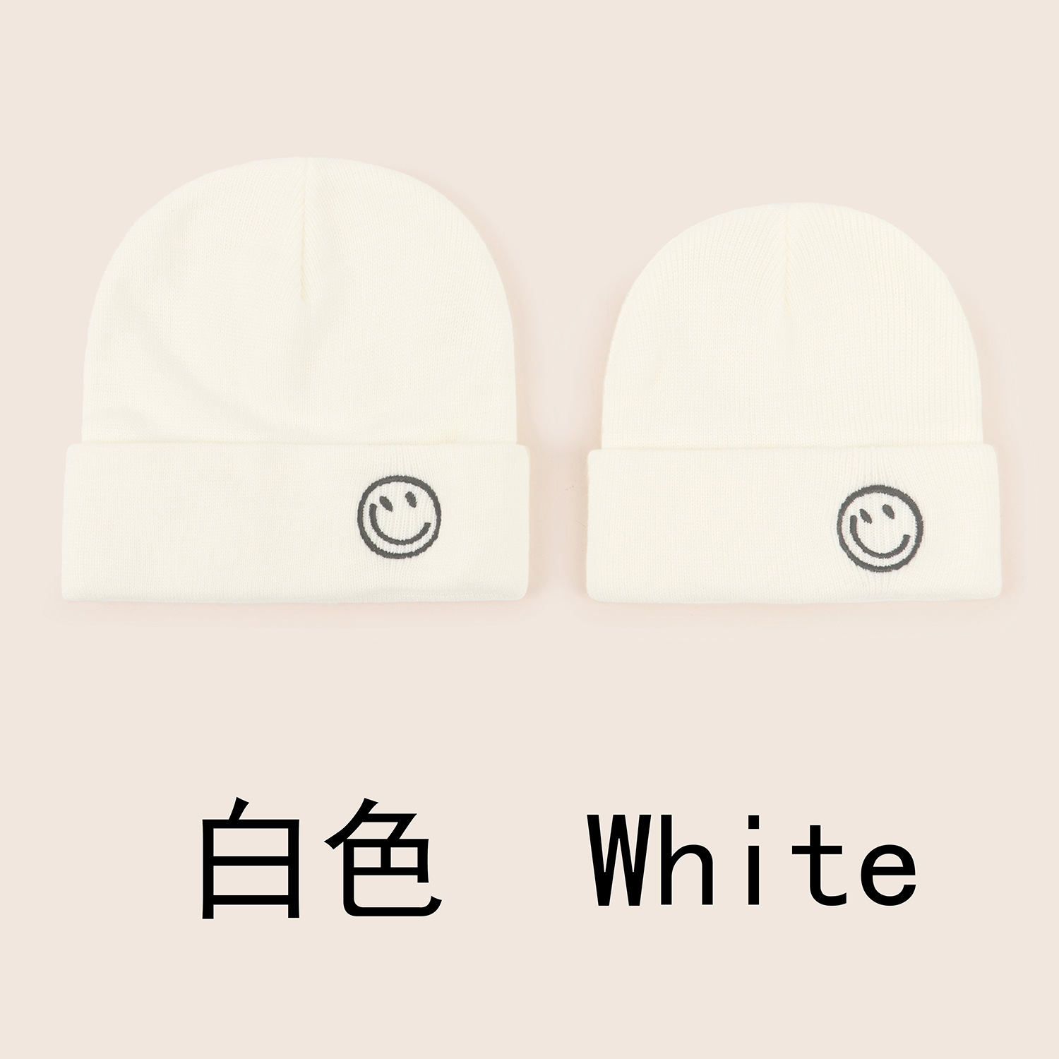 跨境热卖笑脸刺绣秋冬保暖护耳针织帽男女宝宝儿童圆顶毛线帽批发