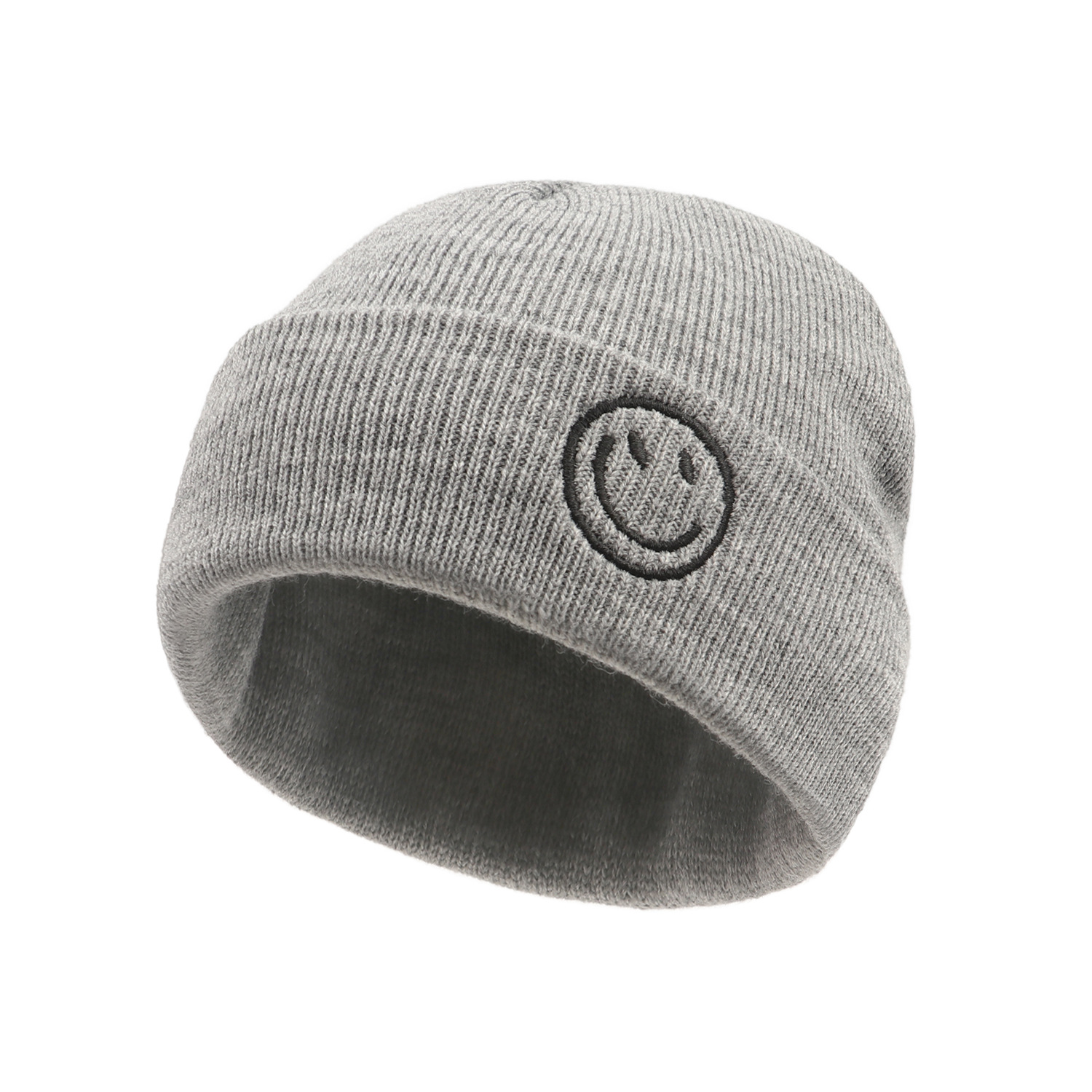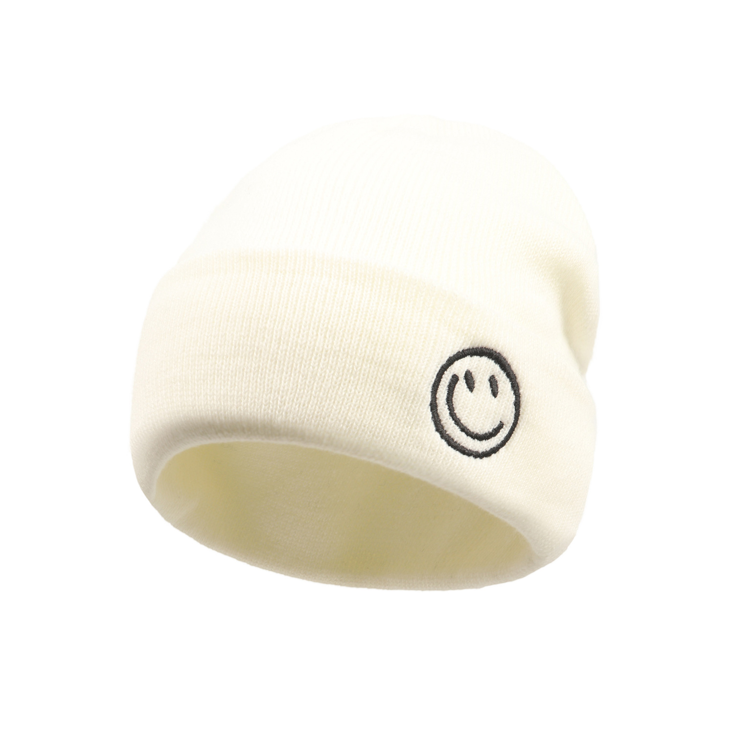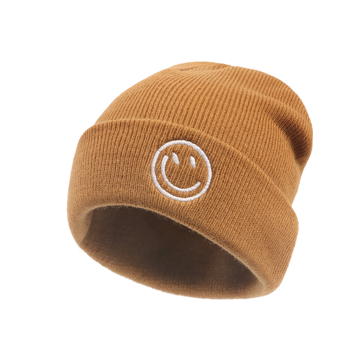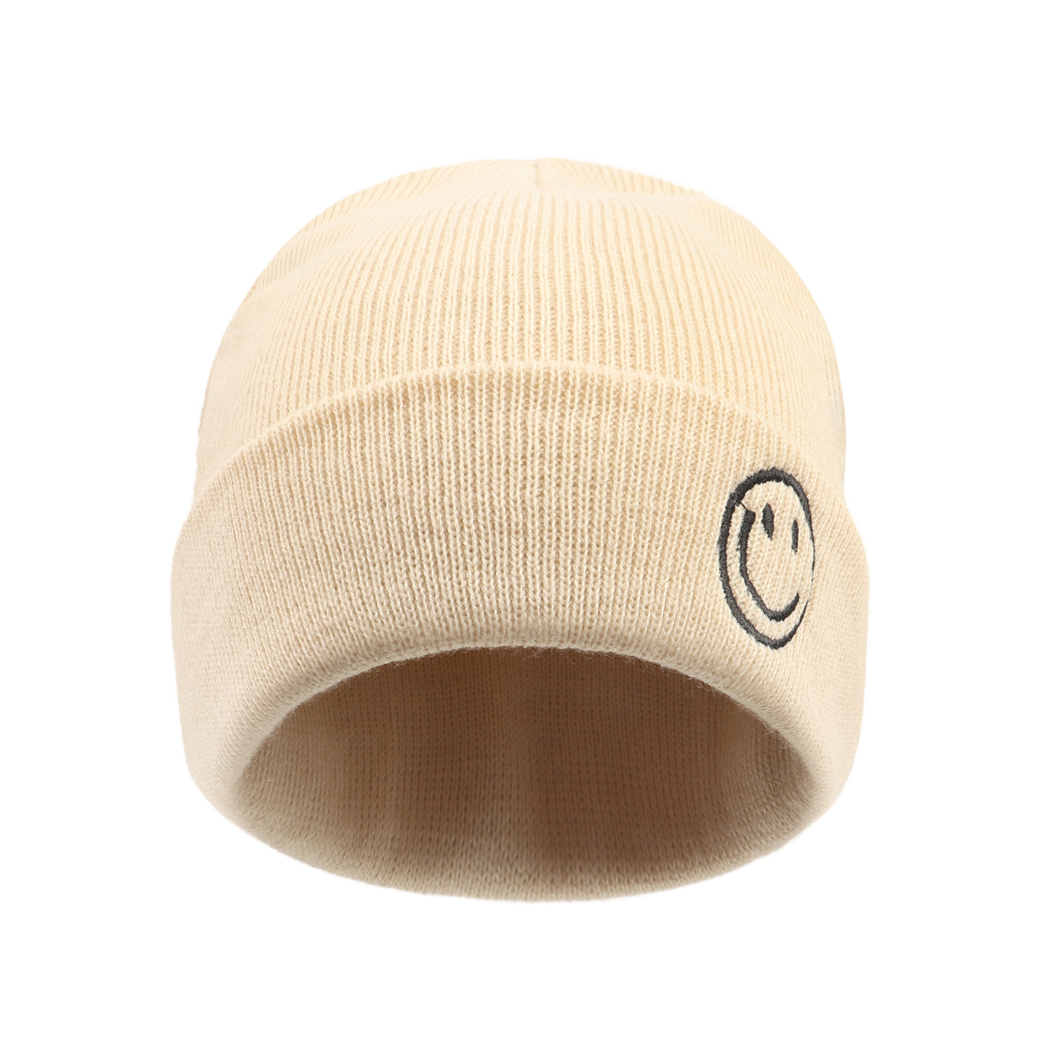 跨境热卖笑脸刺绣秋冬保暖护耳针织帽男女宝宝儿童圆顶毛线帽批发