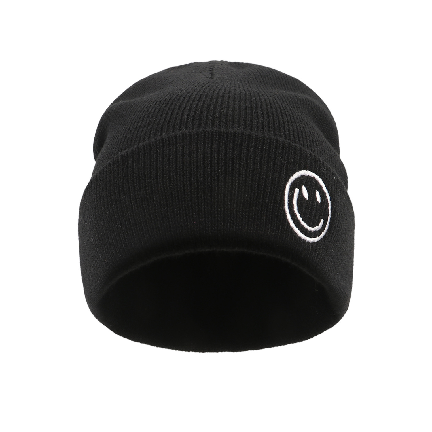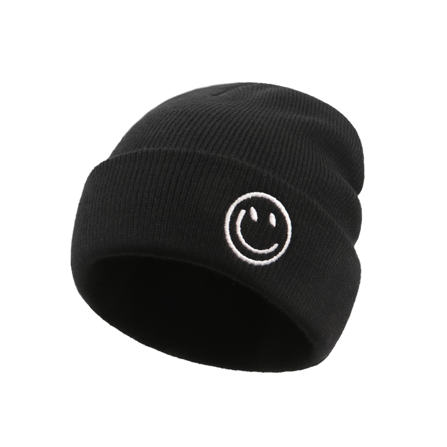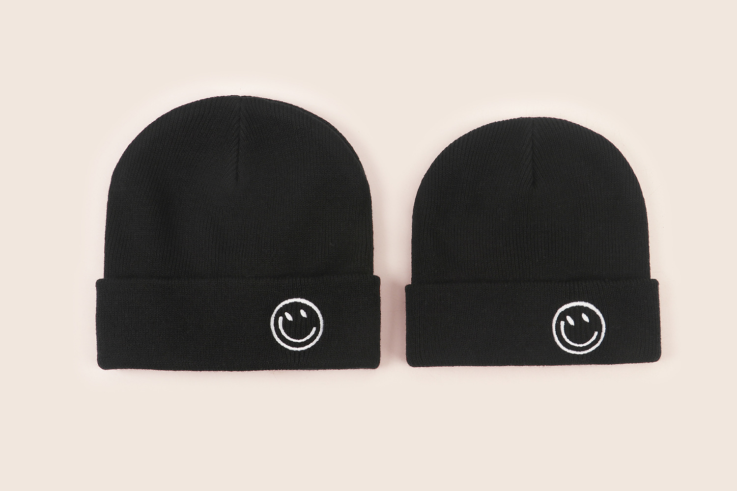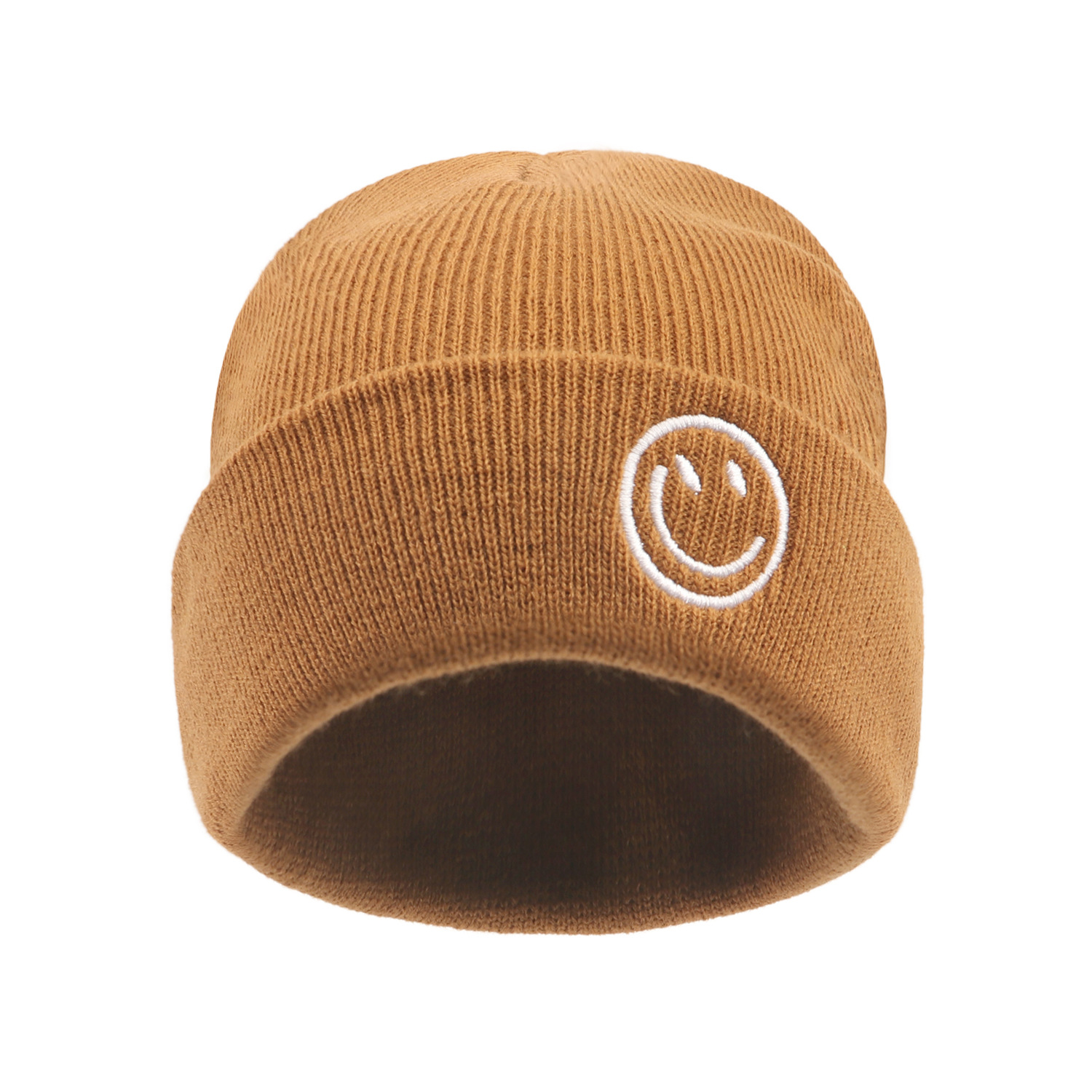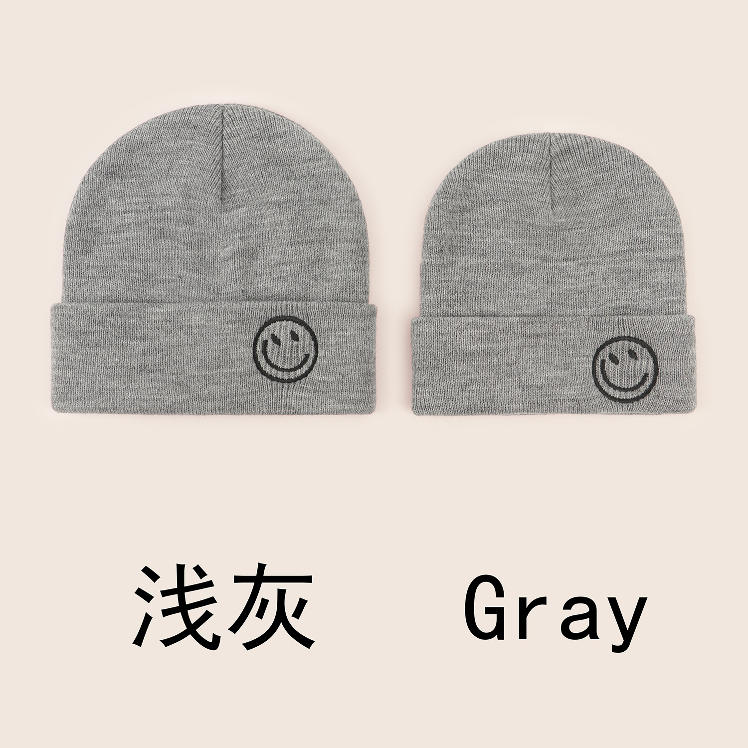 跨境热卖笑脸刺绣秋冬保暖护耳针织帽男女宝宝儿童圆顶毛线帽批发