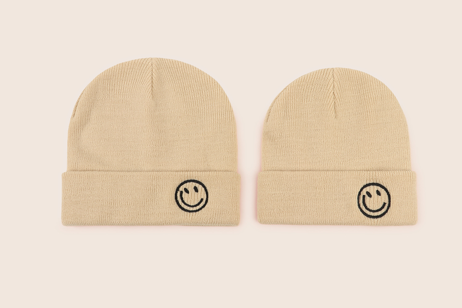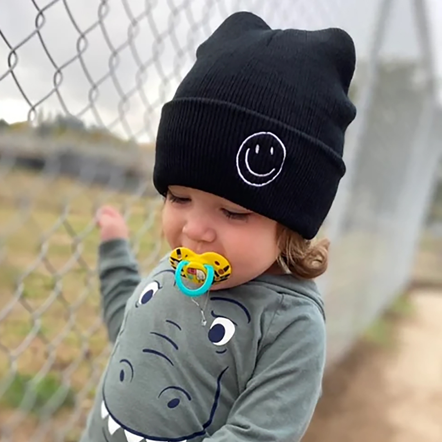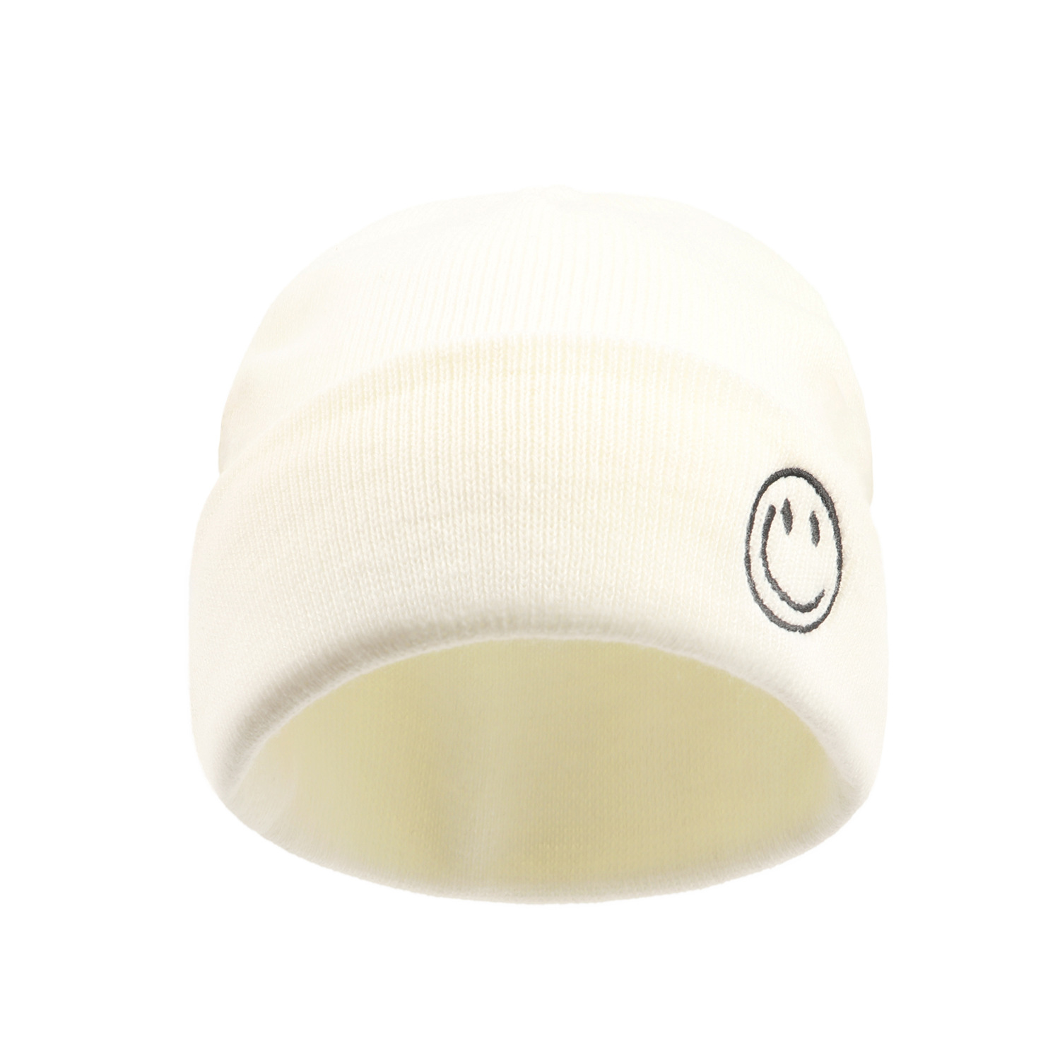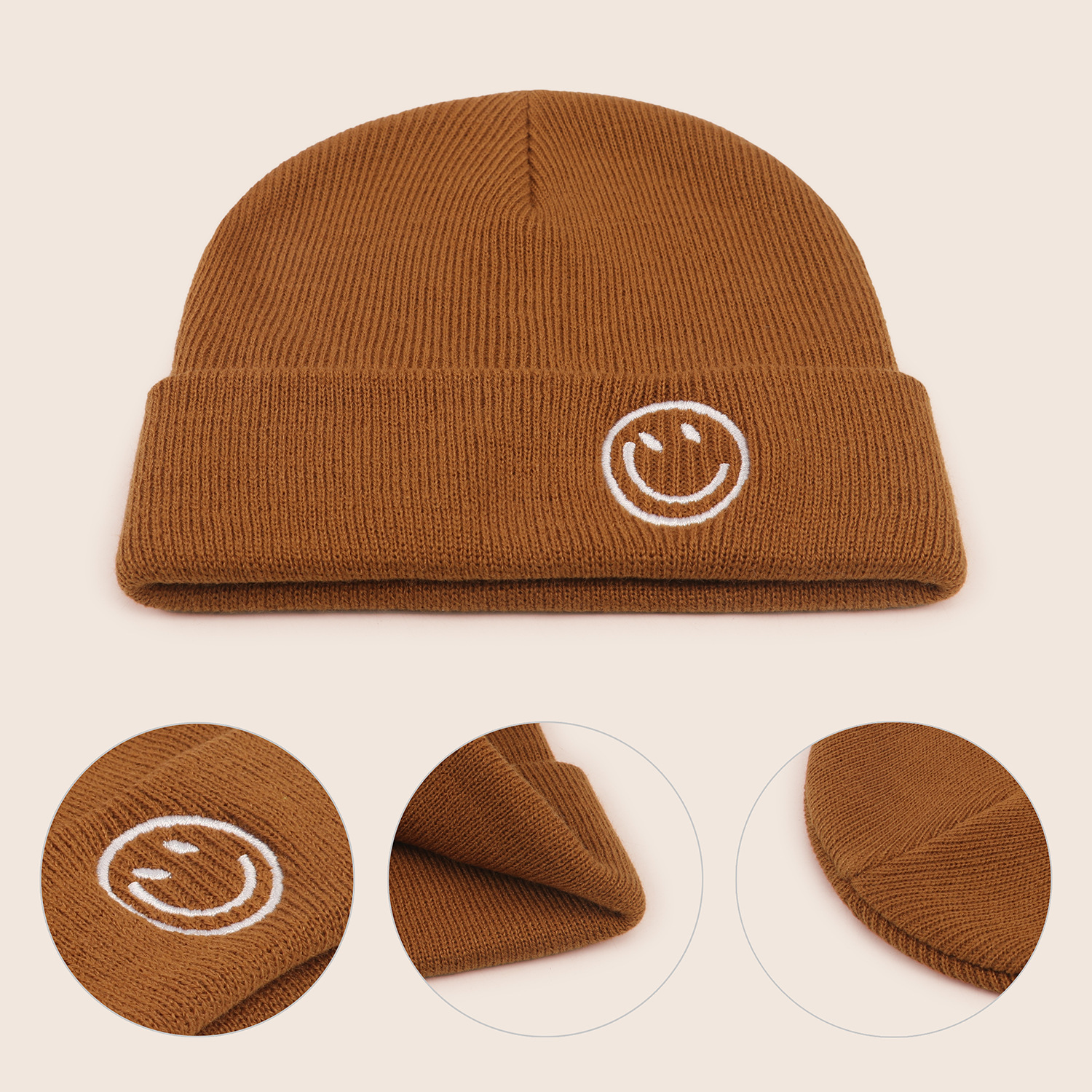 跨境热卖笑脸刺绣秋冬保暖护耳针织帽男女宝宝儿童圆顶毛线帽批发