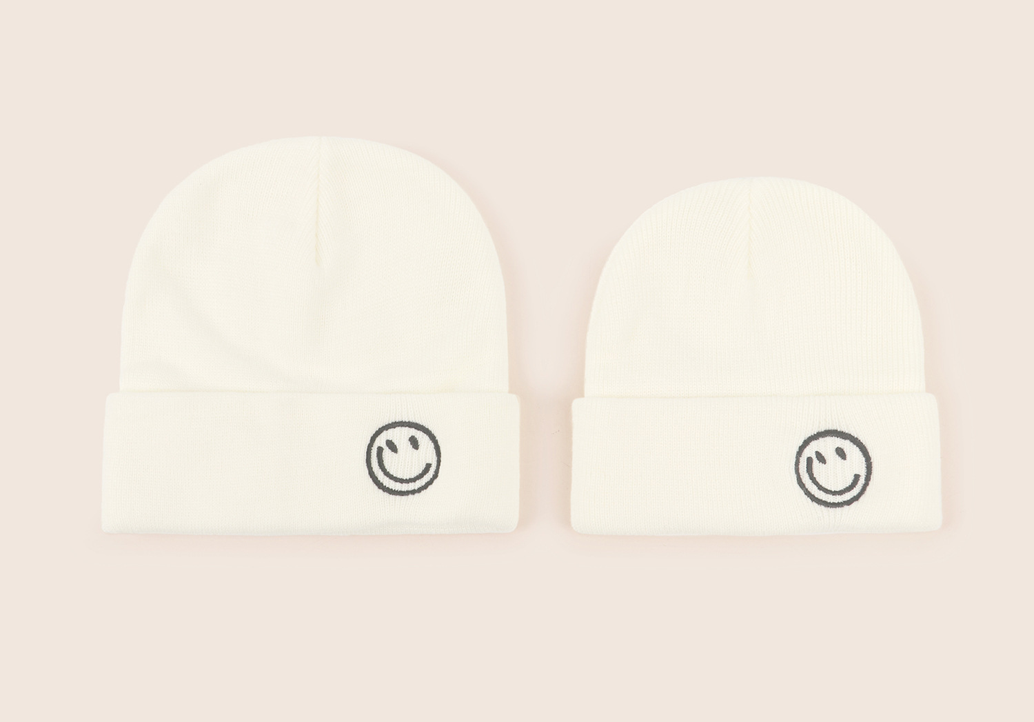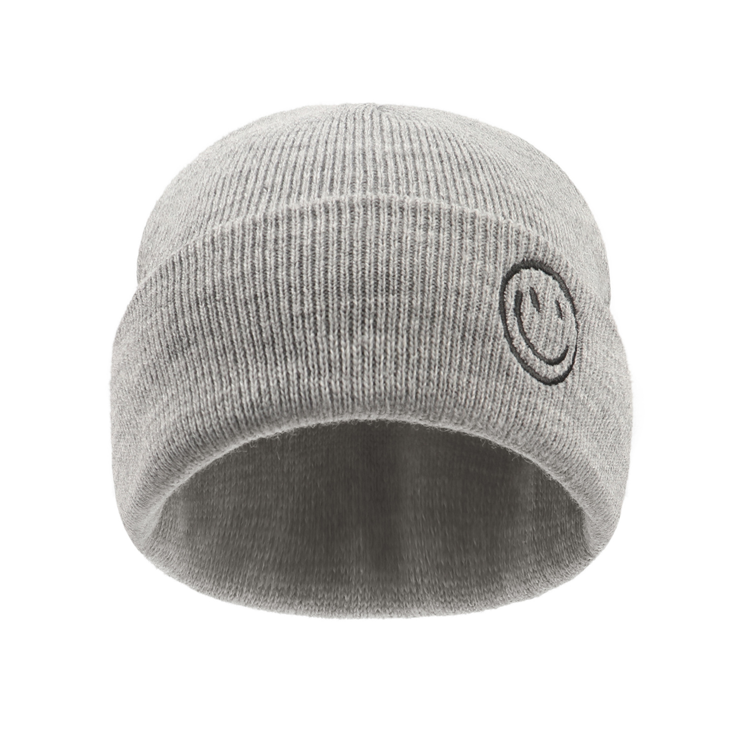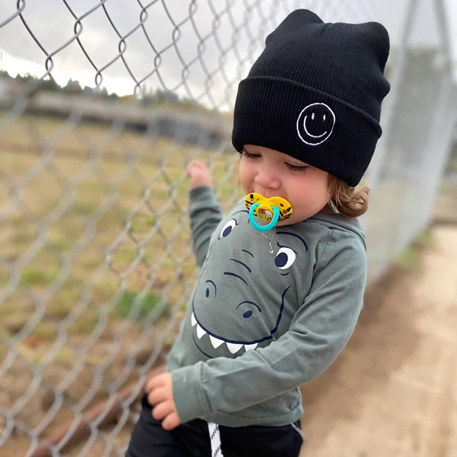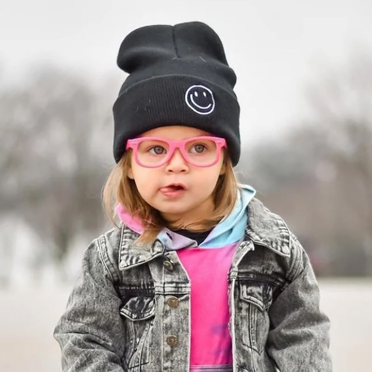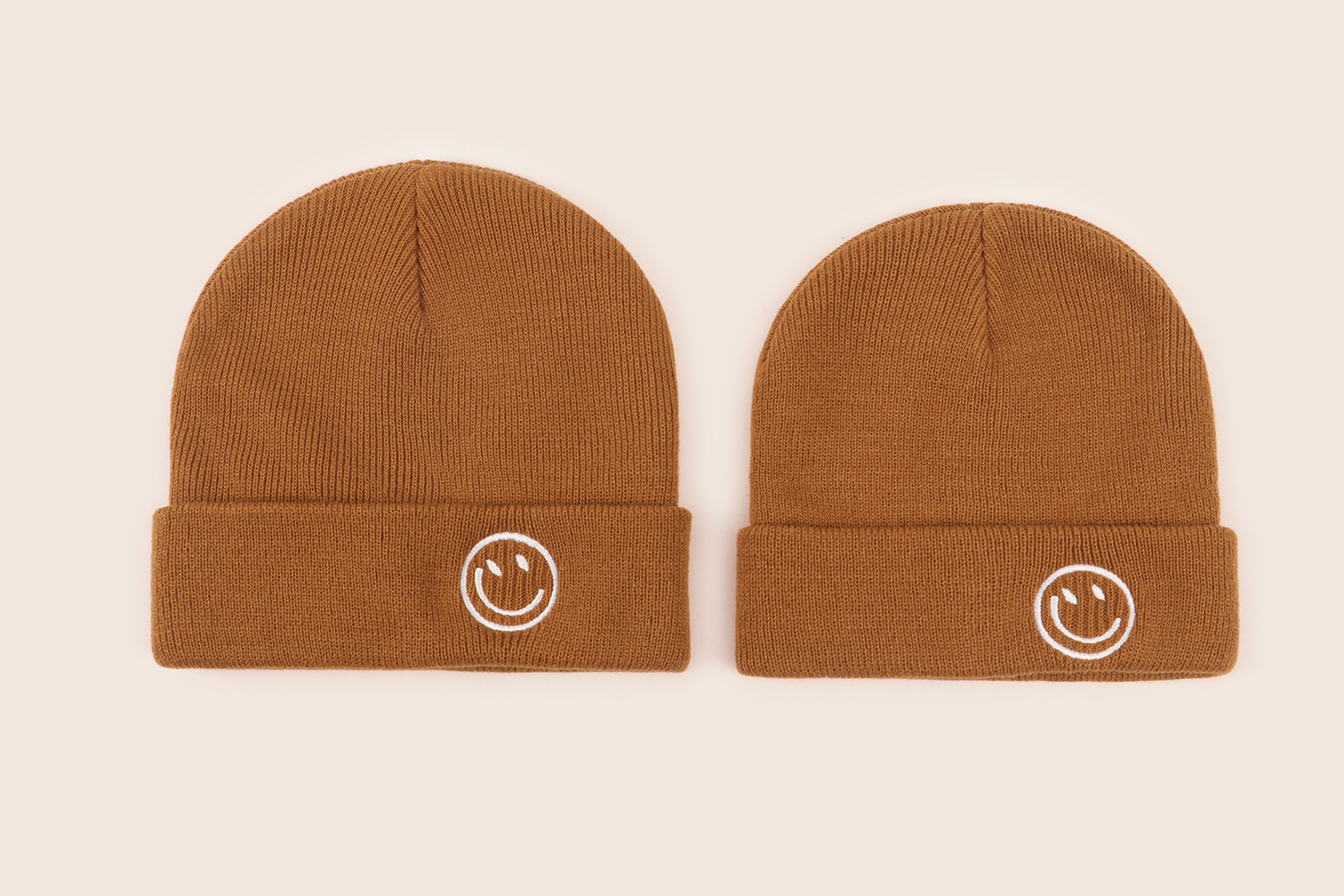 跨境热卖笑脸刺绣秋冬保暖护耳针织帽男女宝宝儿童圆顶毛线帽批发