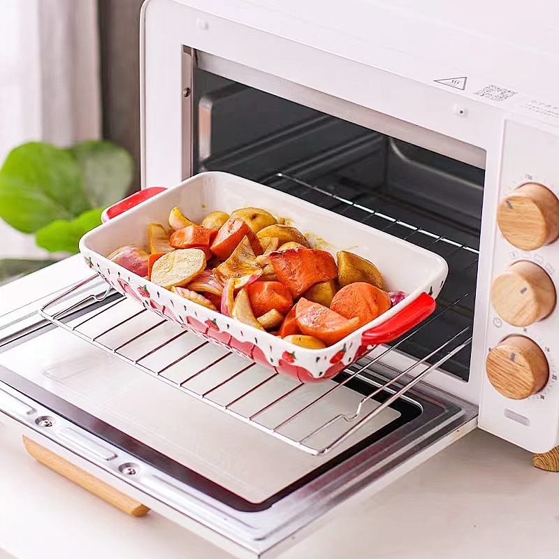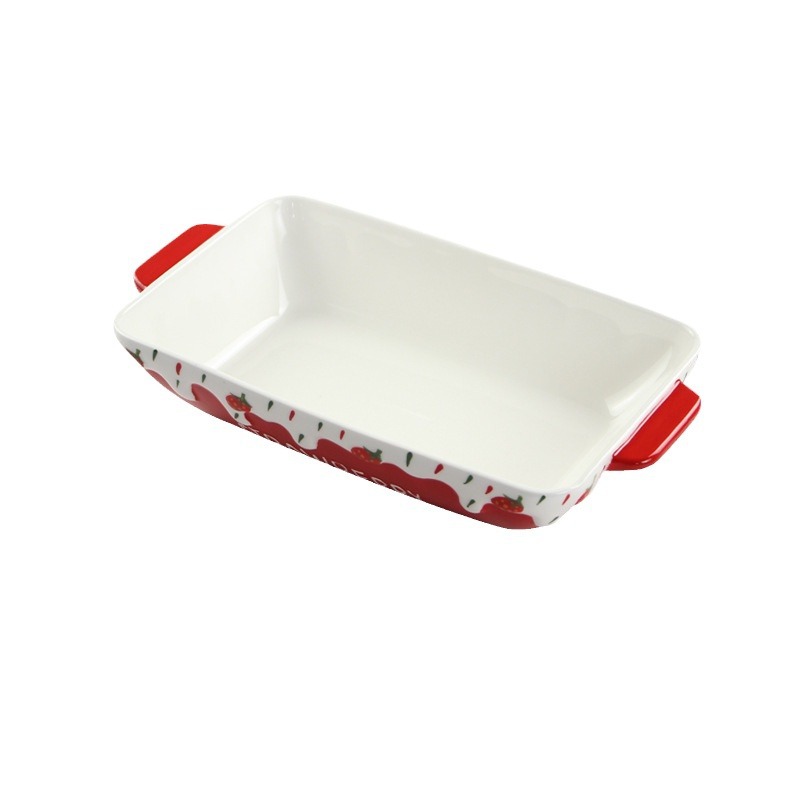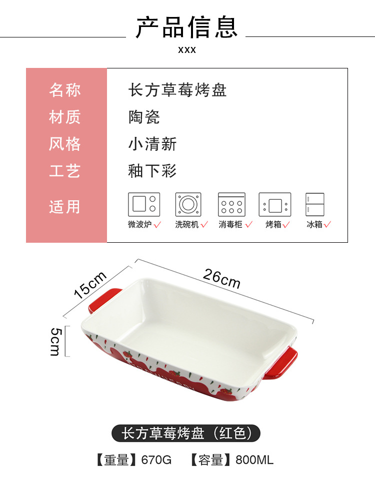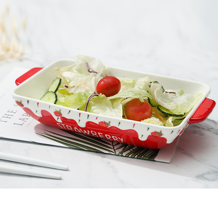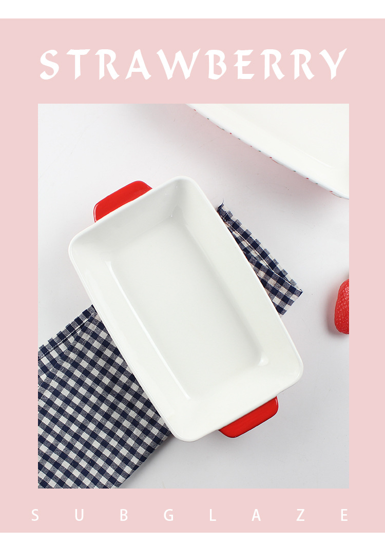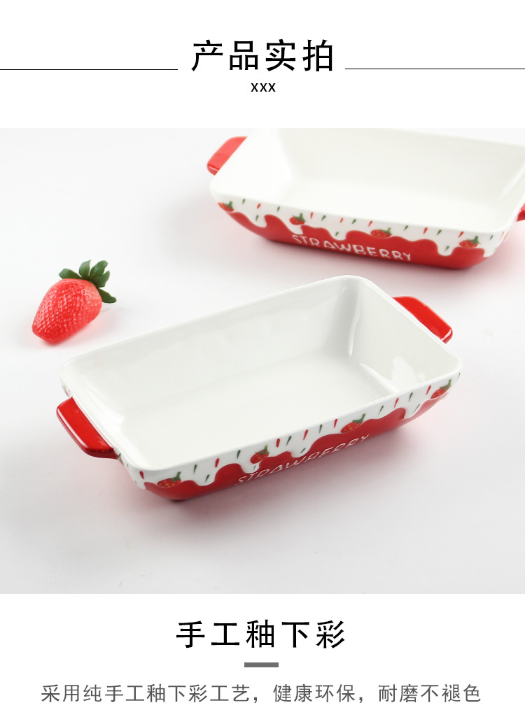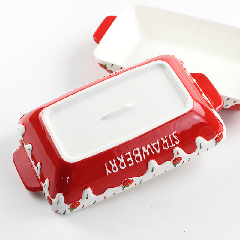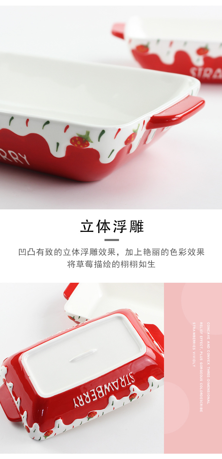 原创长方形可爱草莓烤盘ins 釉下彩浮雕双耳陶瓷水果托盘烘焙盘
