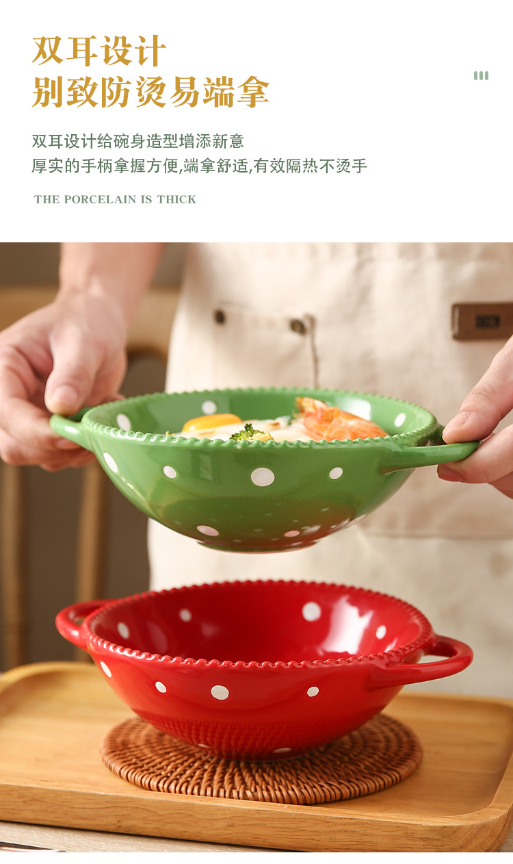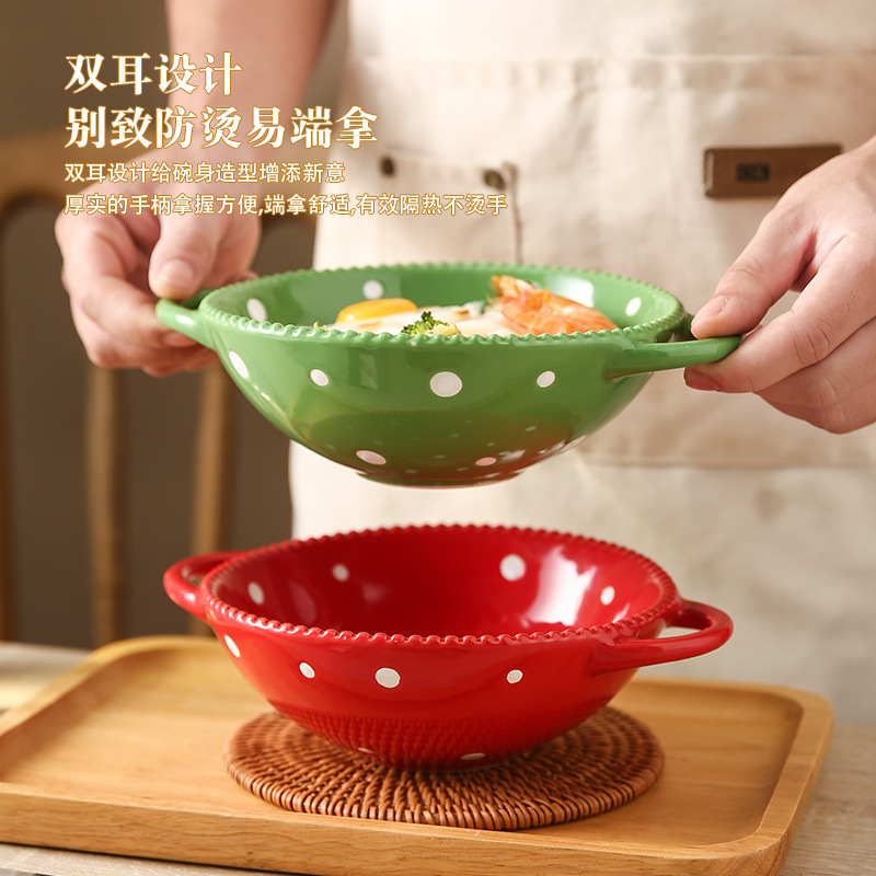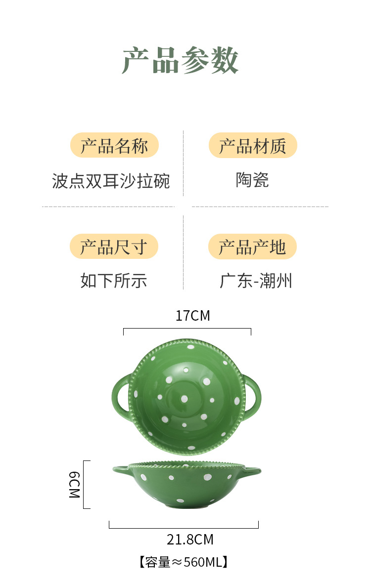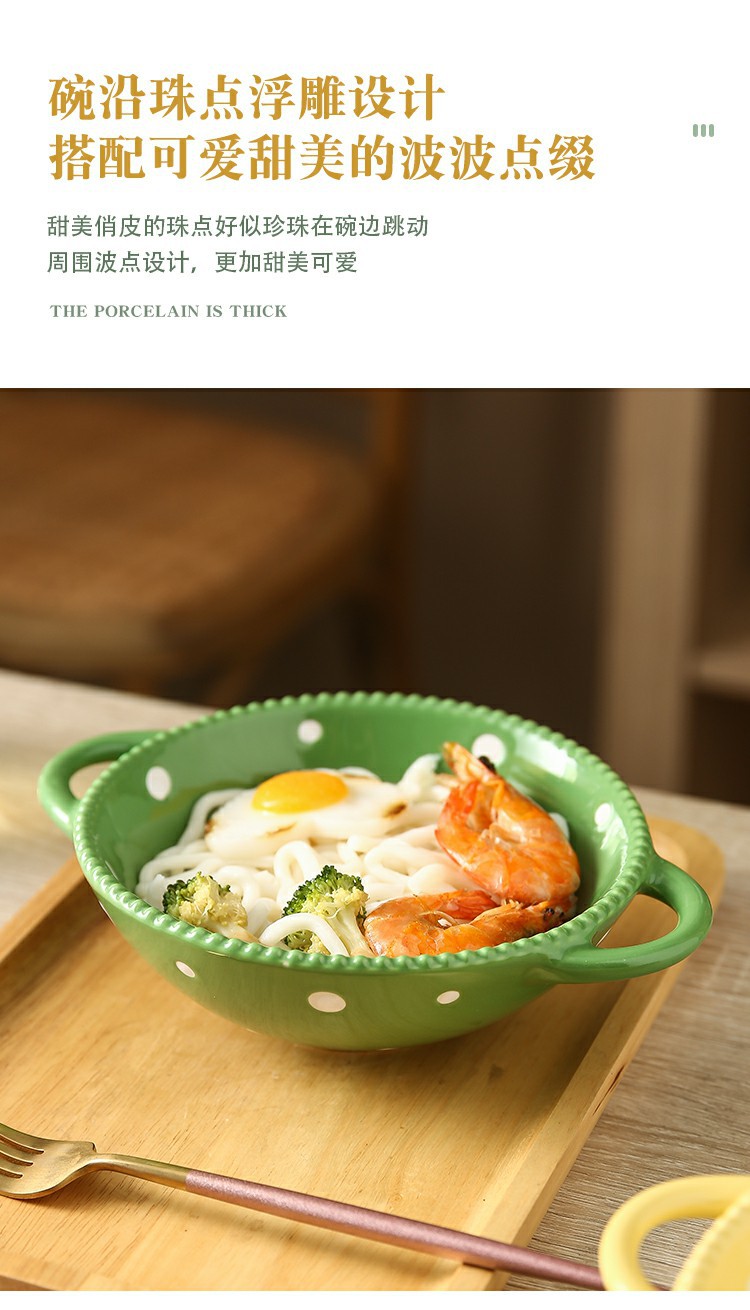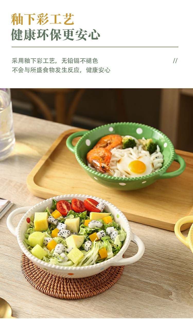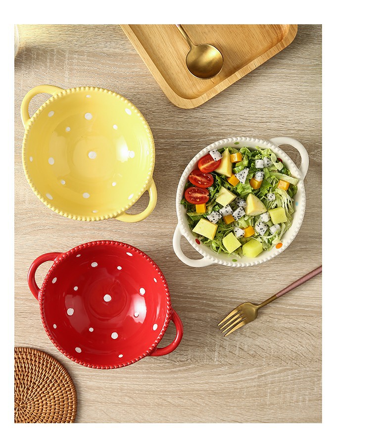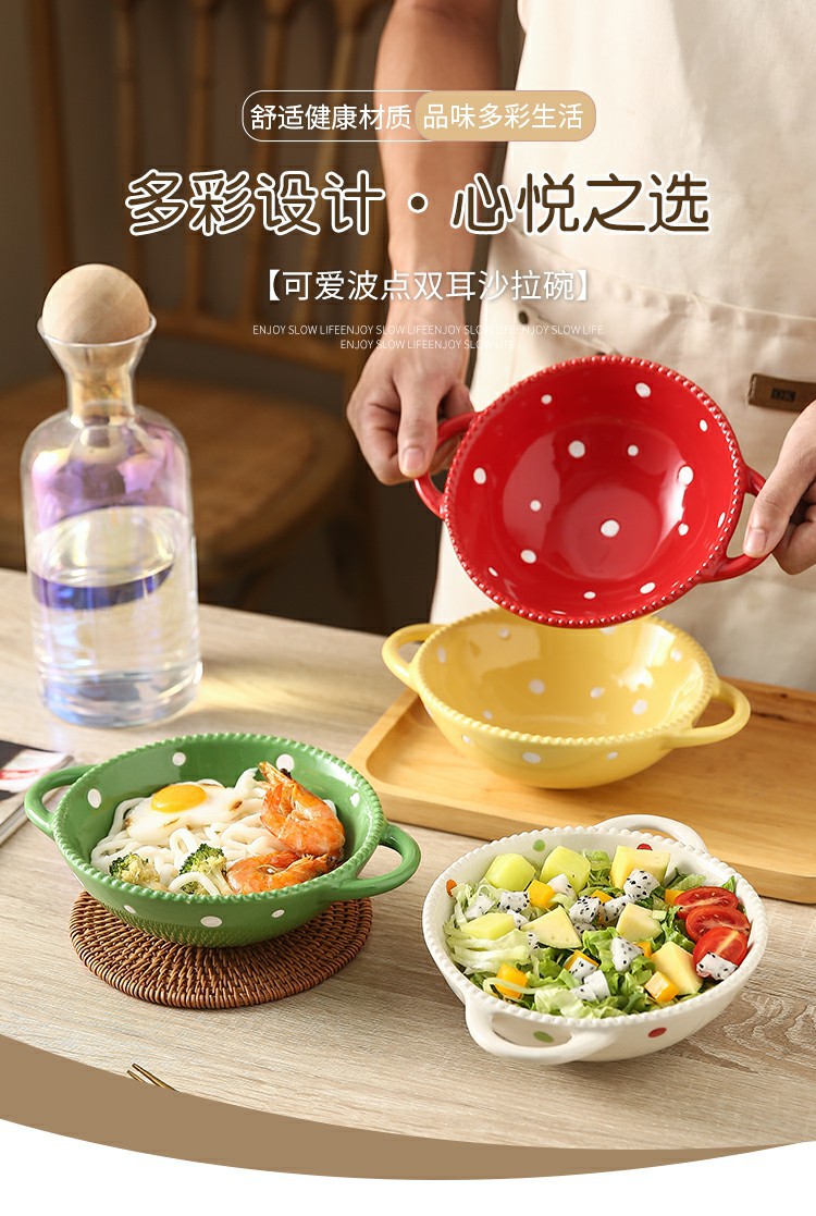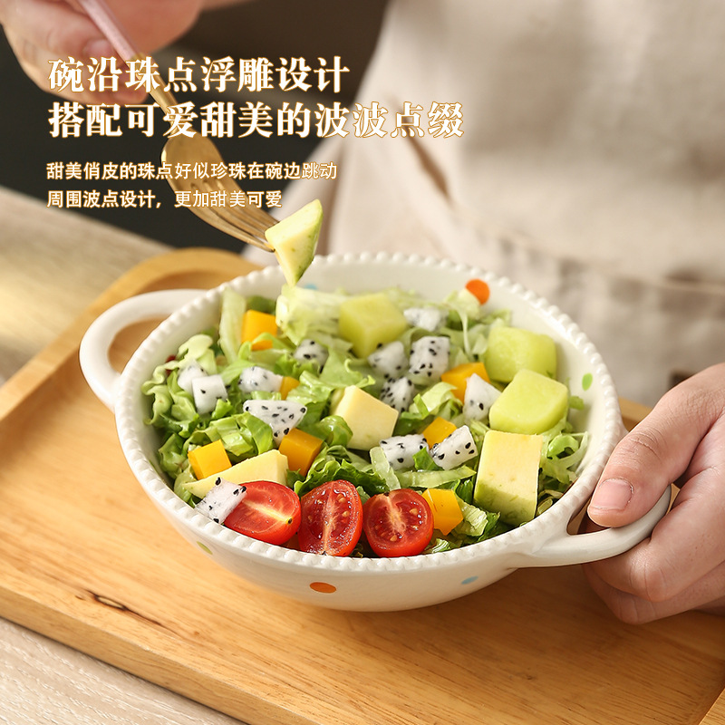 创意波点珠边双耳碗ins风釉下彩家用陶瓷水果沙拉碗空气炸锅适用