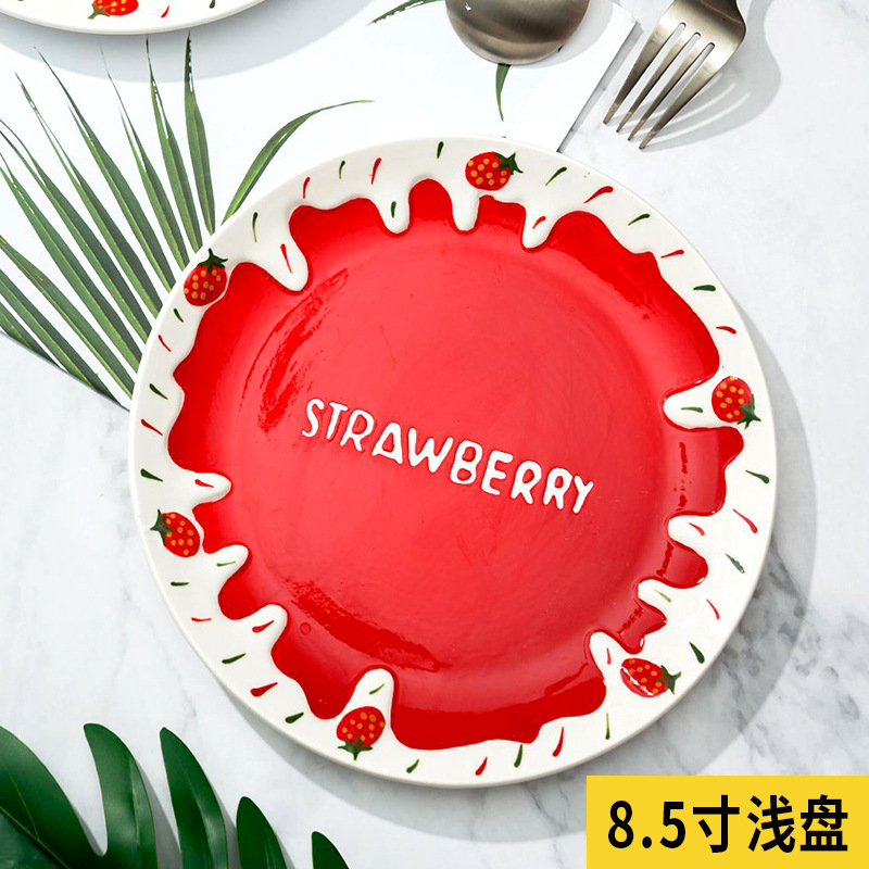 8.5寸耐高温陶瓷盘家用可爱草莓浮雕早餐盘红色釉下彩甜点西餐盘
