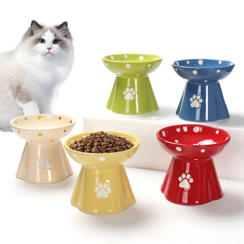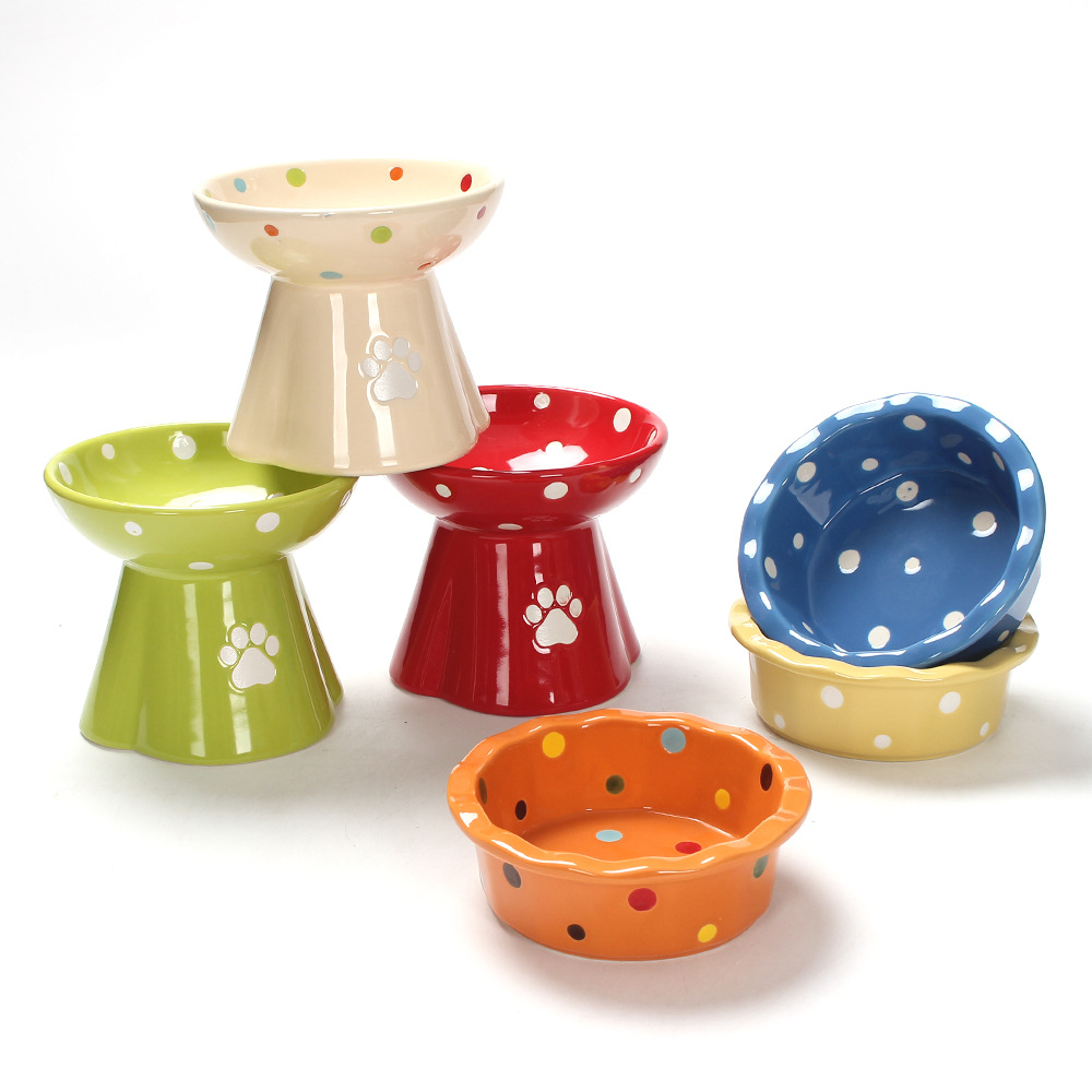陶瓷波点狗猫碗套装护颈高脚碗不黑下巴猫狗食盆喝水慢食碗防打翻