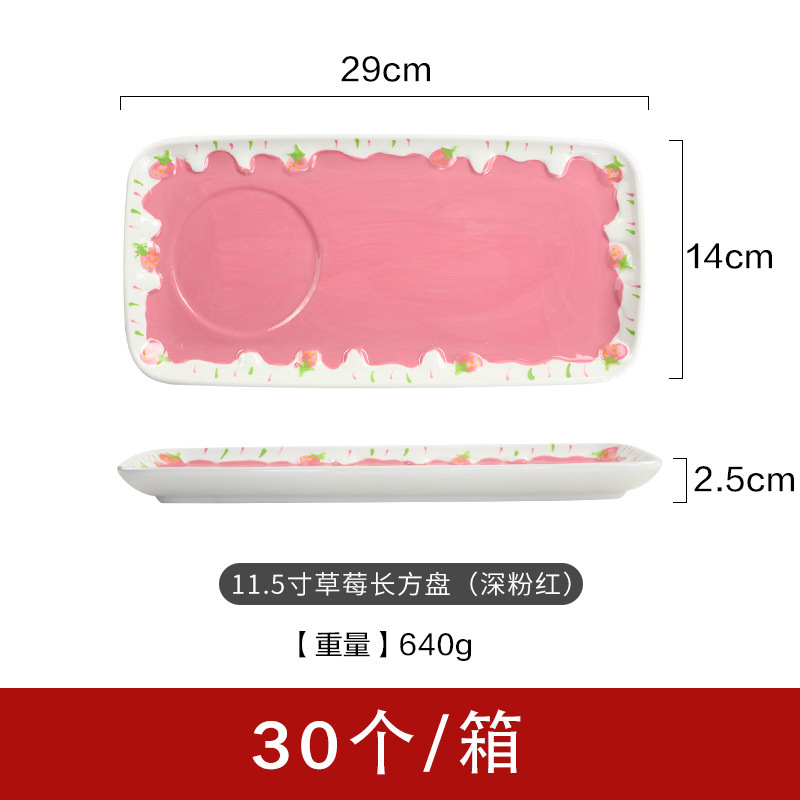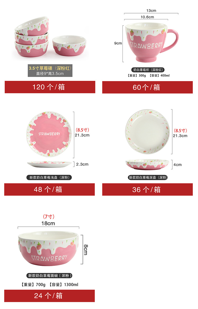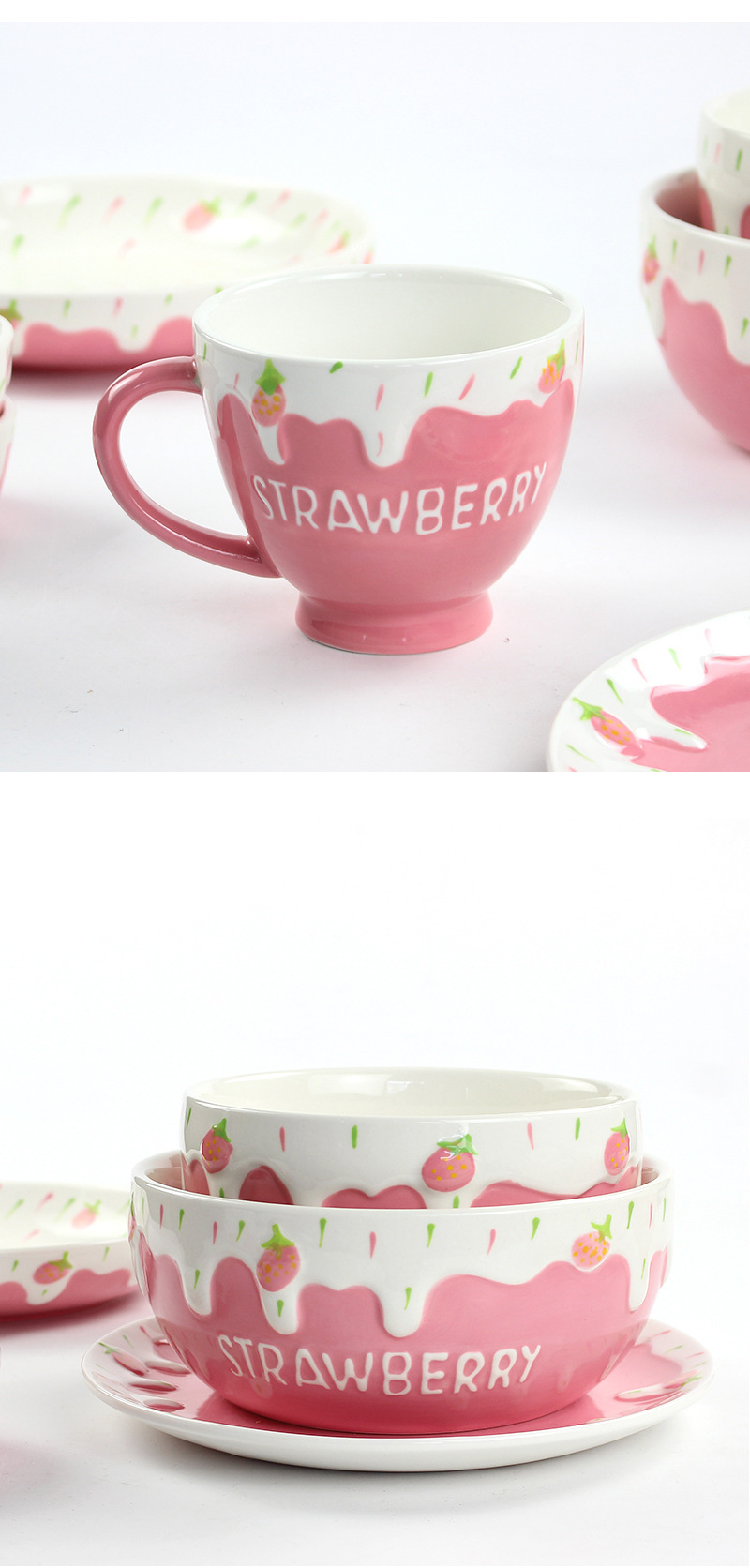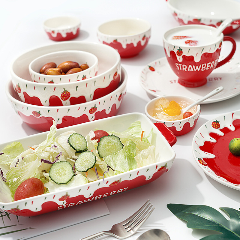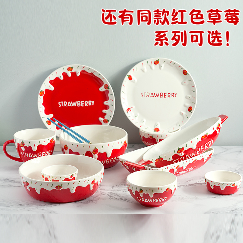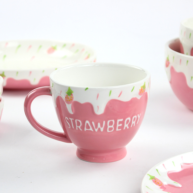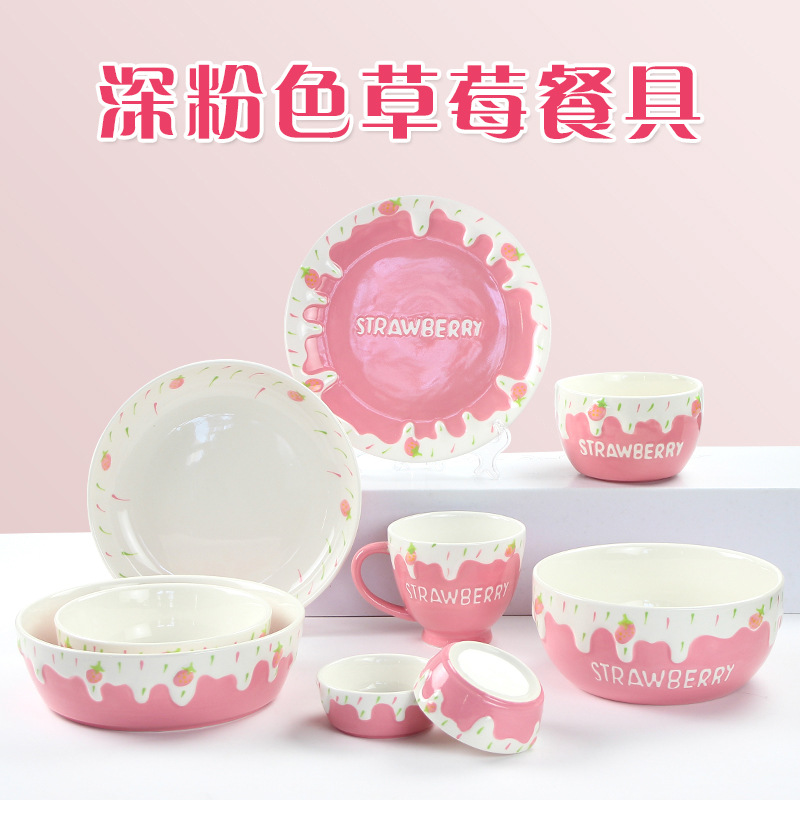 可爱手绘陶瓷餐具套装原创少女心早餐杯深粉色草莓沙拉碗浅盘套装
