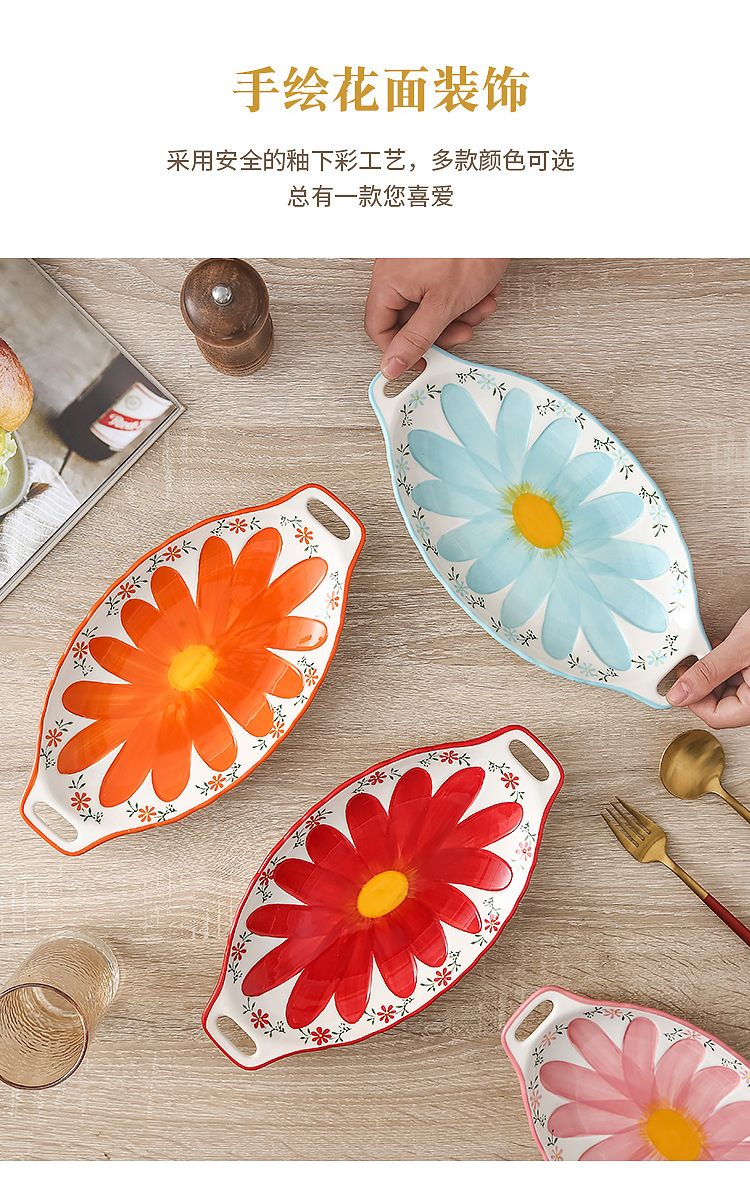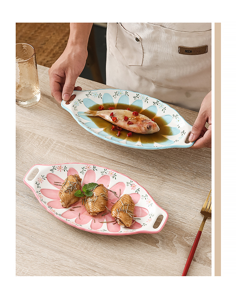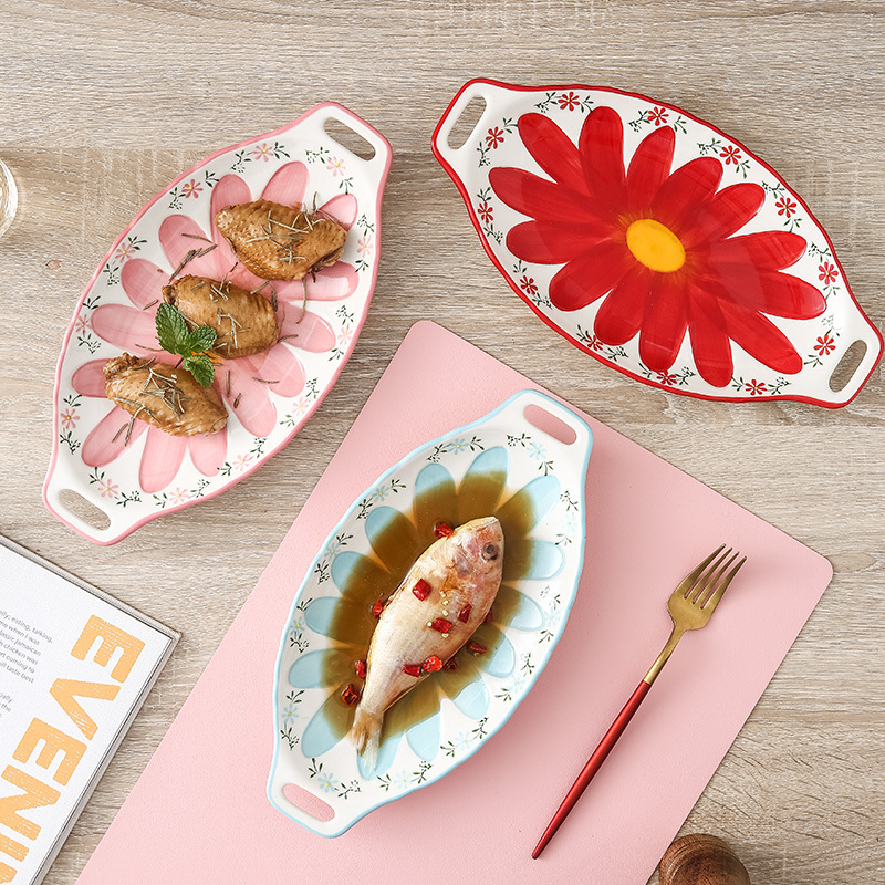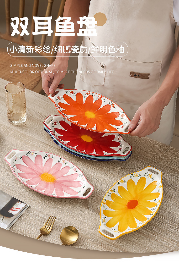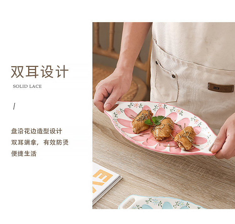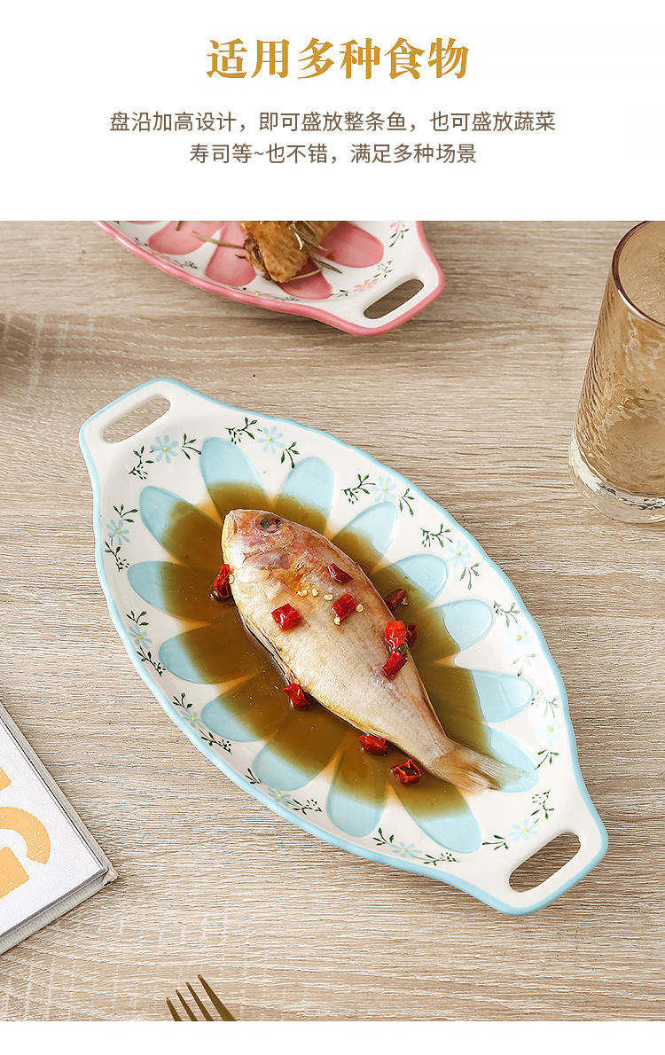 批发陶瓷盘子家用耐高温菜盘餐盘小清新浮雕花卉双耳鱼盘水果盘子