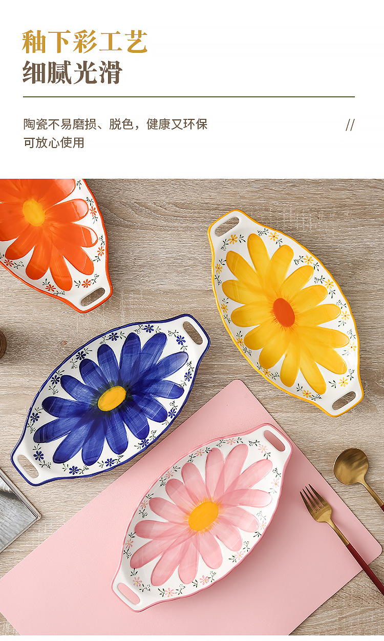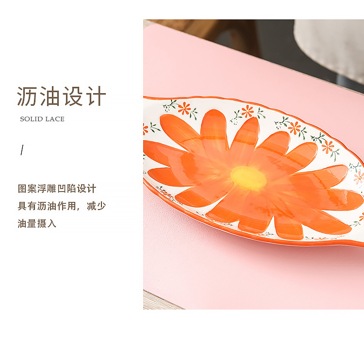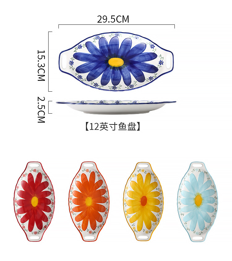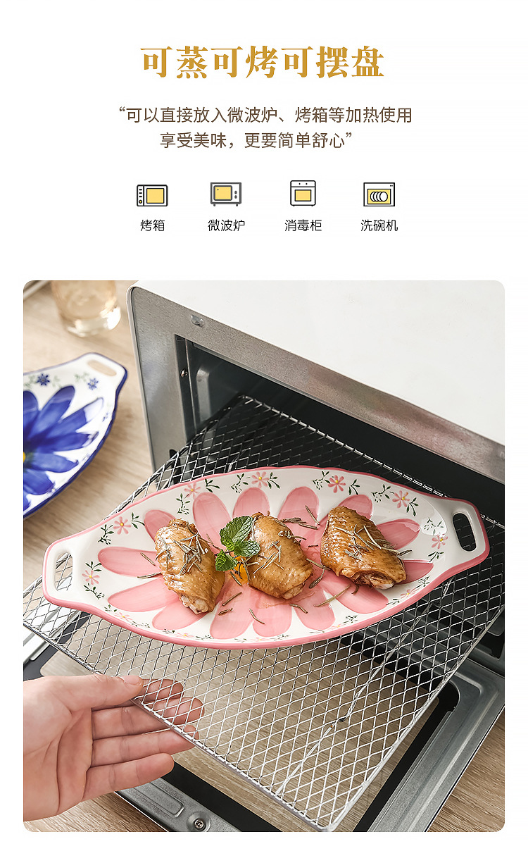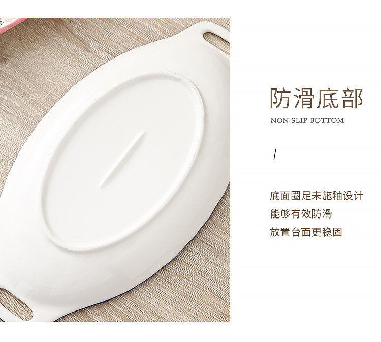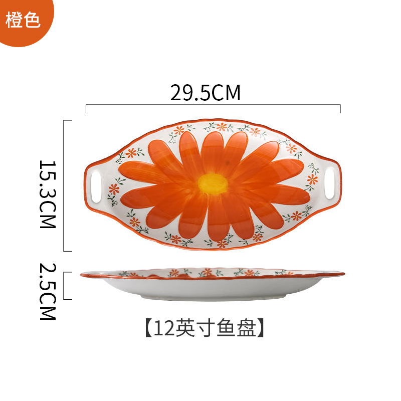 批发陶瓷盘子家用耐高温菜盘餐盘小清新浮雕花卉双耳鱼盘水果盘子