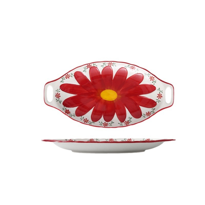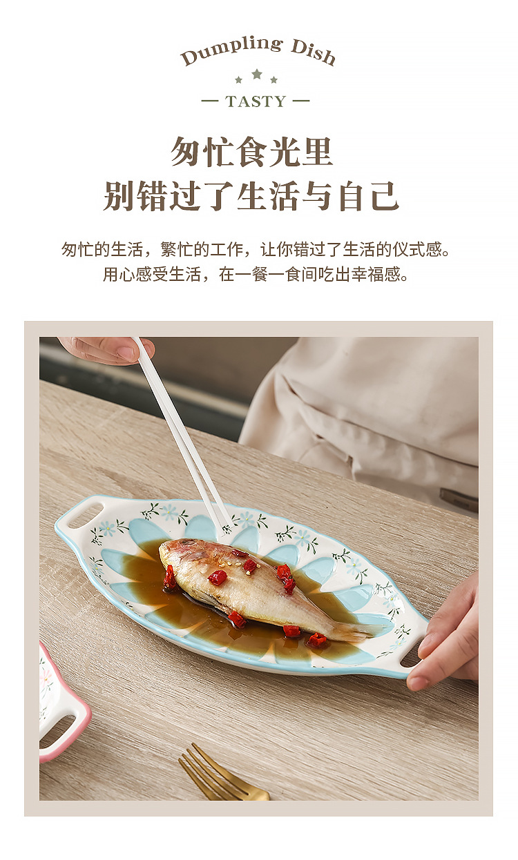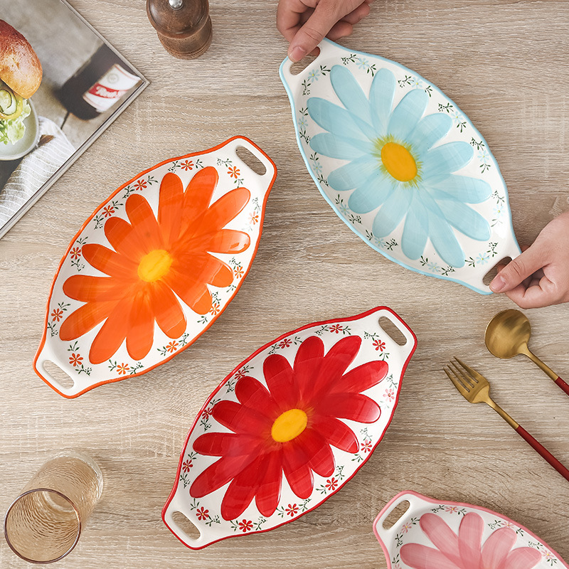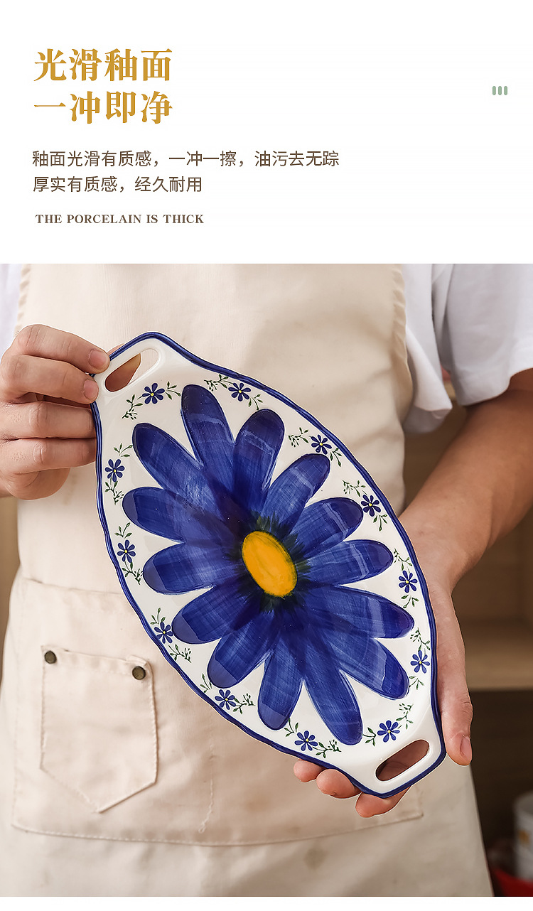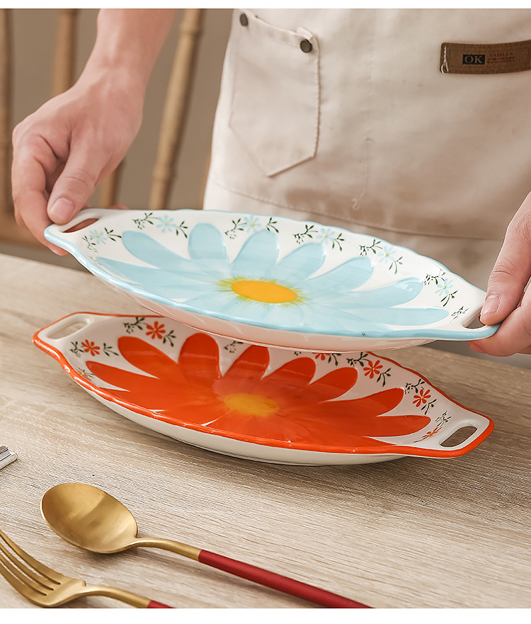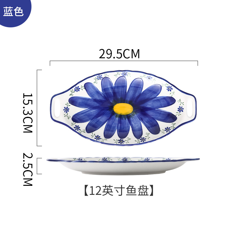 批发陶瓷盘子家用耐高温菜盘餐盘小清新浮雕花卉双耳鱼盘水果盘子