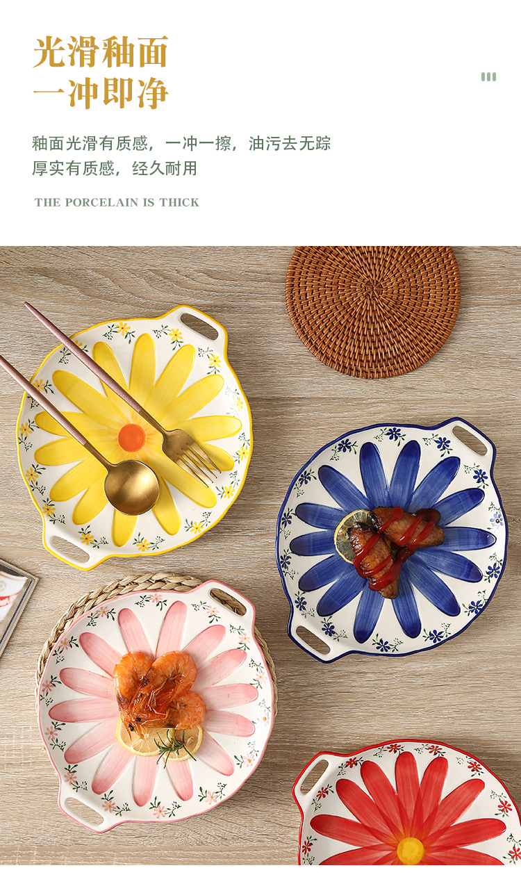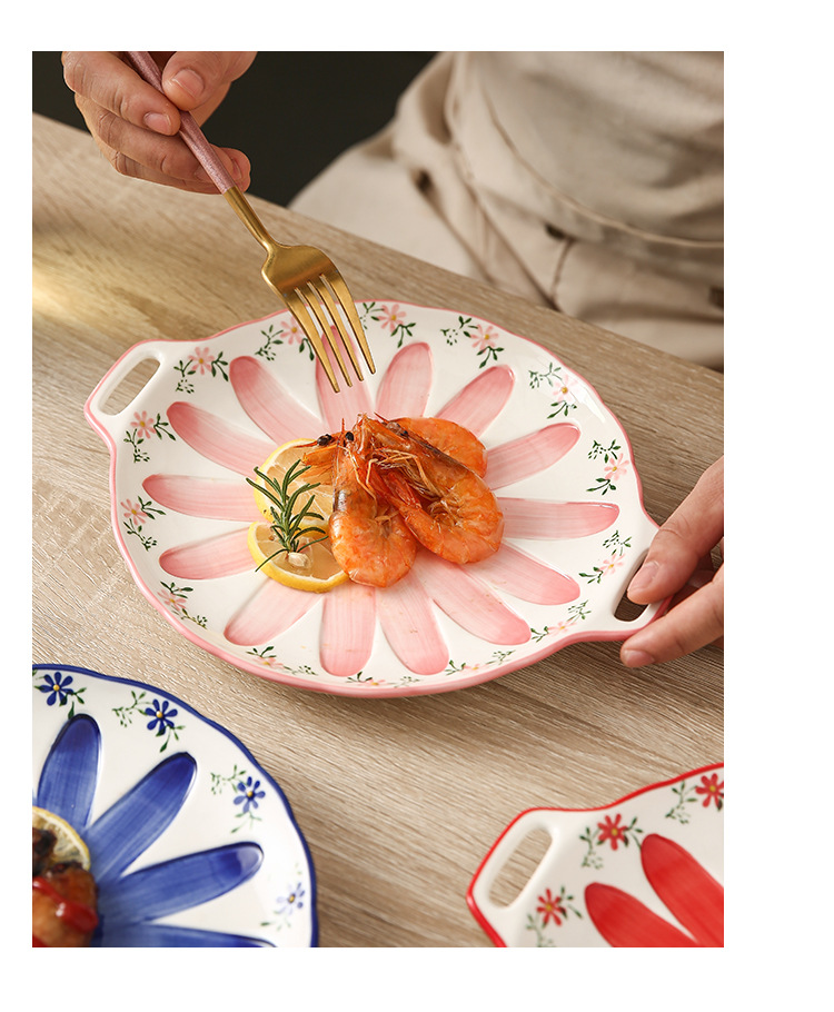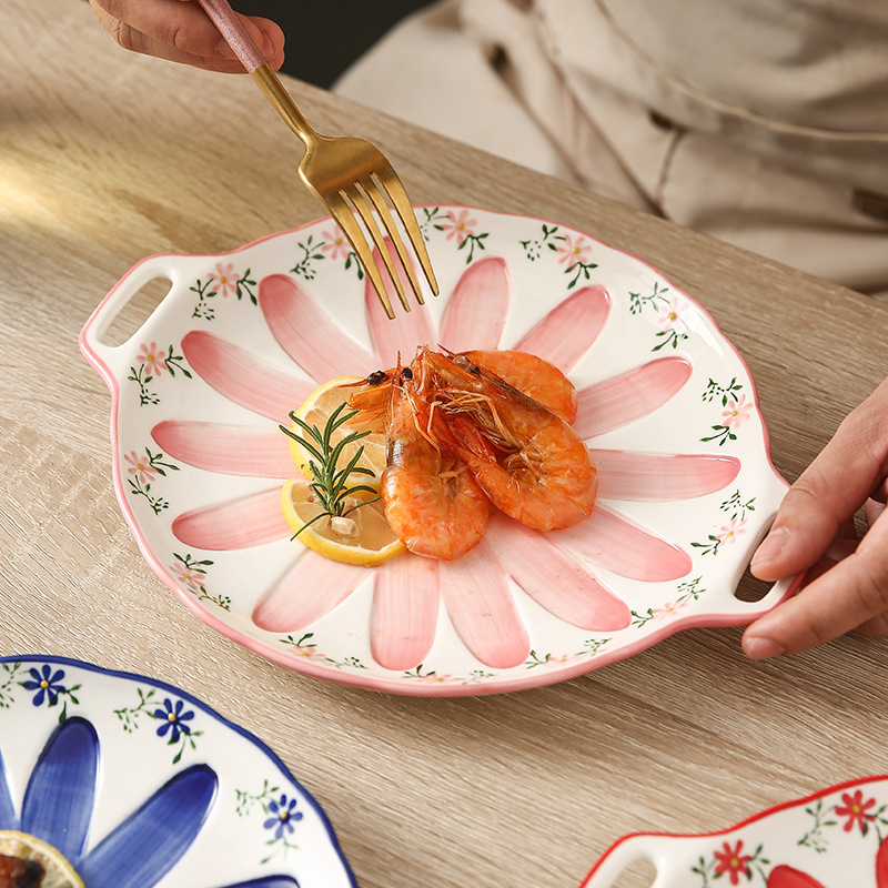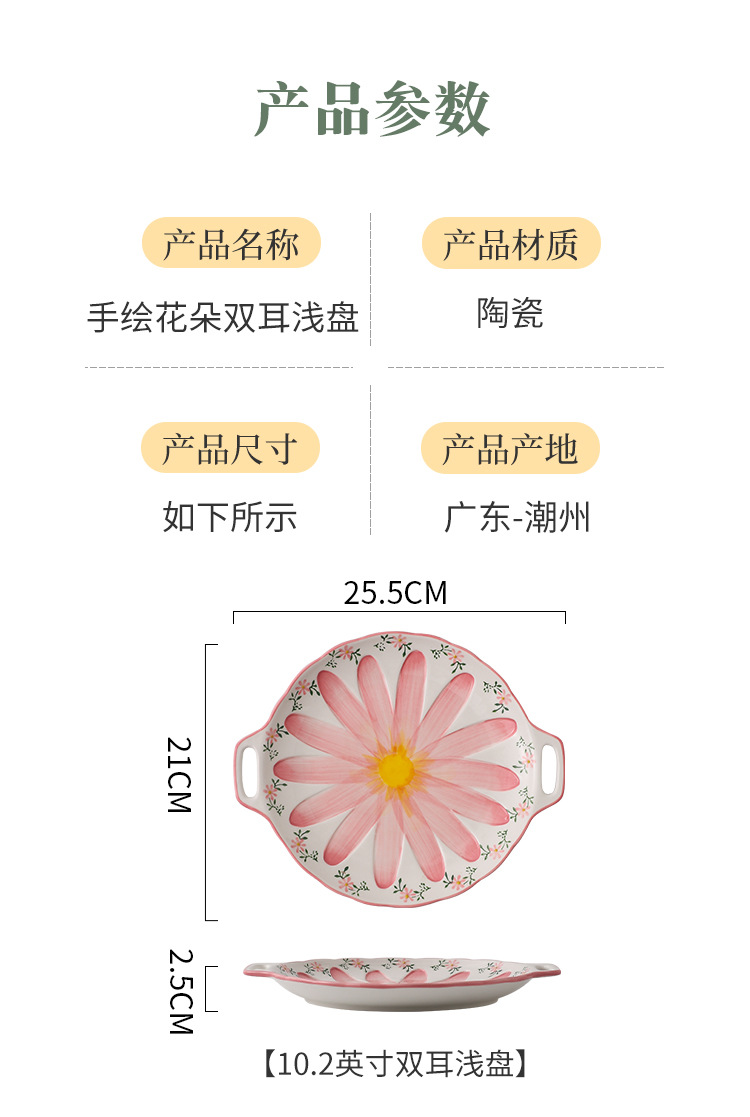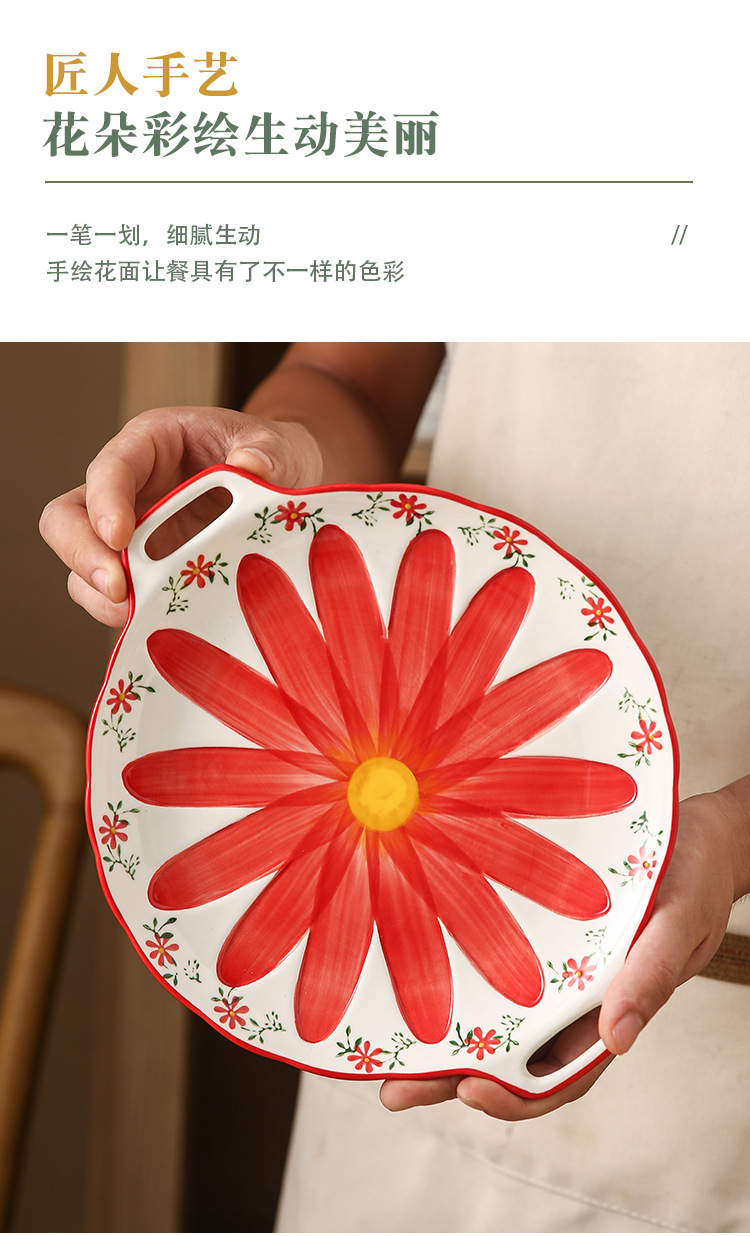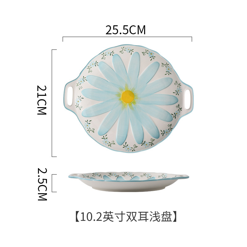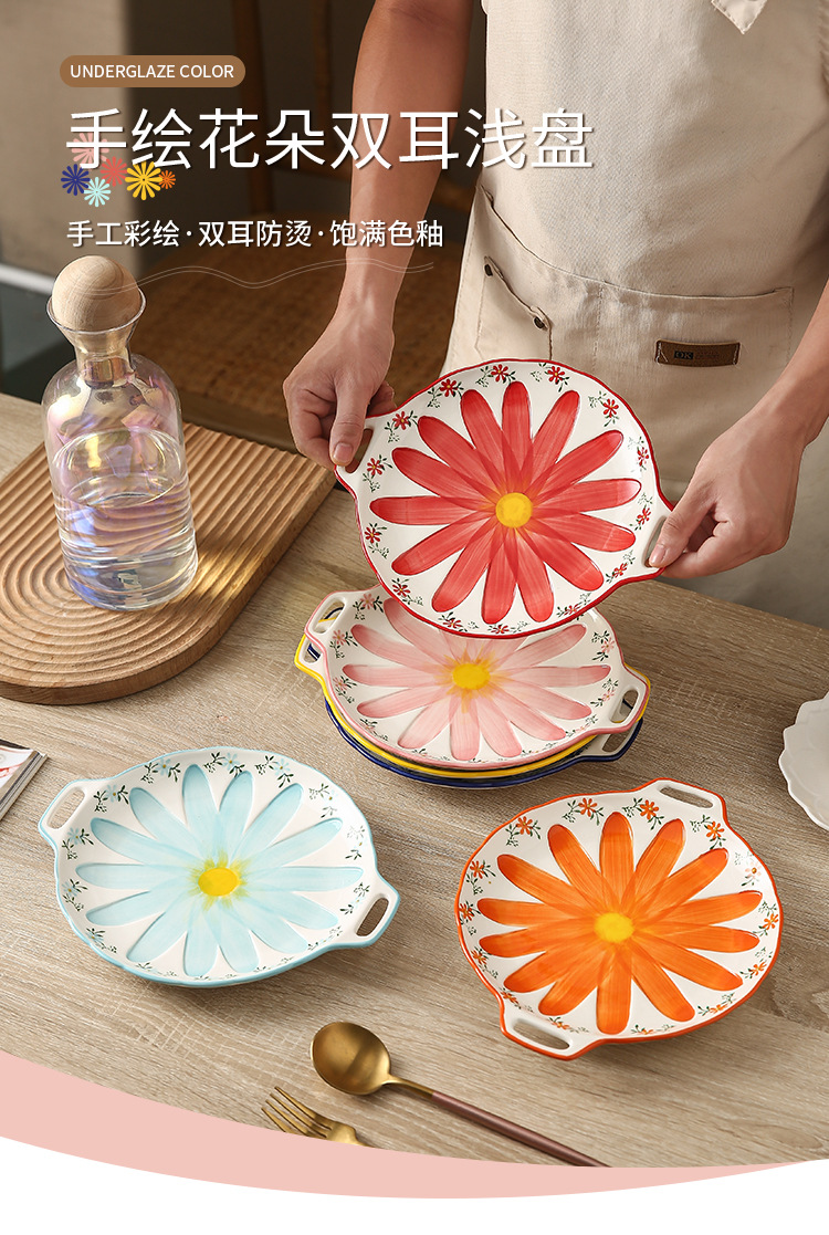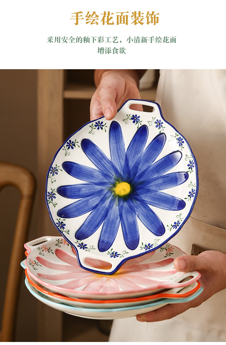 手绘花朵双耳浅盘餐盘釉下彩陶瓷盘子菜盘家用早餐盘水果盘沙拉盘