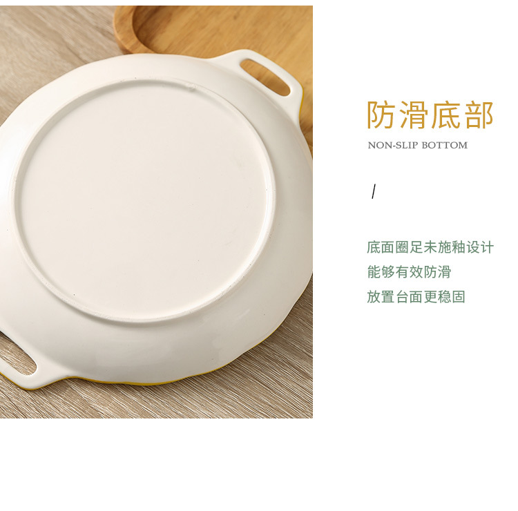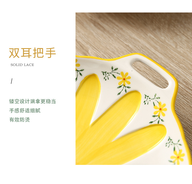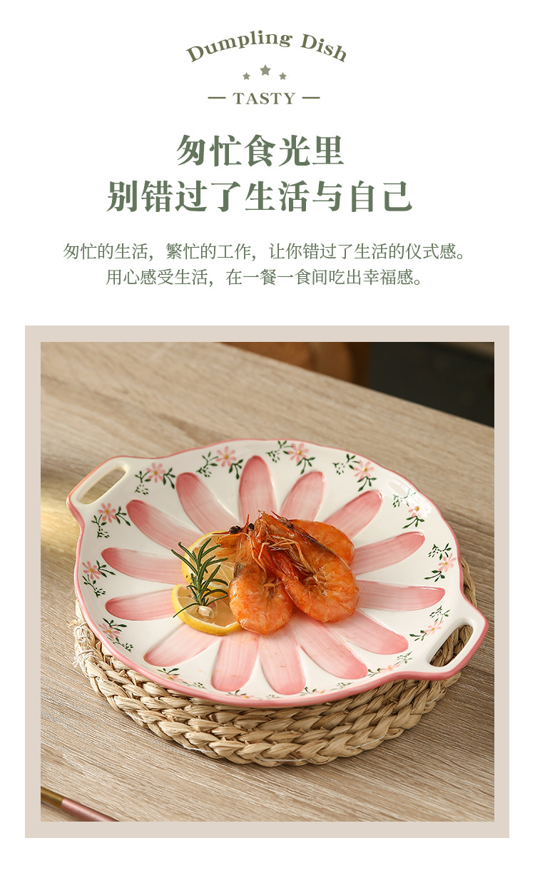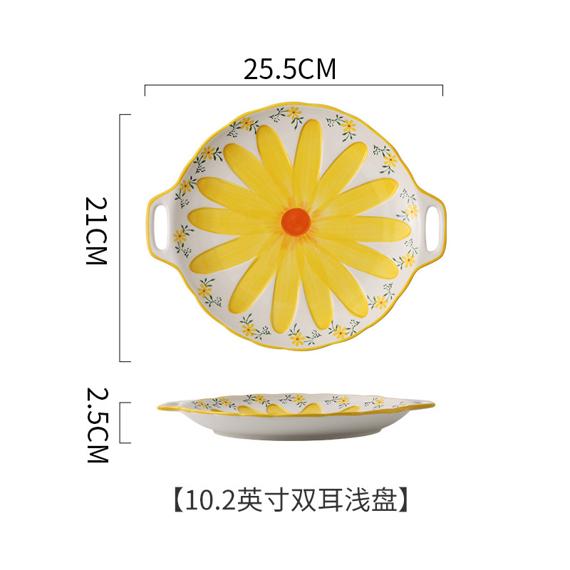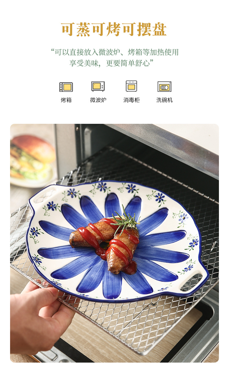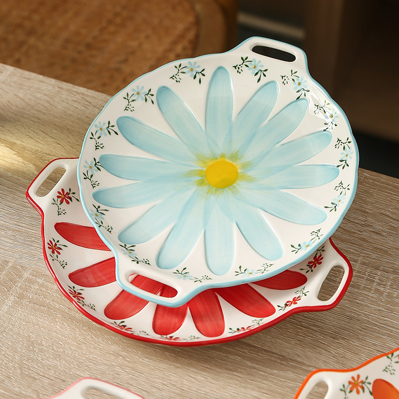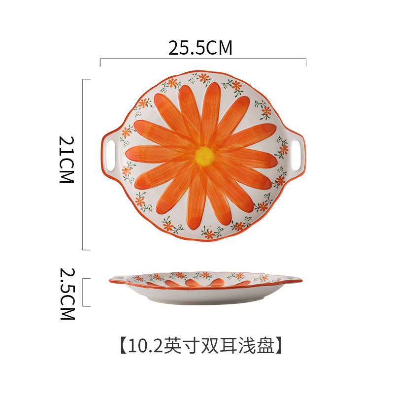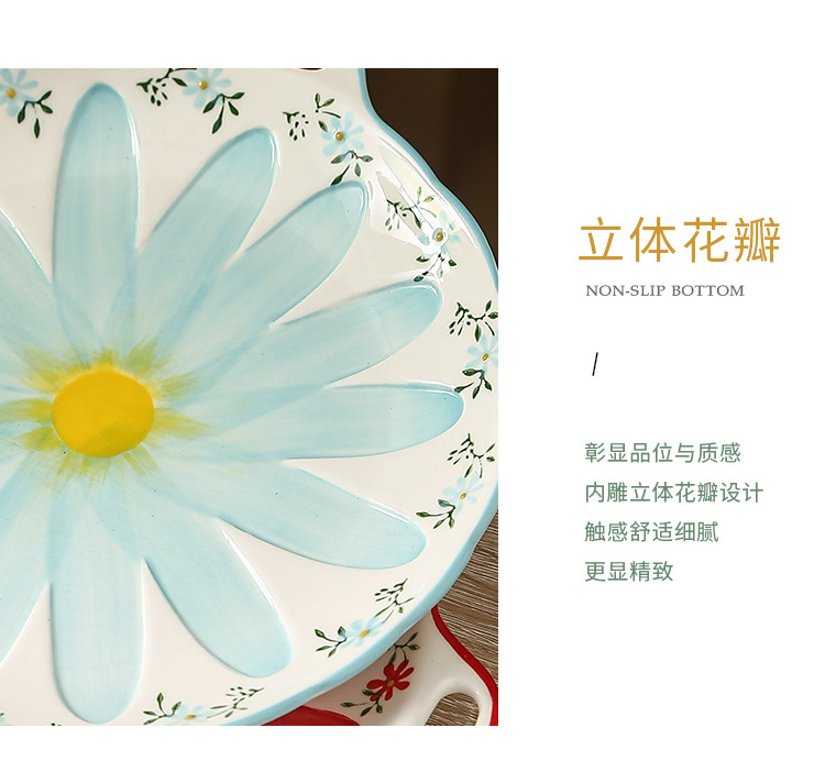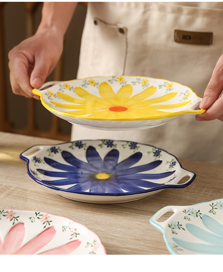 手绘花朵双耳浅盘餐盘釉下彩陶瓷盘子菜盘家用早餐盘水果盘沙拉盘