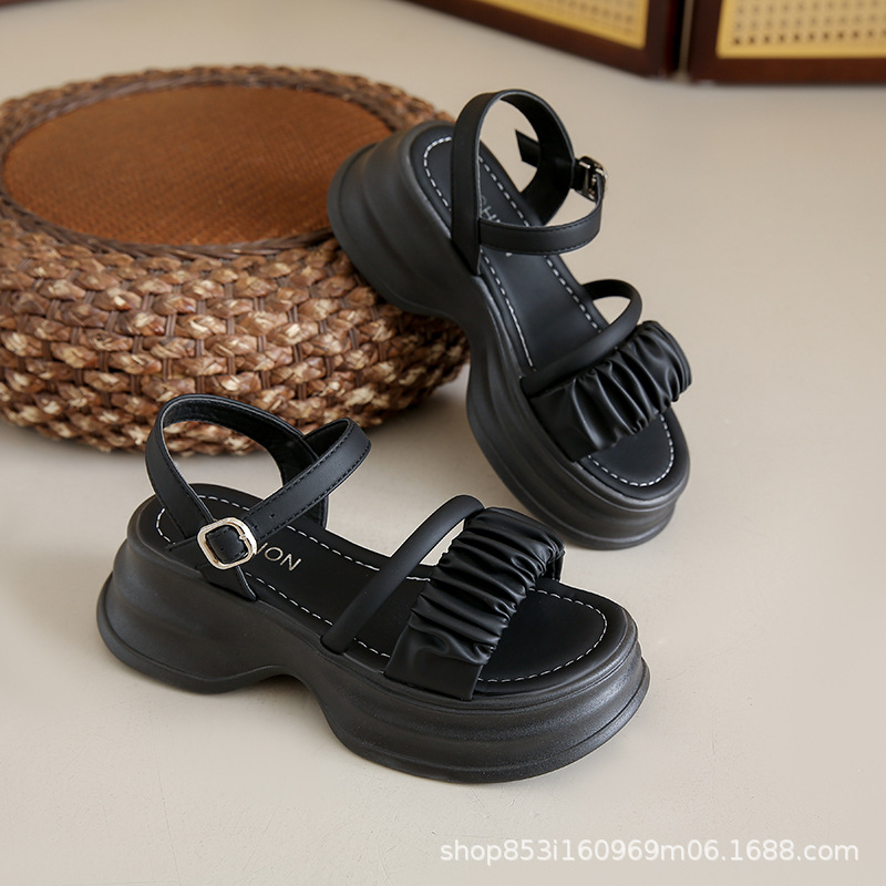 褶皱露趾一字扣凉鞋女2025新款夏季外穿配裙子仙女风沙滩凉鞋女