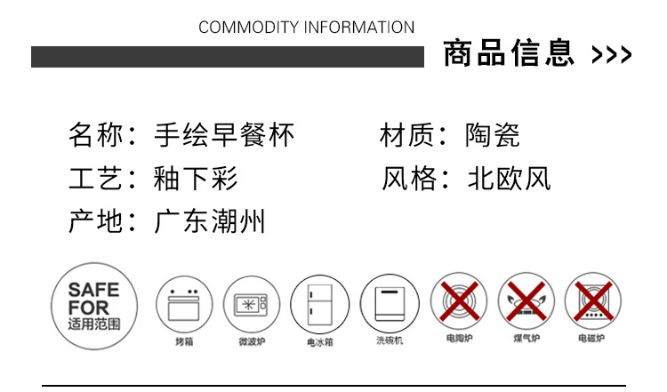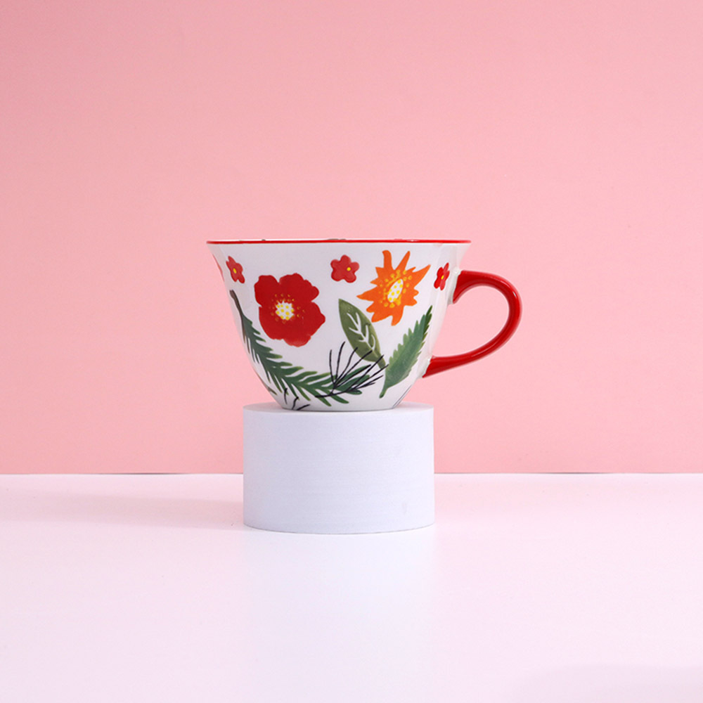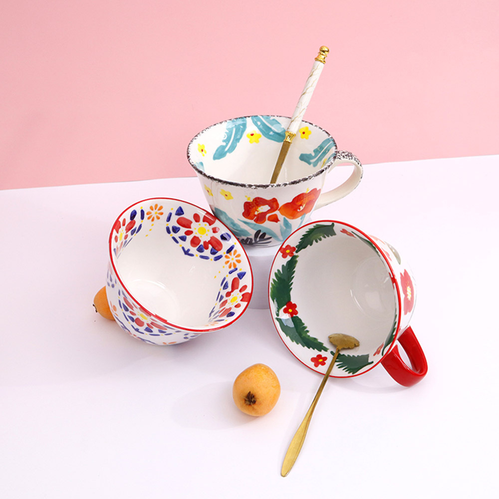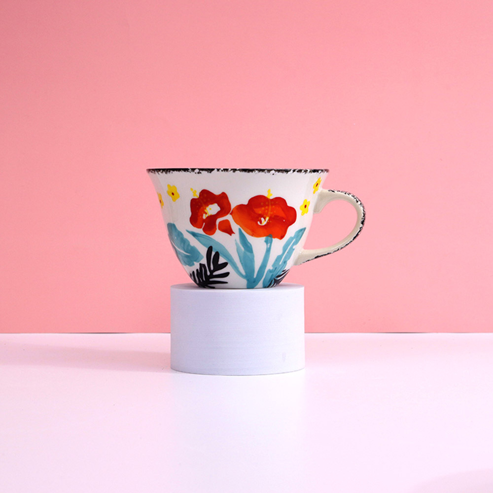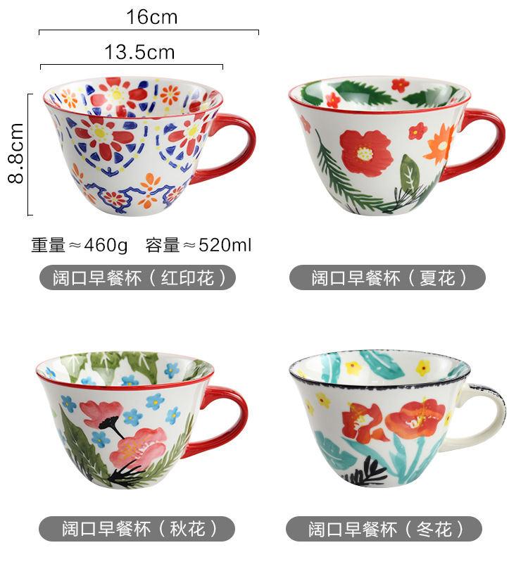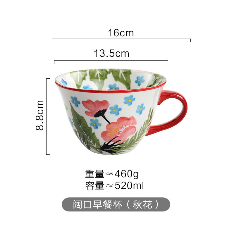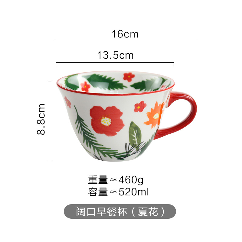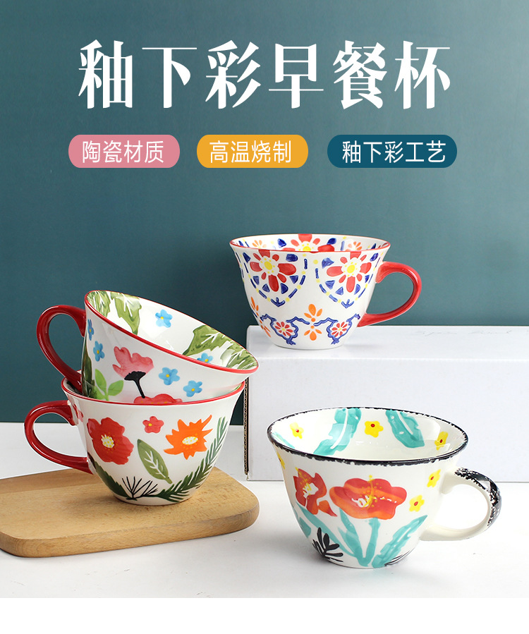 定制手绘印花阔口早餐杯 北欧风釉下彩陶瓷马克杯咖啡杯可印LOGO