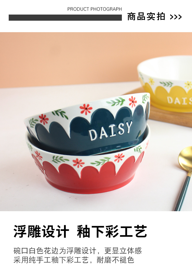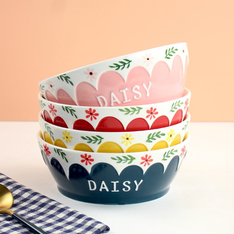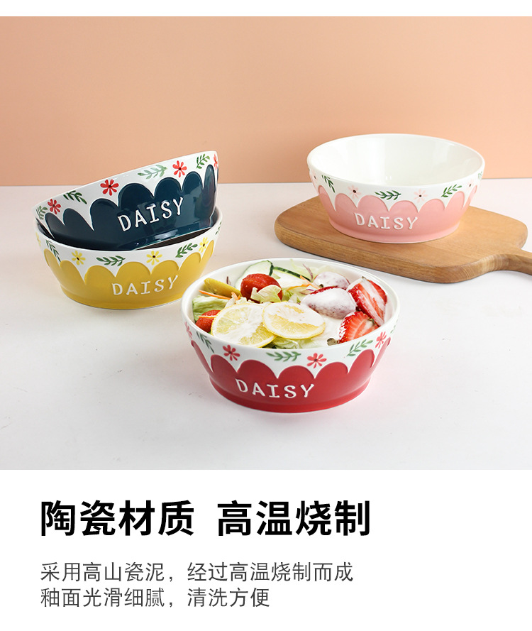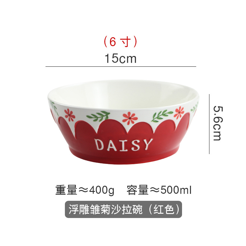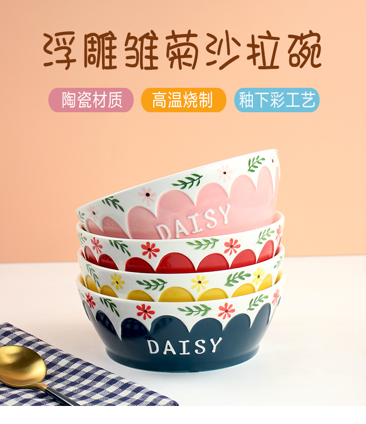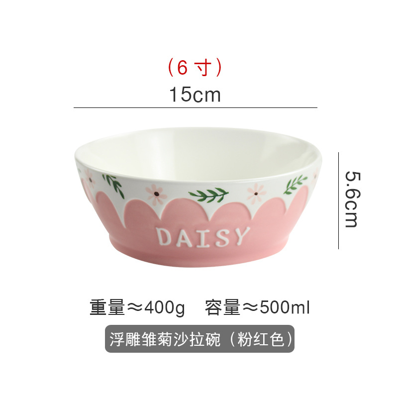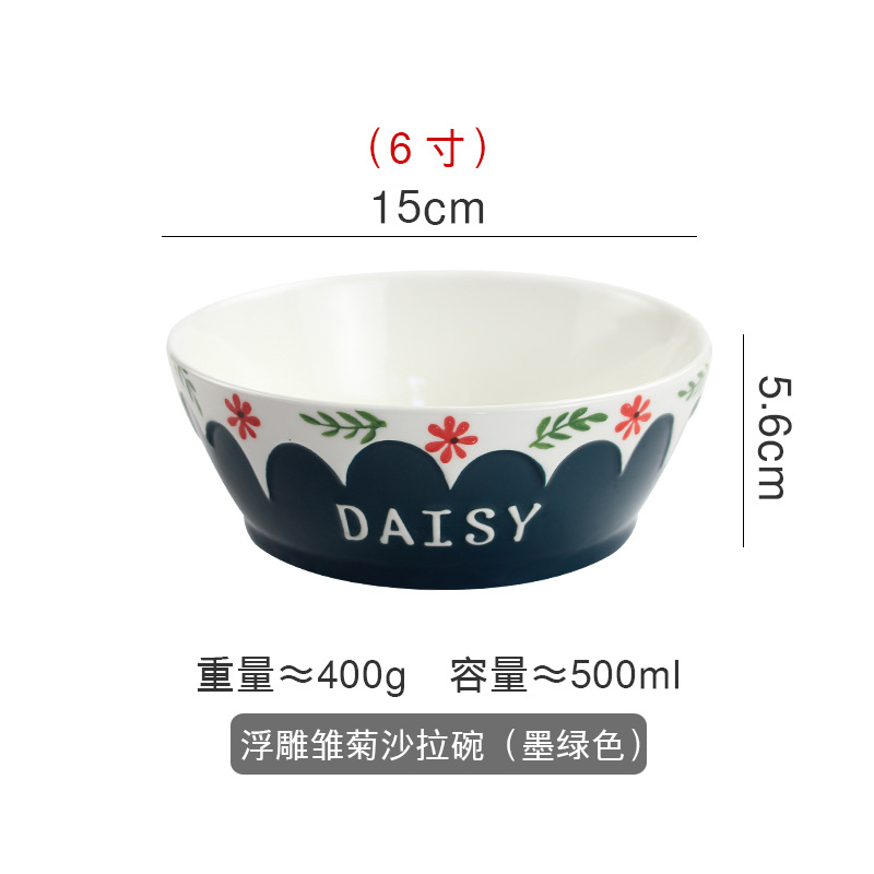 批发浮雕手绘雏菊6寸沙拉碗陶瓷碗家用创意陶瓷餐具甜品碗早餐碗
