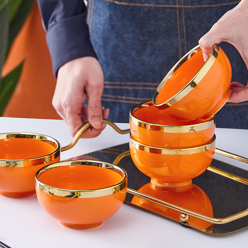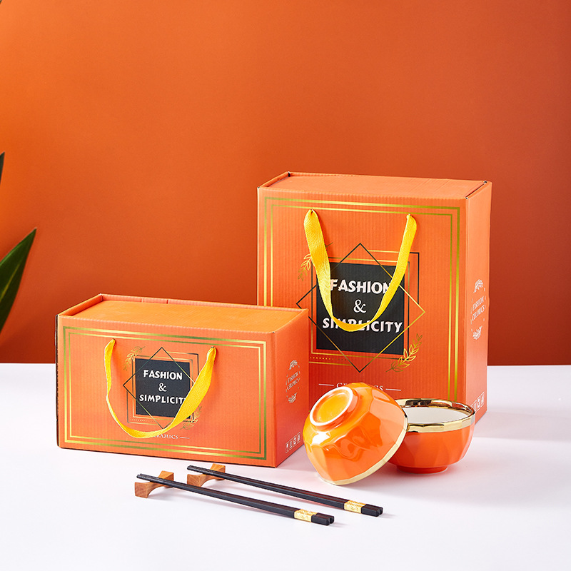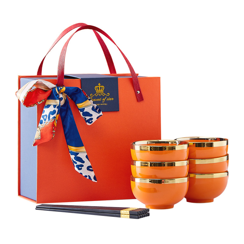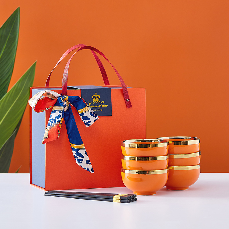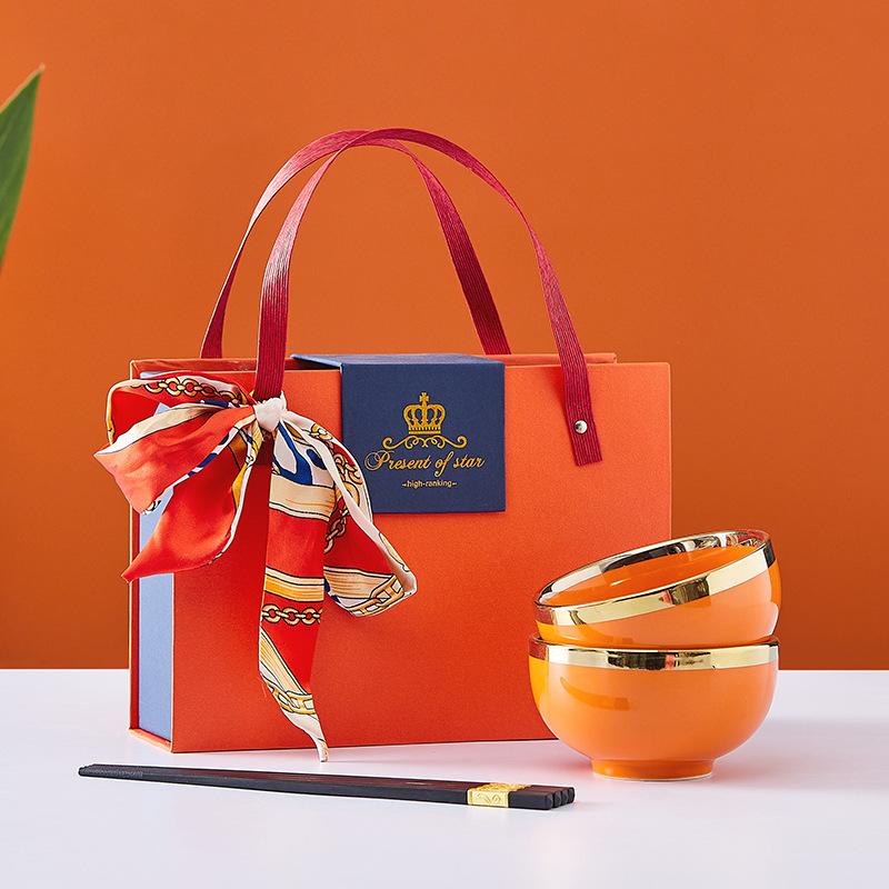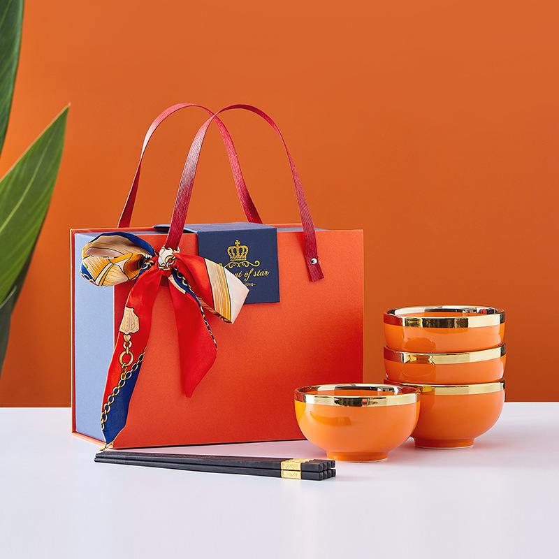 蒂范陶瓷碗筷开业礼品电镀金边橙色饭碗礼盒婚庆情人节家用碗批发
