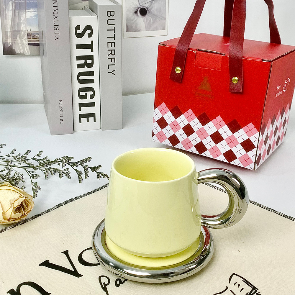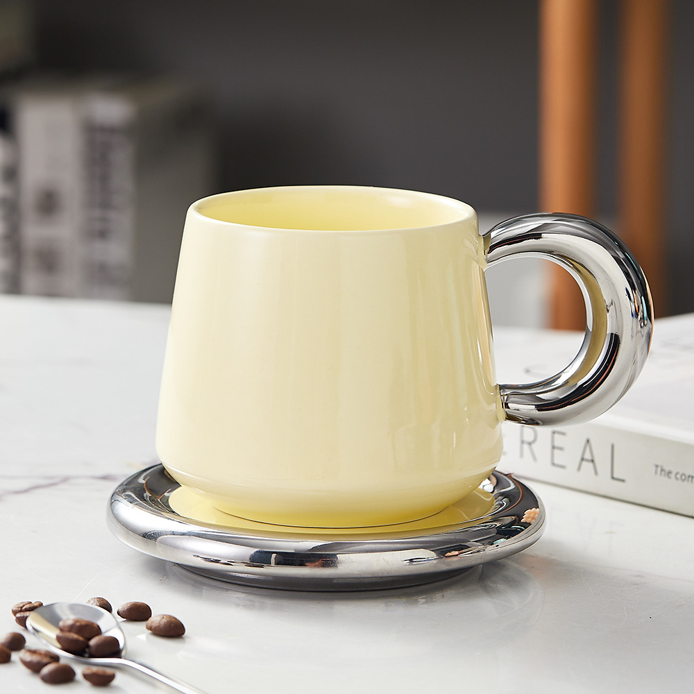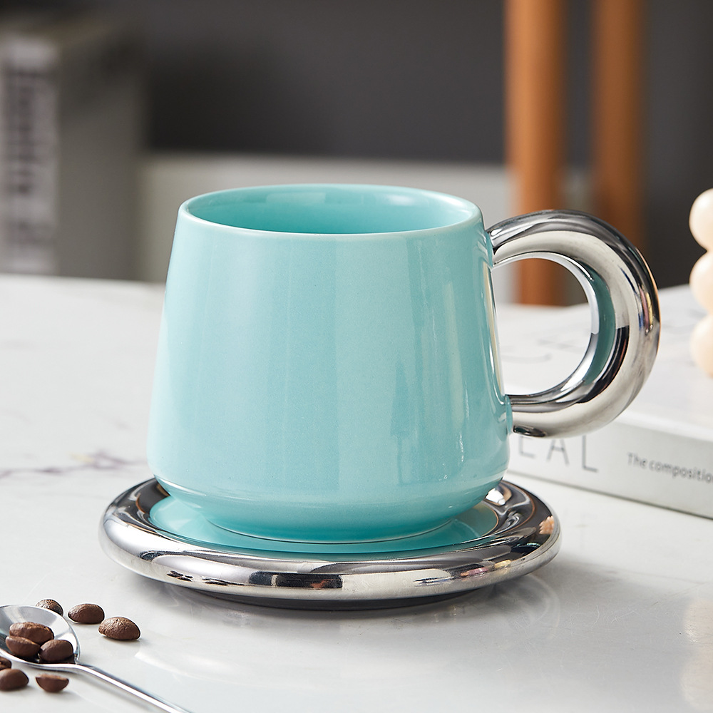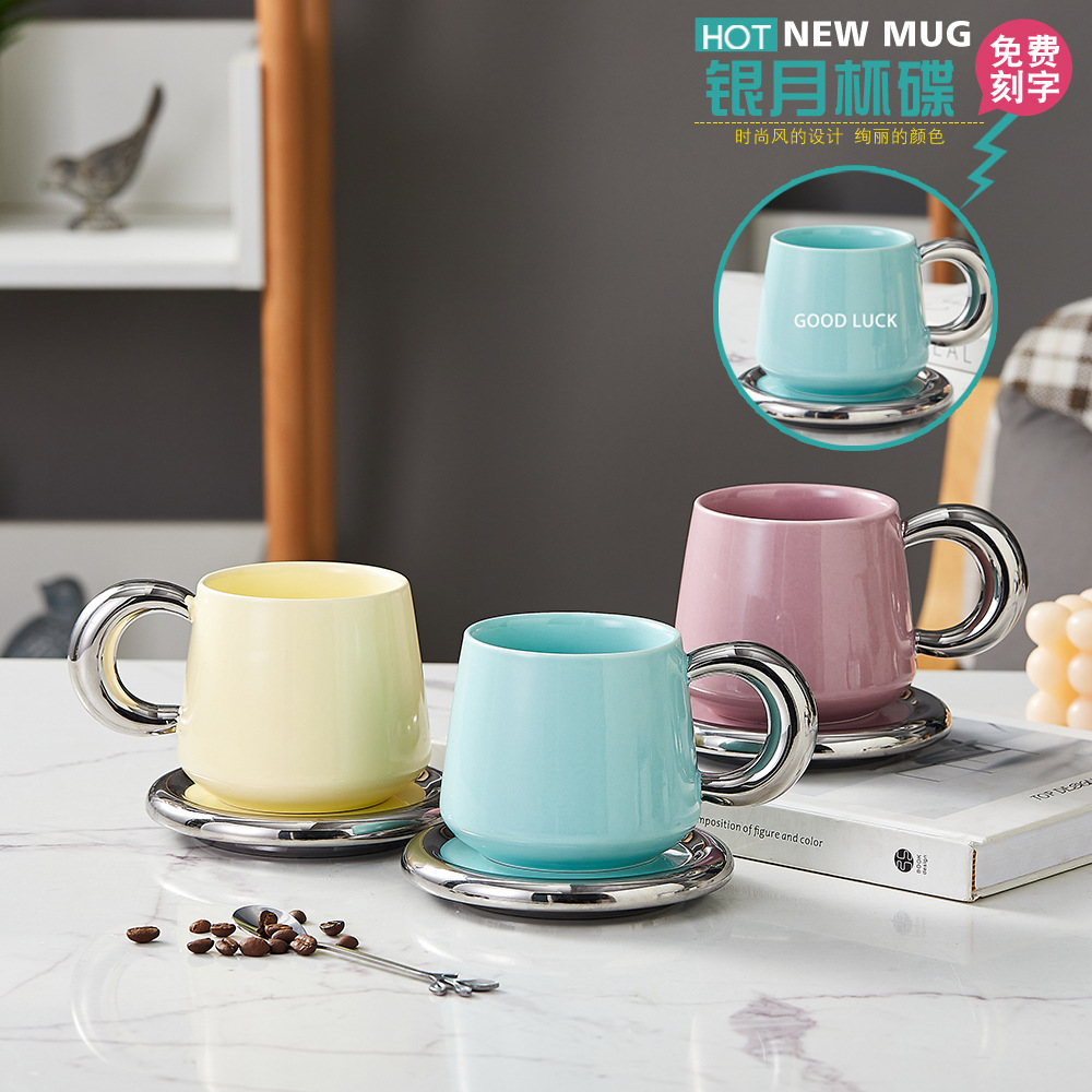 蒂范北欧陶瓷杯碟镀银色创意马克杯办公咖啡杯碟跨境情侣杯礼盒装