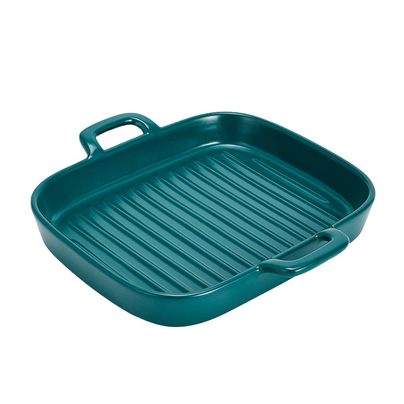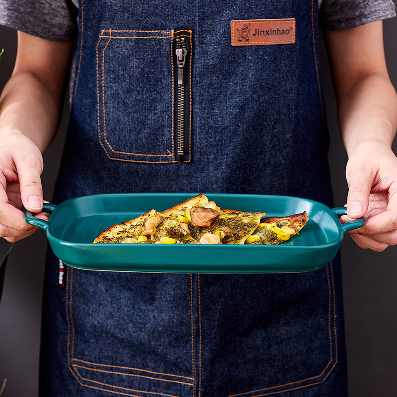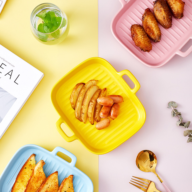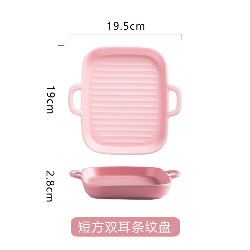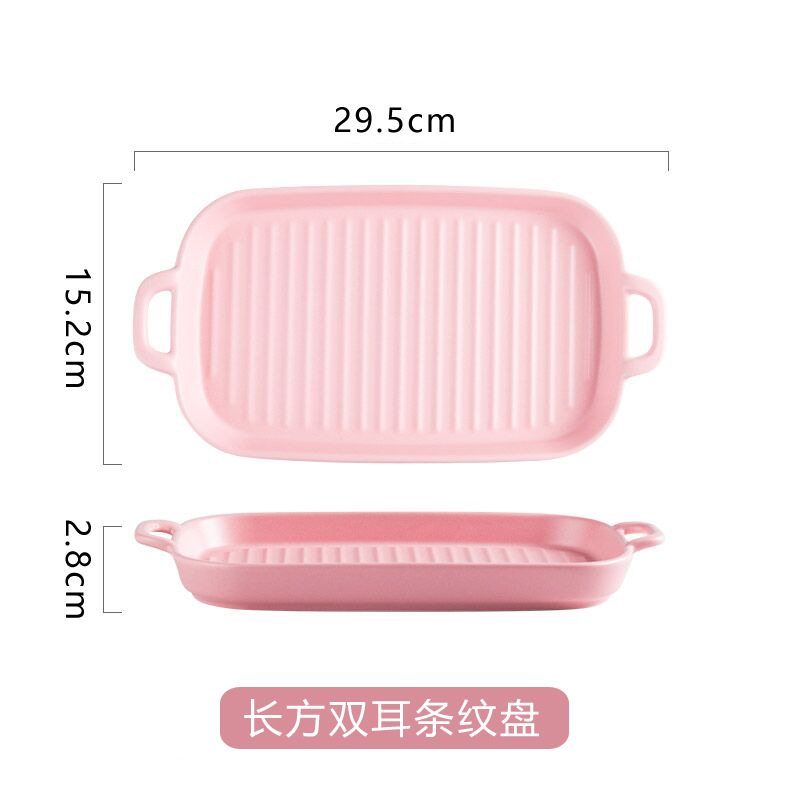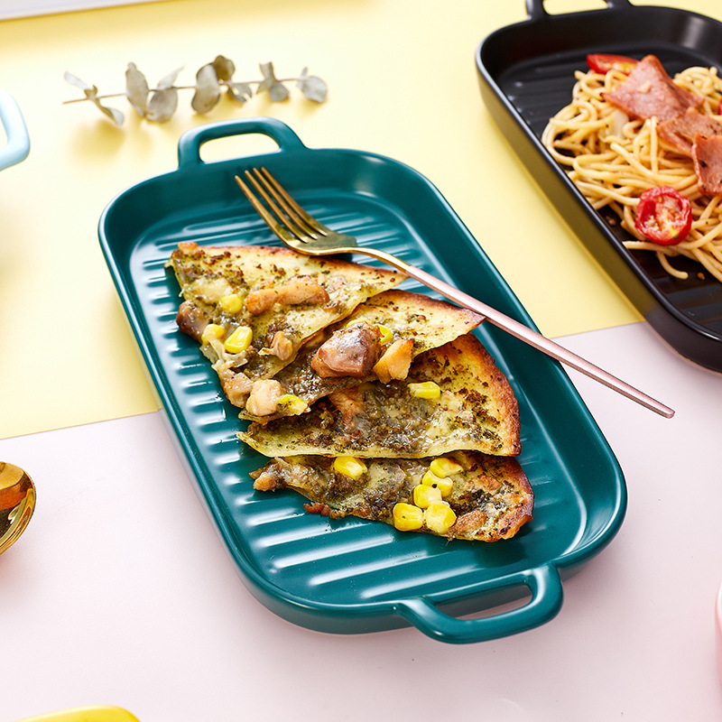 蒂范厂家批发陶瓷条纹双耳烤盘西餐意面家用餐具北欧长方盘子跨境