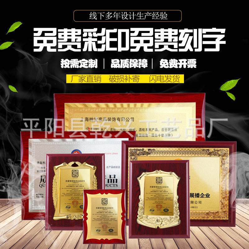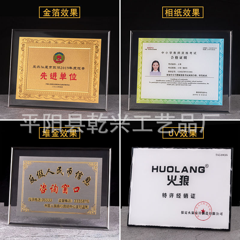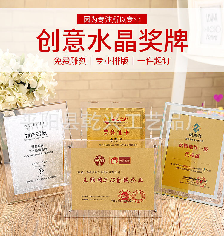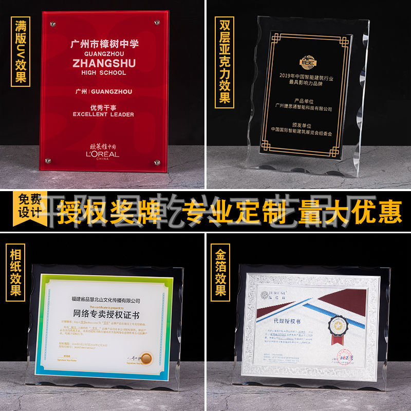 亚克力奖牌透明冻水晶金箔奖牌不锈钢钛金铜牌授权牌证书做广告牌