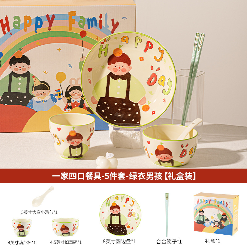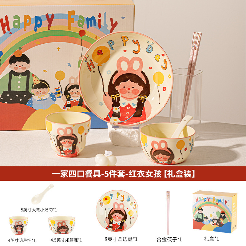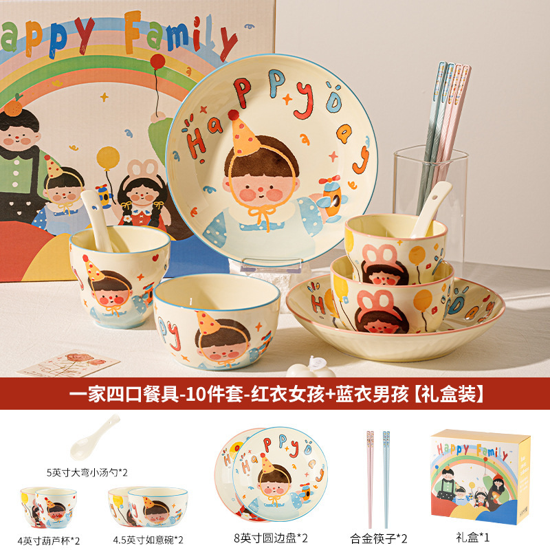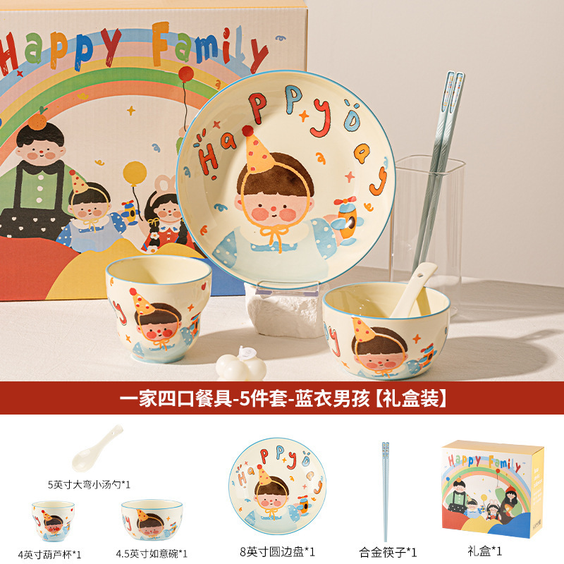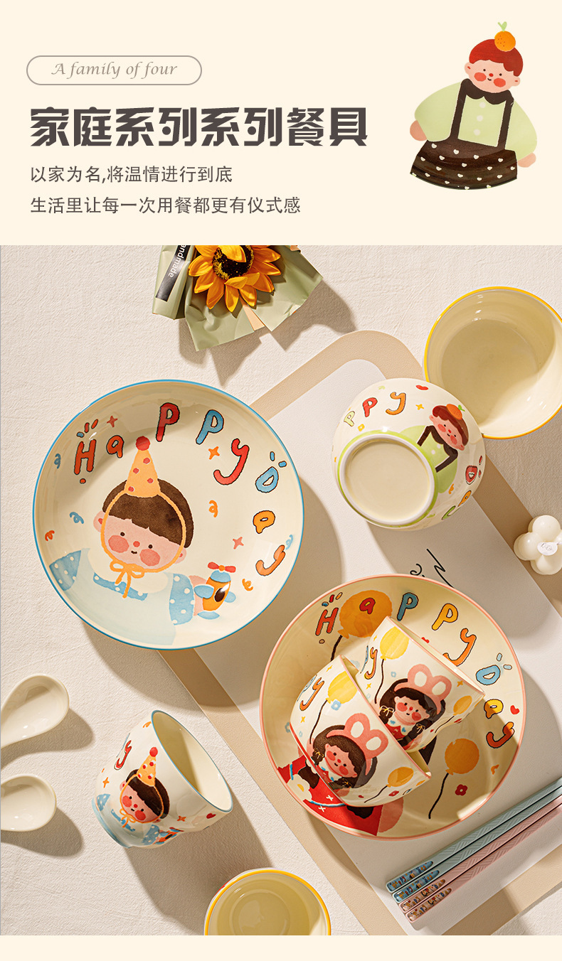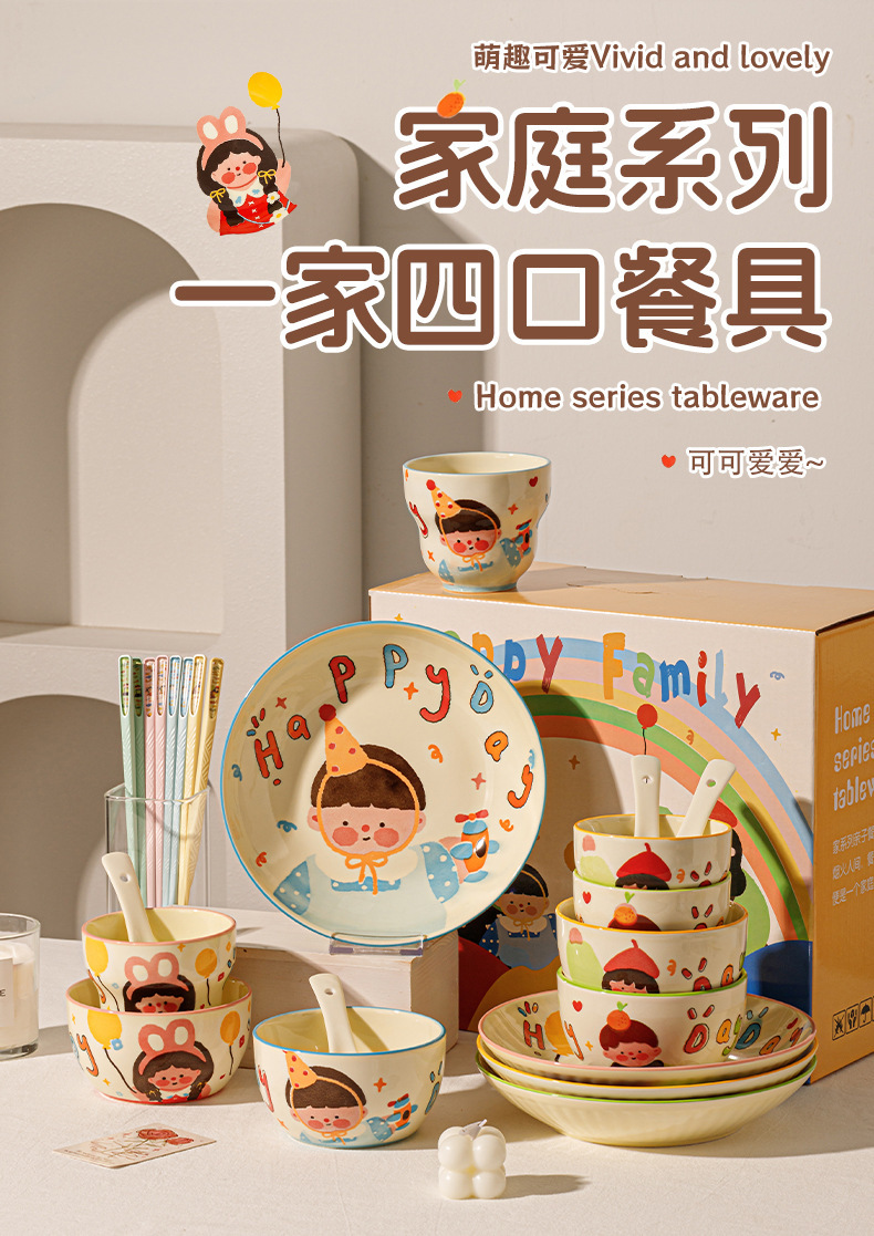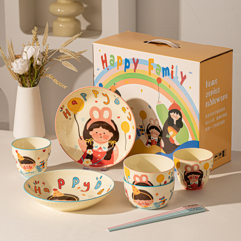 一家四口亲子餐具套装送礼家用碗盘陶瓷碗卡通米饭碗盘子碗碟套装