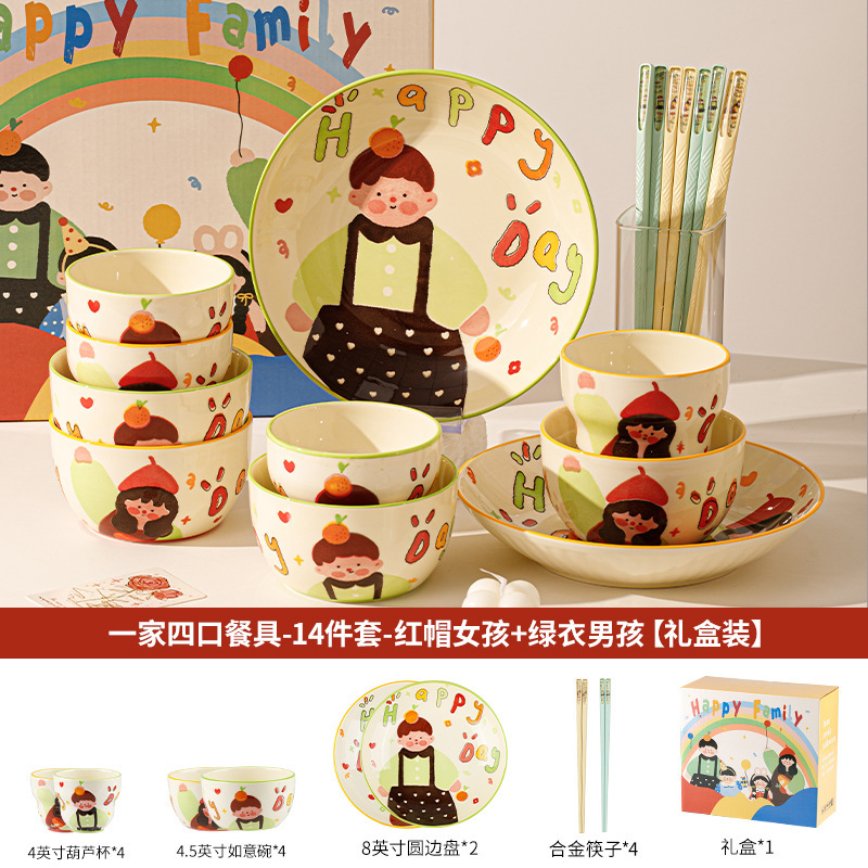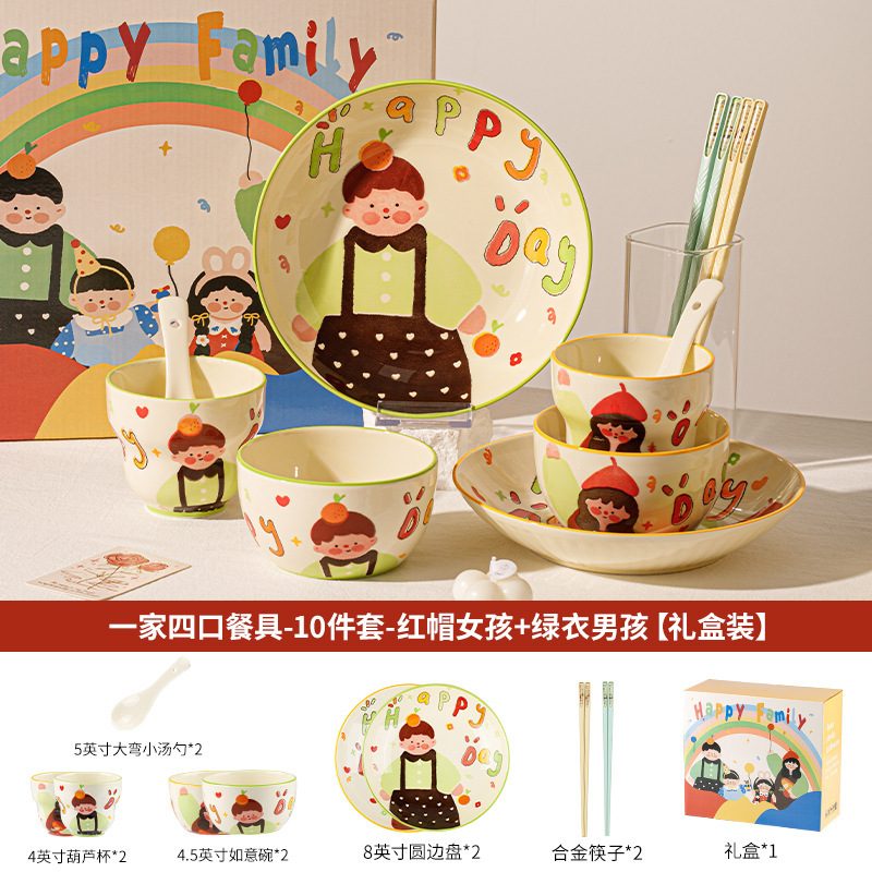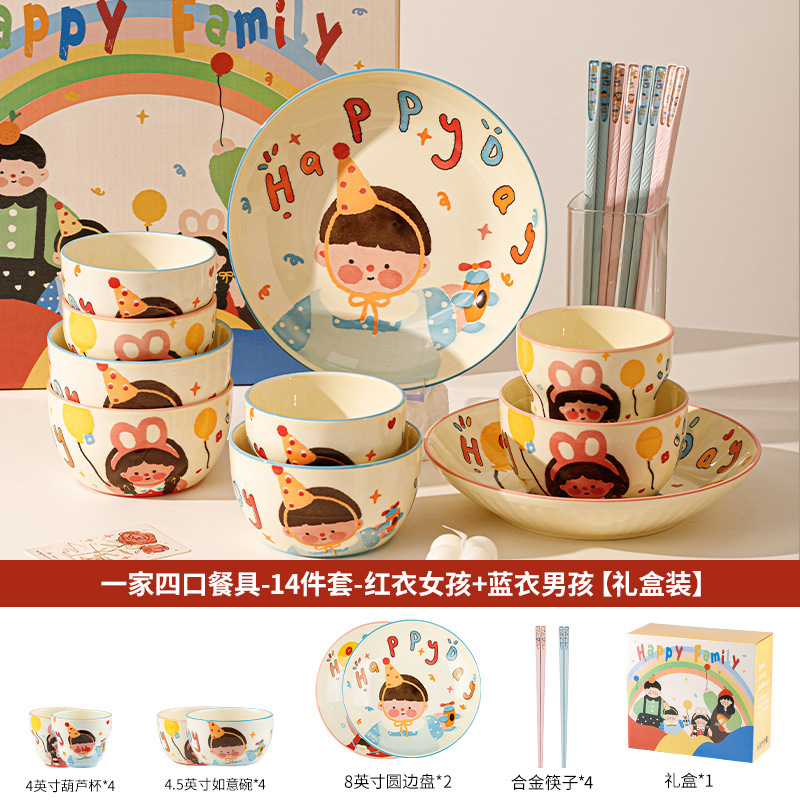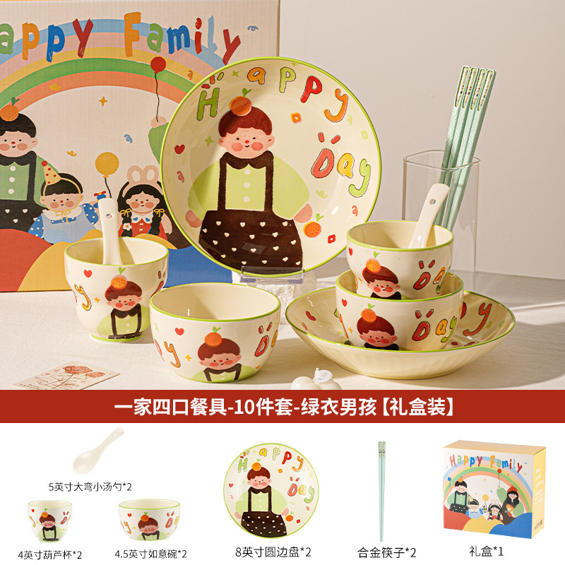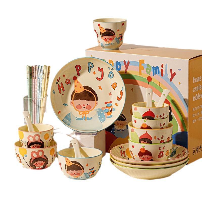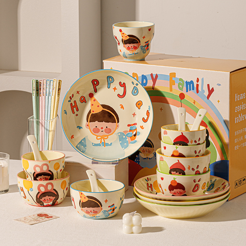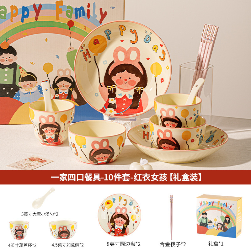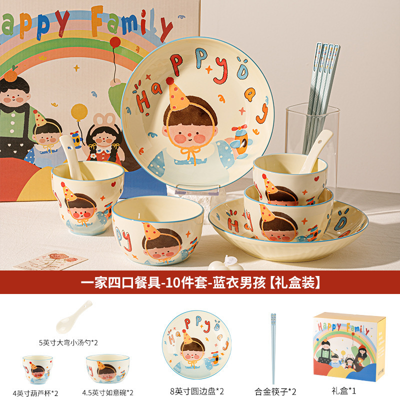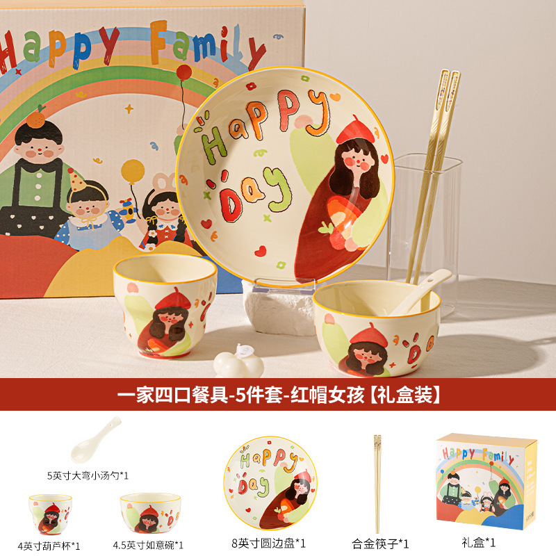 一家四口亲子餐具套装送礼家用碗盘陶瓷碗卡通米饭碗盘子碗碟套装