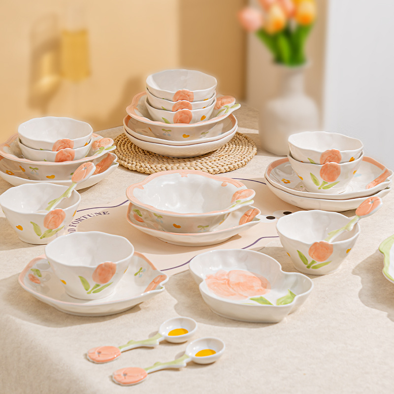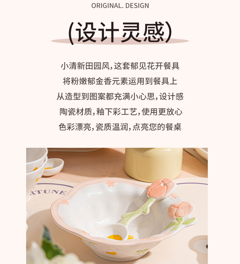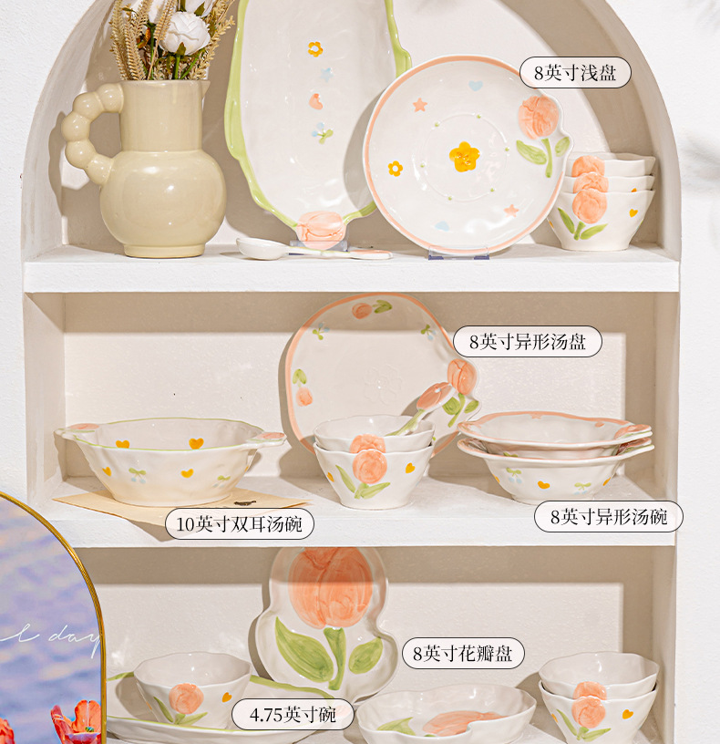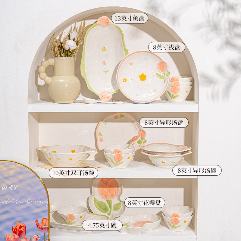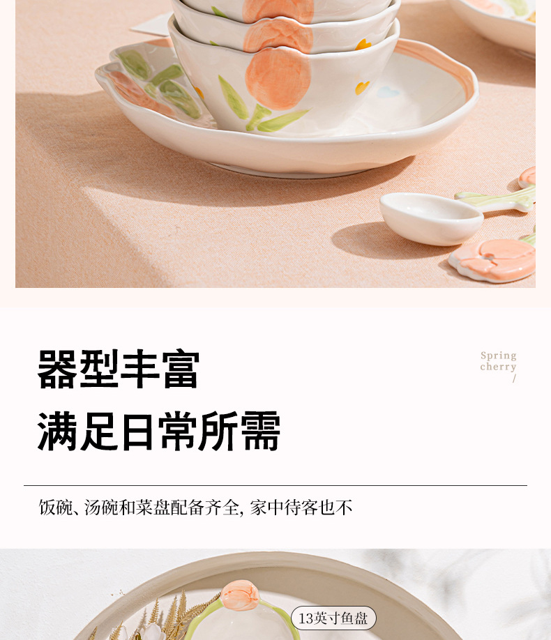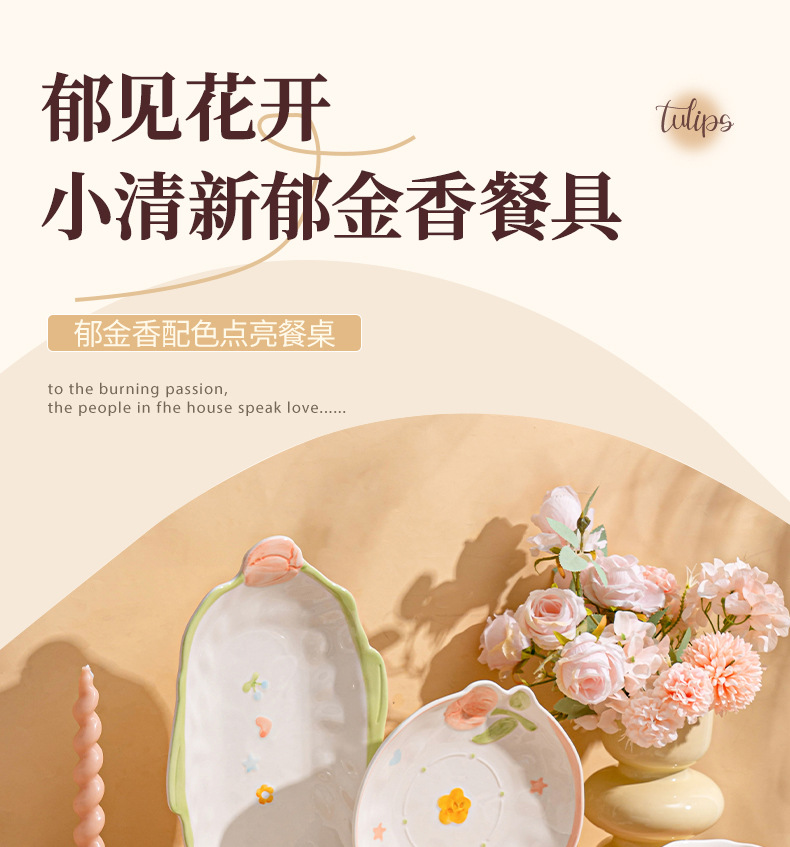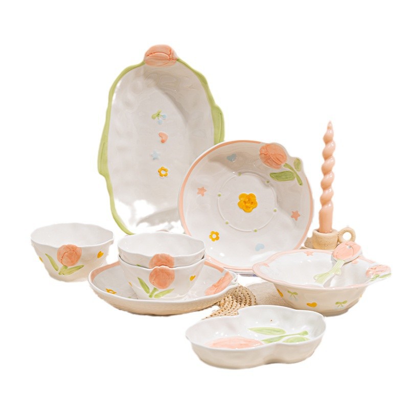 清新碗碟套装家用釉下彩陶瓷碗盘浮雕郁金香乔迁新居送礼陶瓷餐具