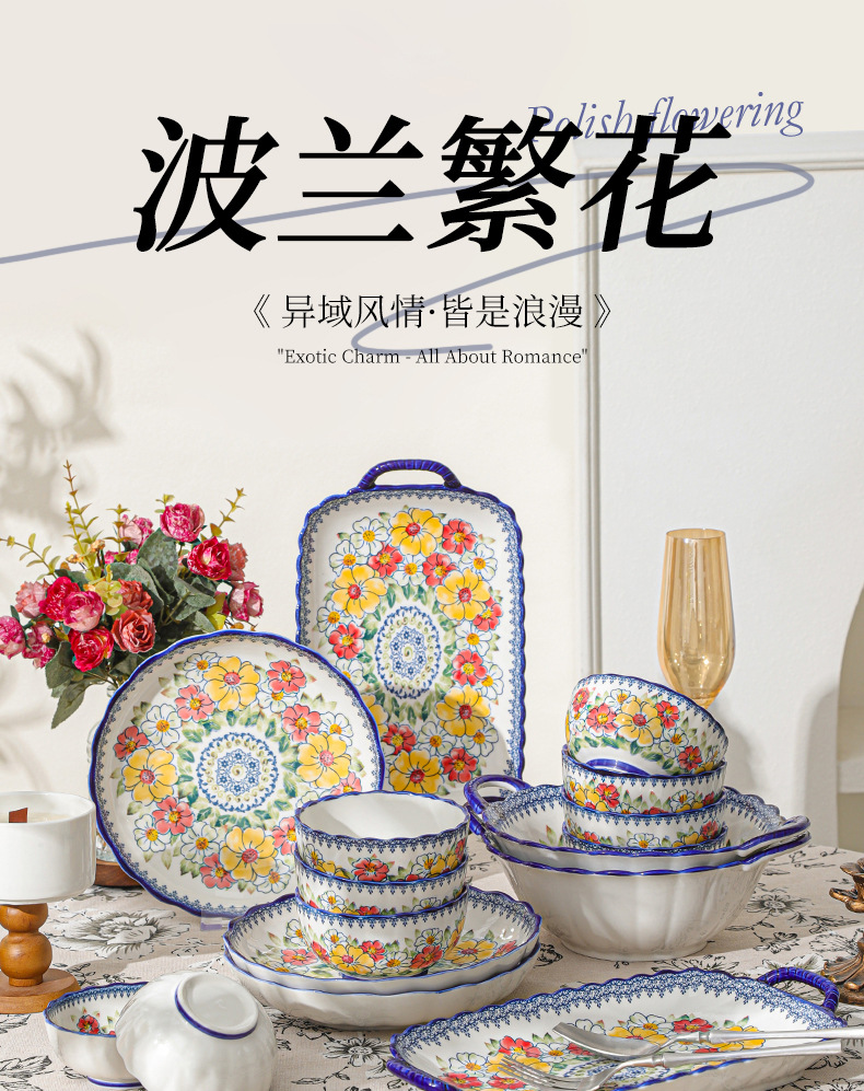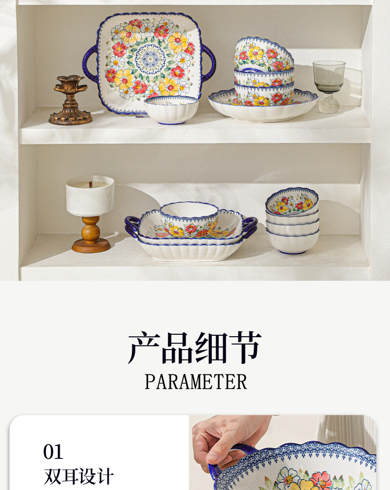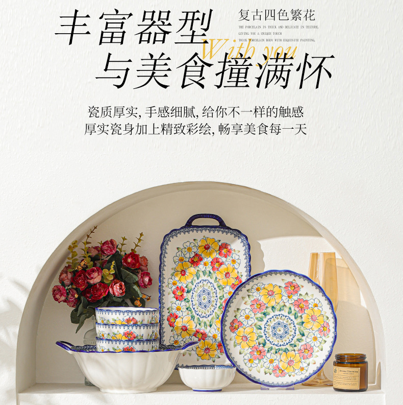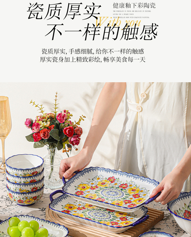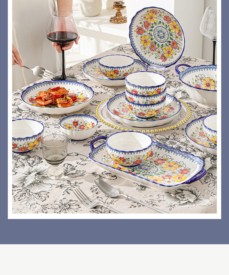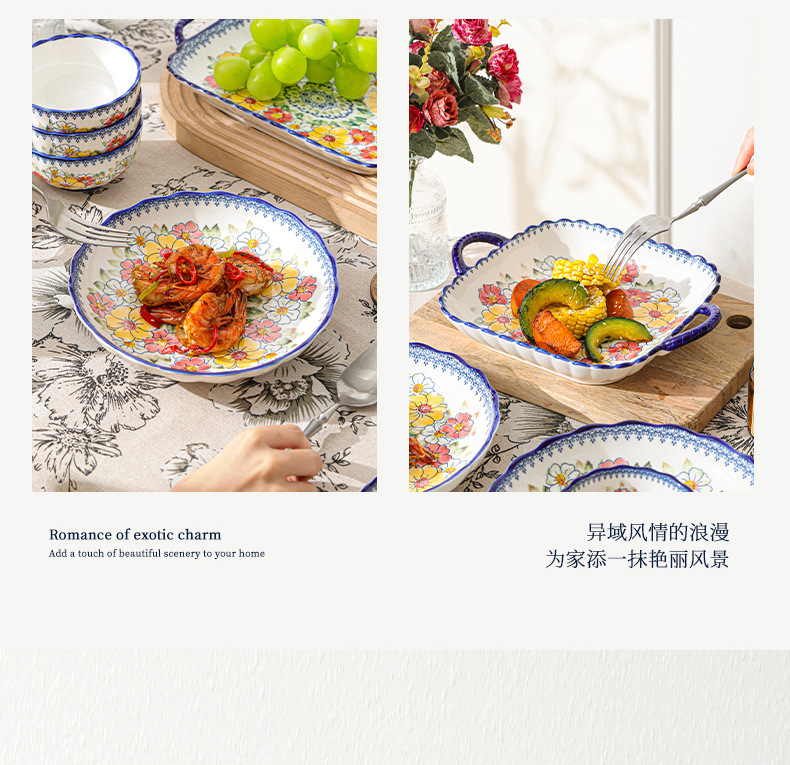 新款波西米亚碗碟套装家用批发跨境陶瓷餐具双耳汤碗盘子陶瓷碗
