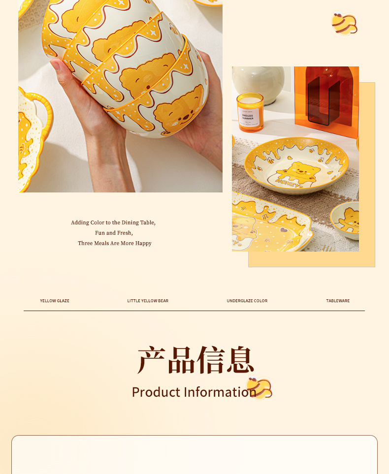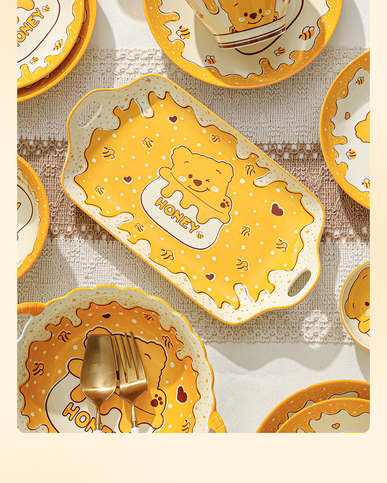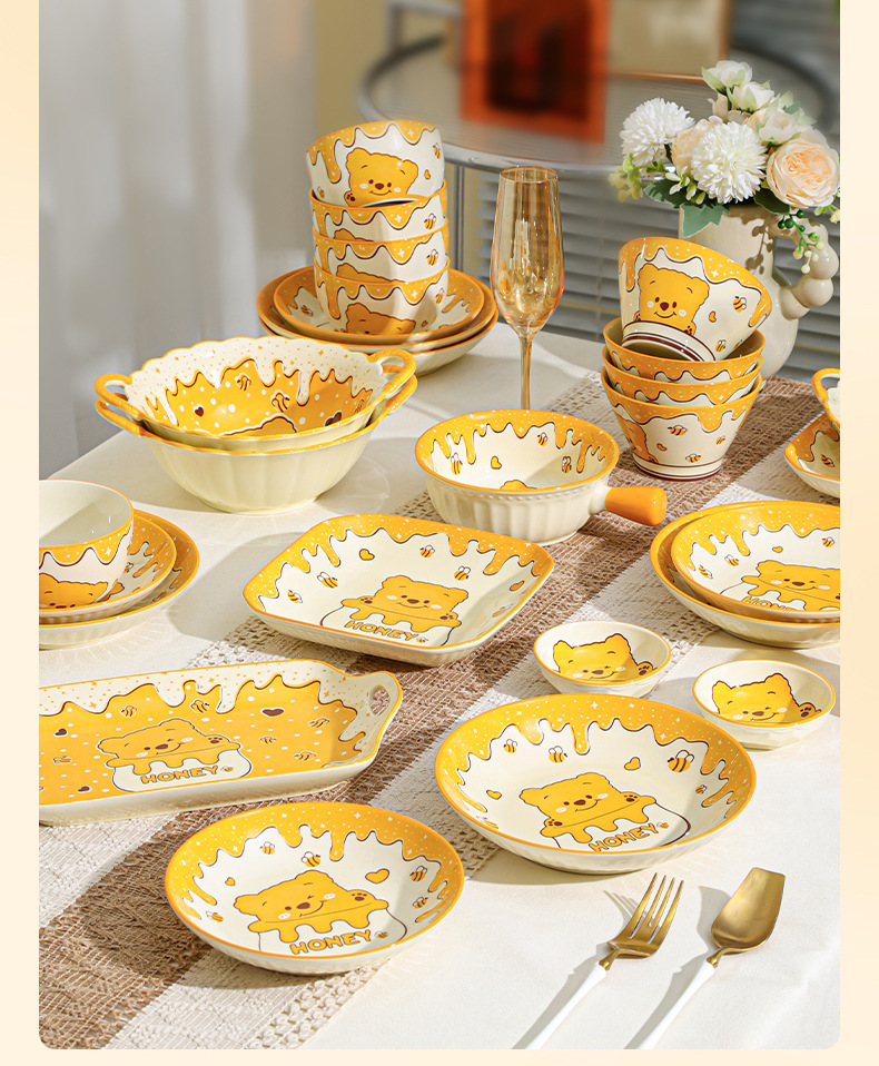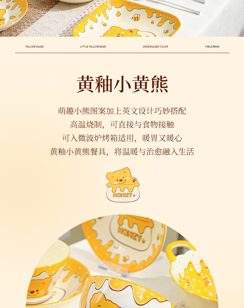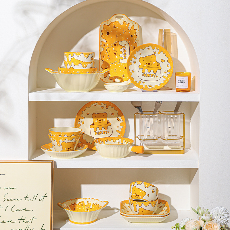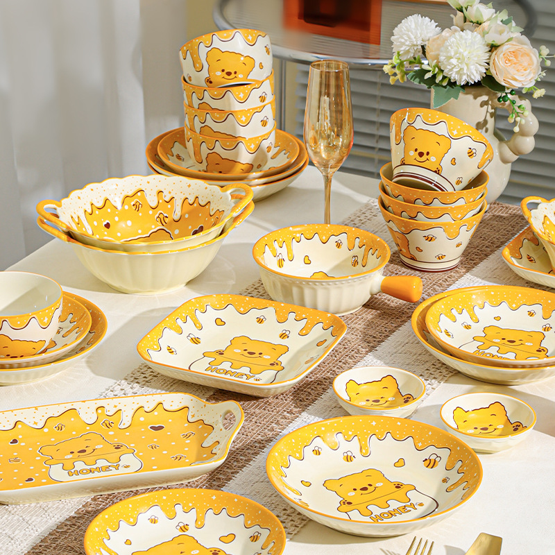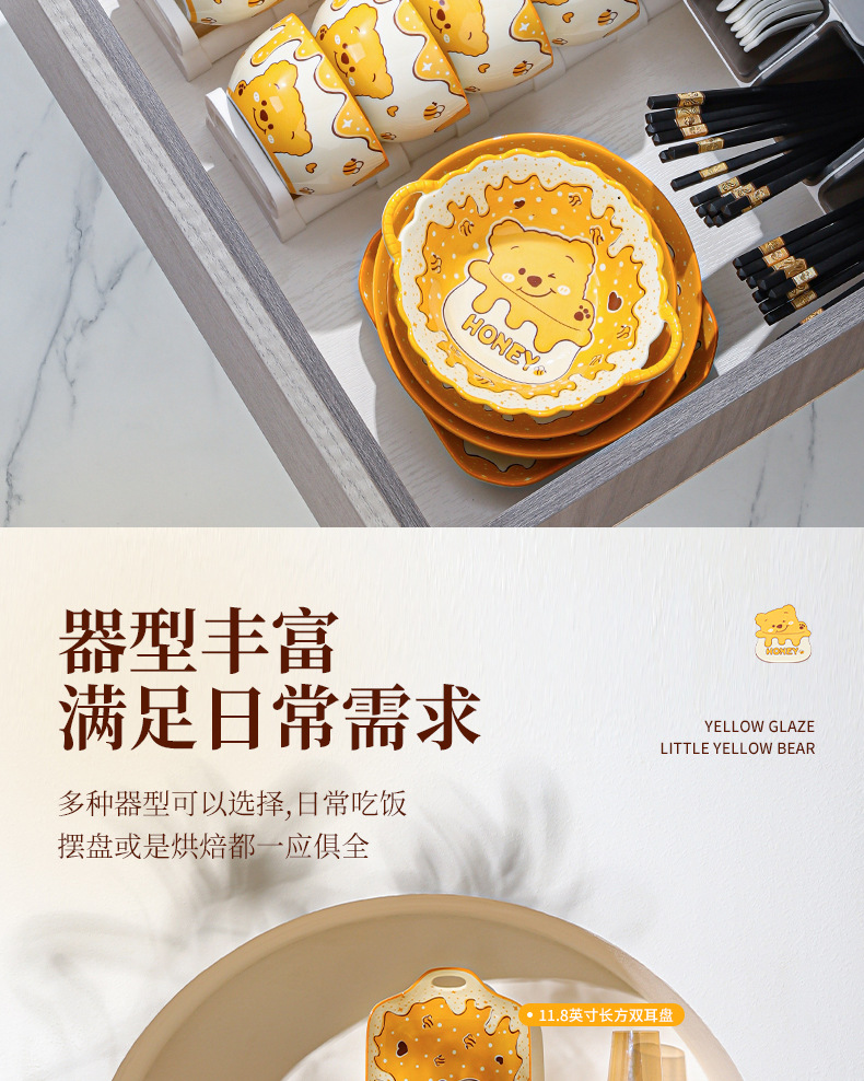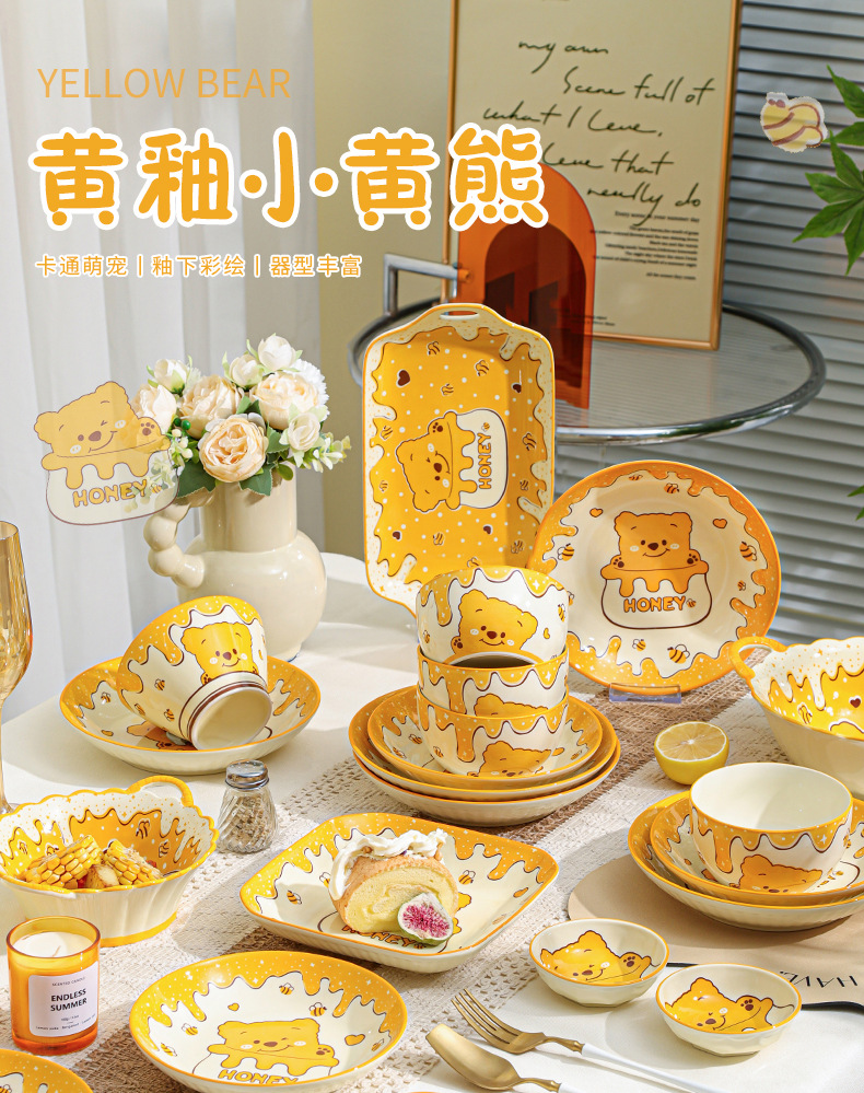 卡通可爱黄釉小黄熊陶瓷餐具盘子碗碟套装家用批发米饭碗菜盘鱼盘