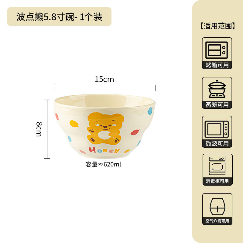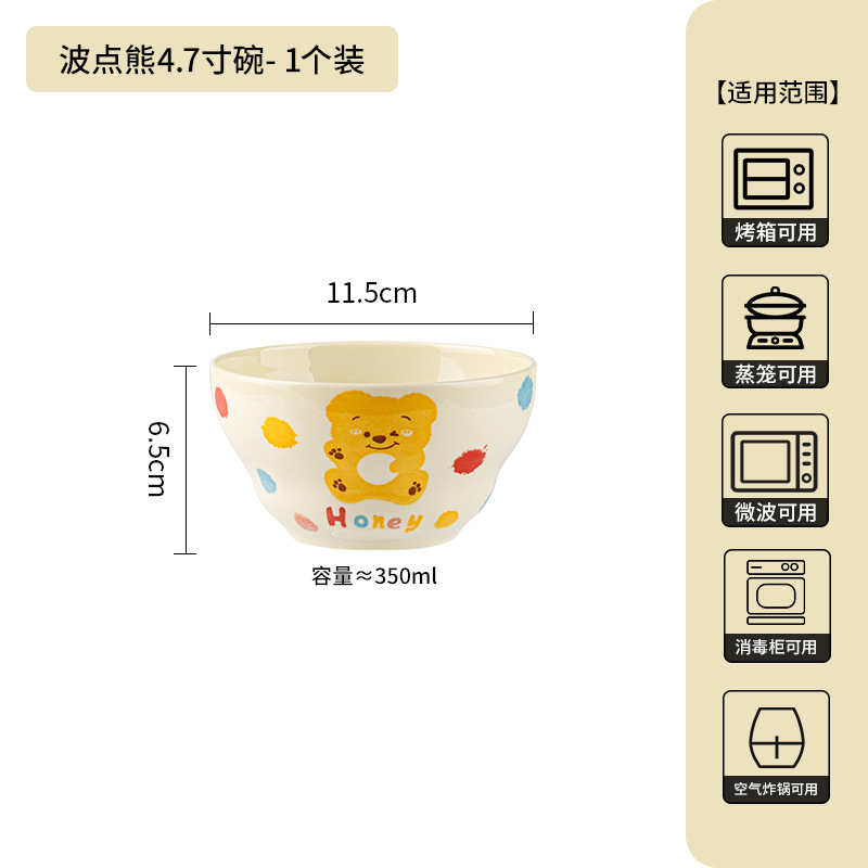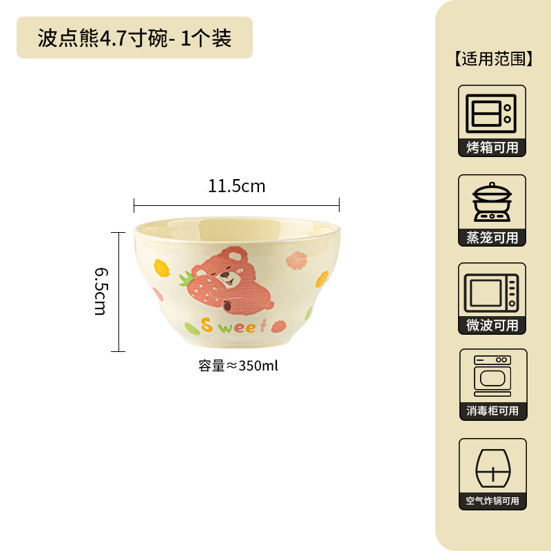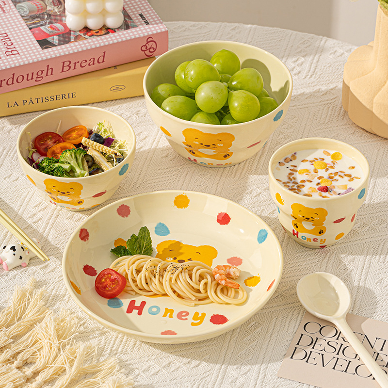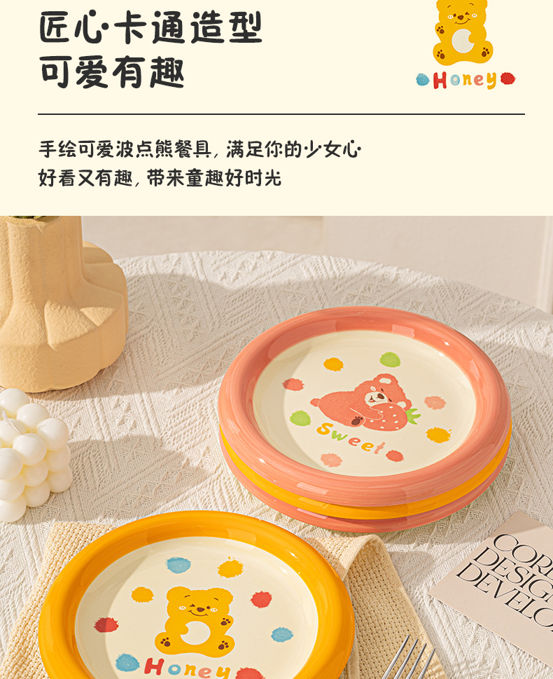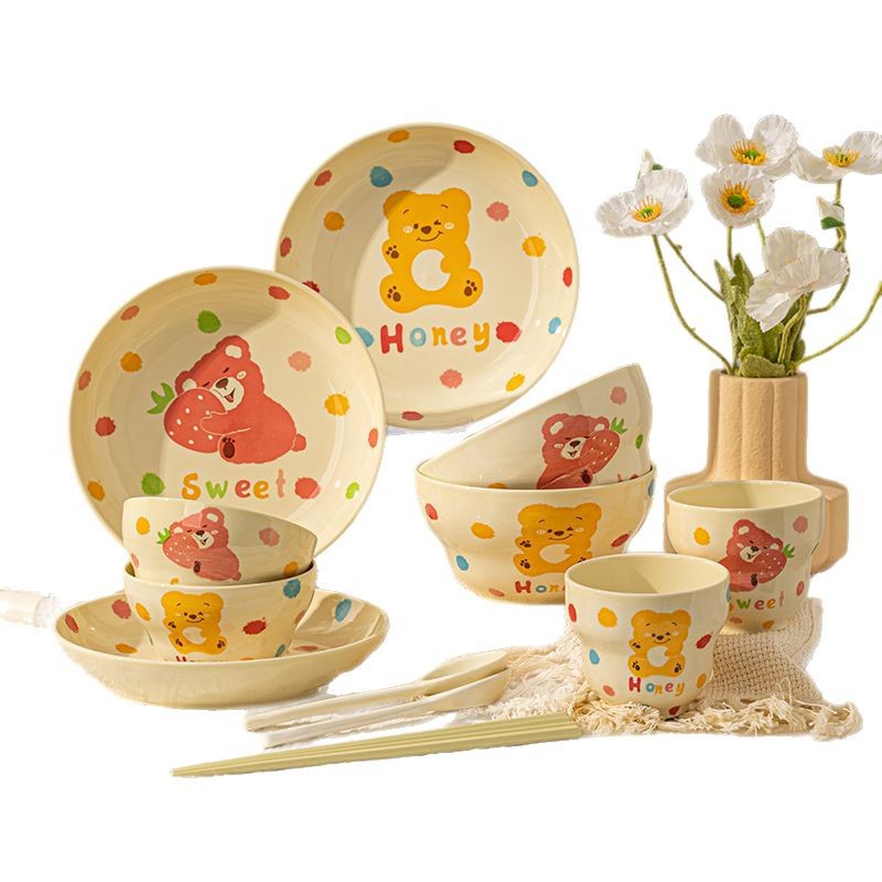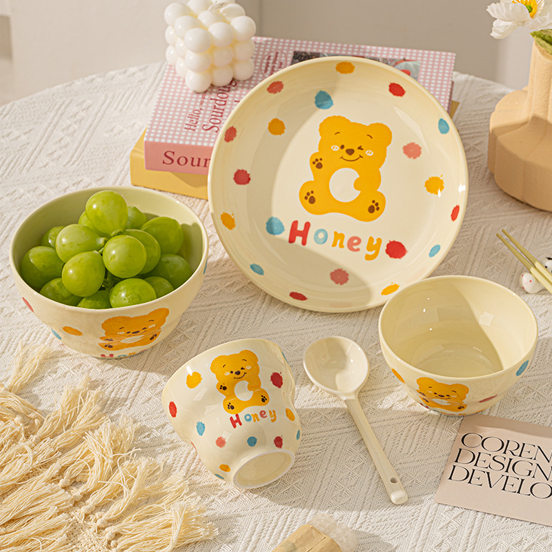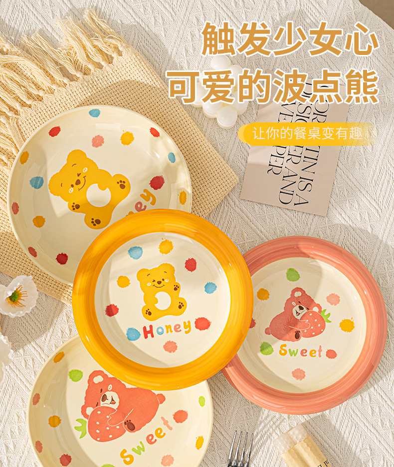 卡通创意波点熊家用陶瓷碗盘子可爱奶油风碗碟套装米饭碗陶瓷餐具