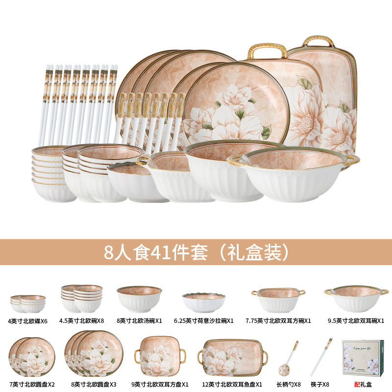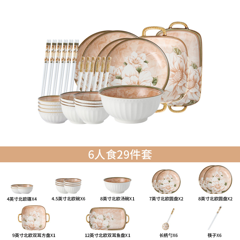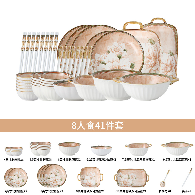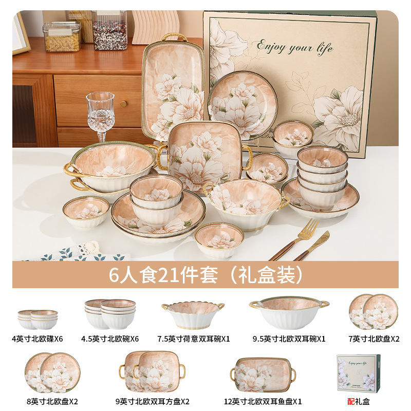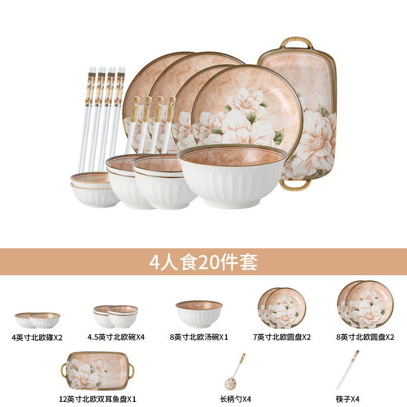 欧式ins风山茶花轻奢釉下彩陶瓷餐具套装碗盘子餐具套装全套家用