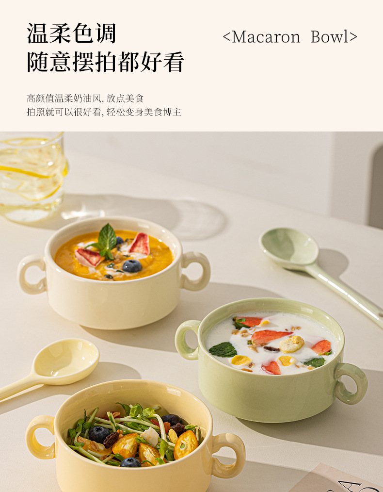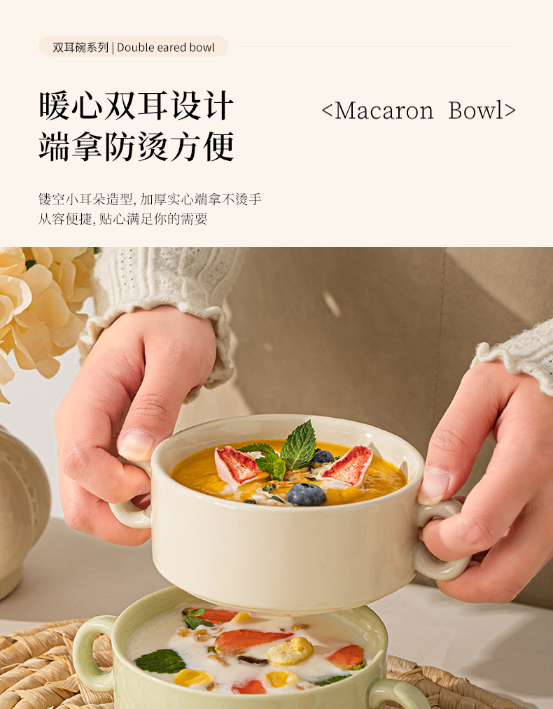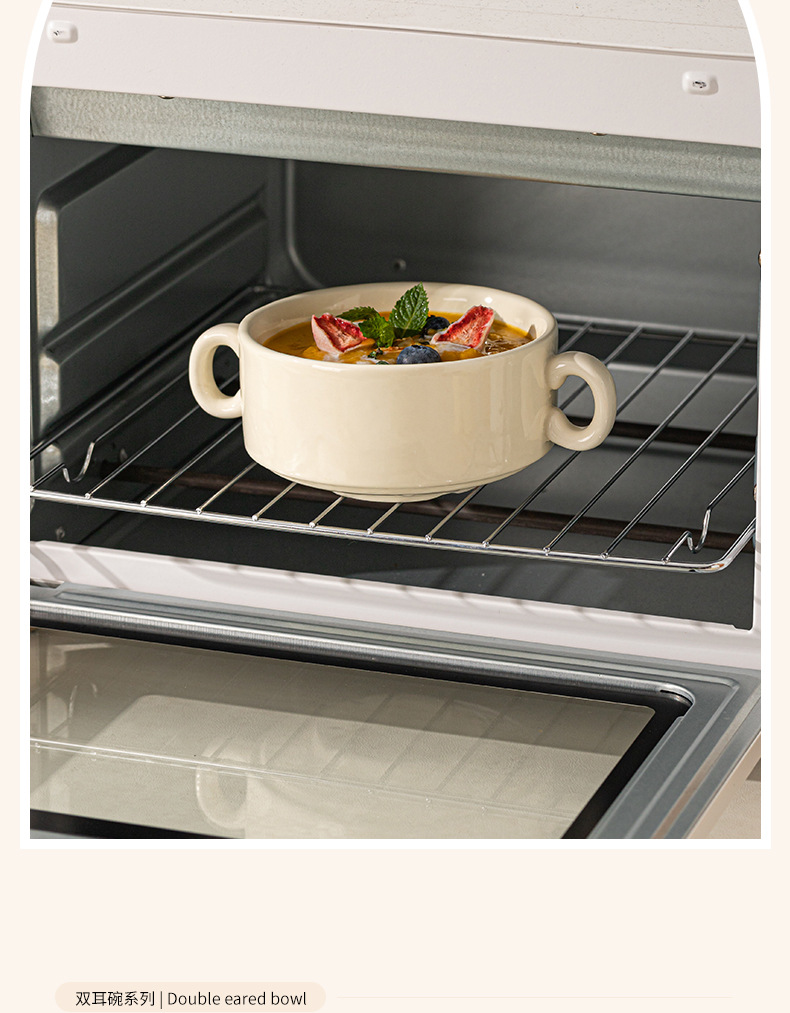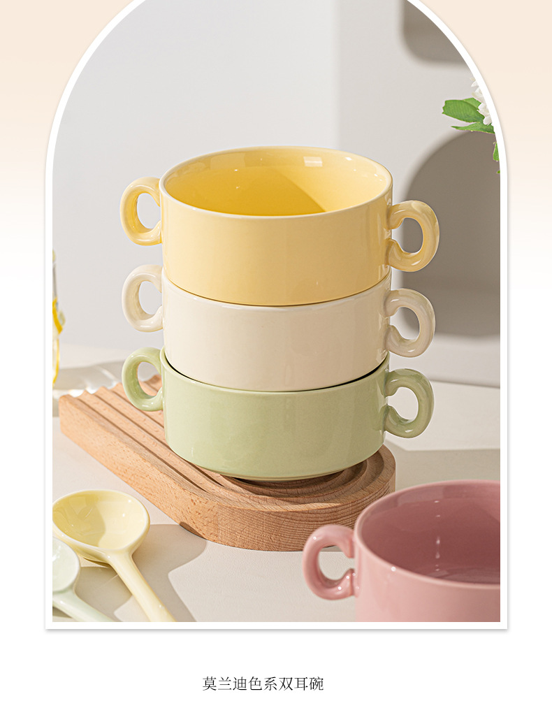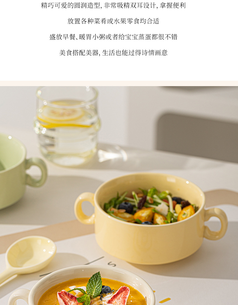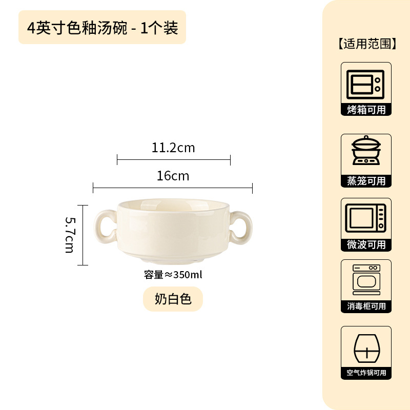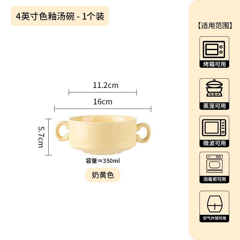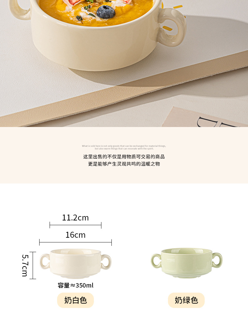 奶油色釉下彩双耳陶瓷碗家用高颜值轻奢汤碗蒸蛋碗酸奶碗陶瓷餐具