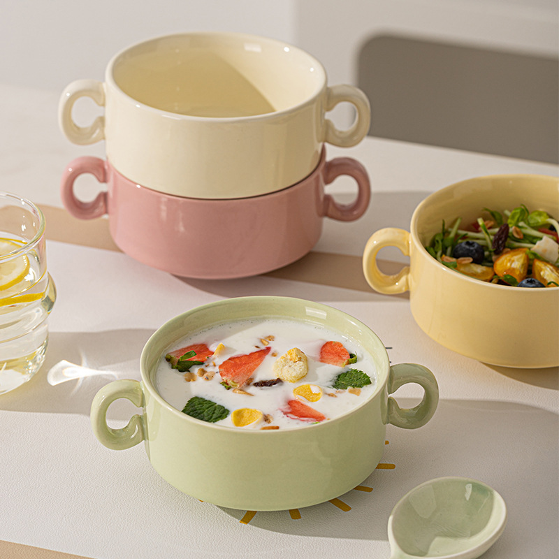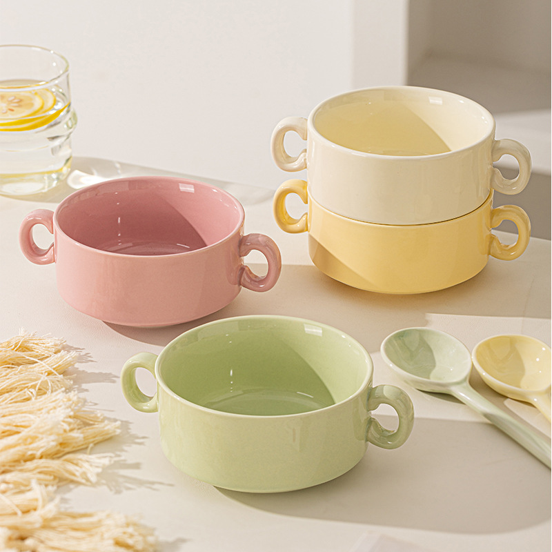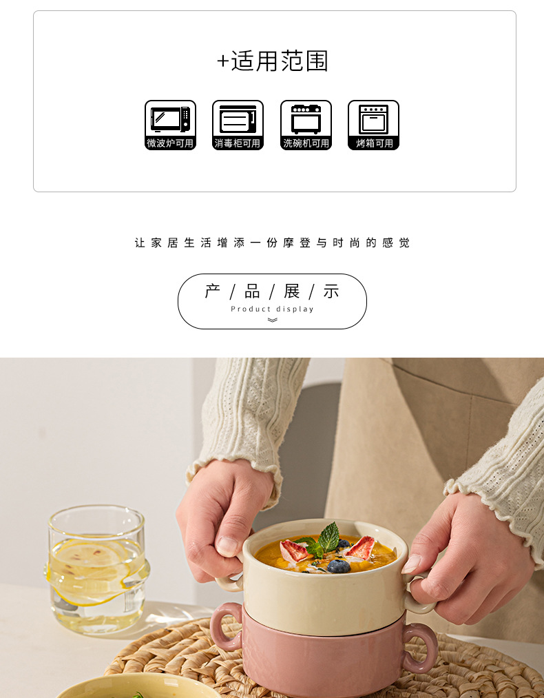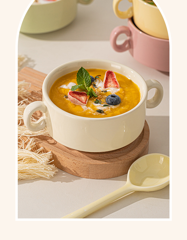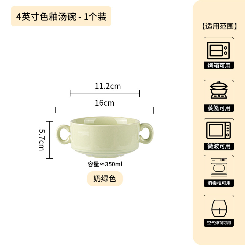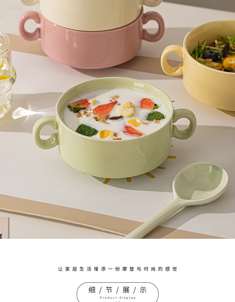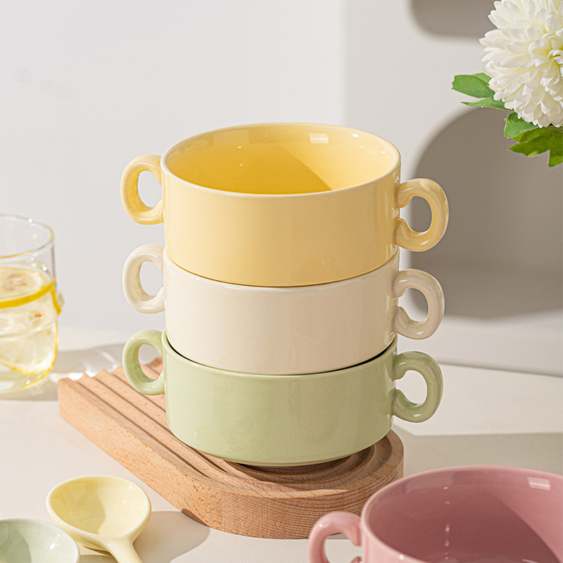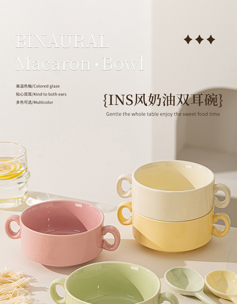 奶油色釉下彩双耳陶瓷碗家用高颜值轻奢汤碗蒸蛋碗酸奶碗陶瓷餐具