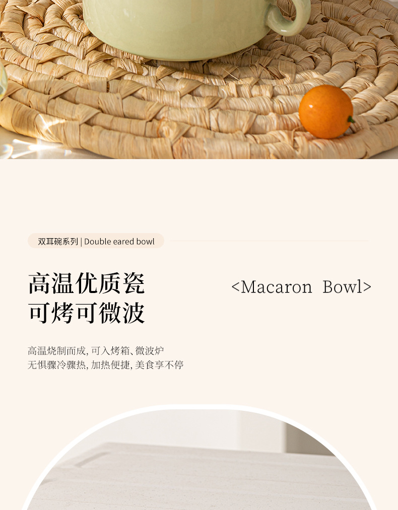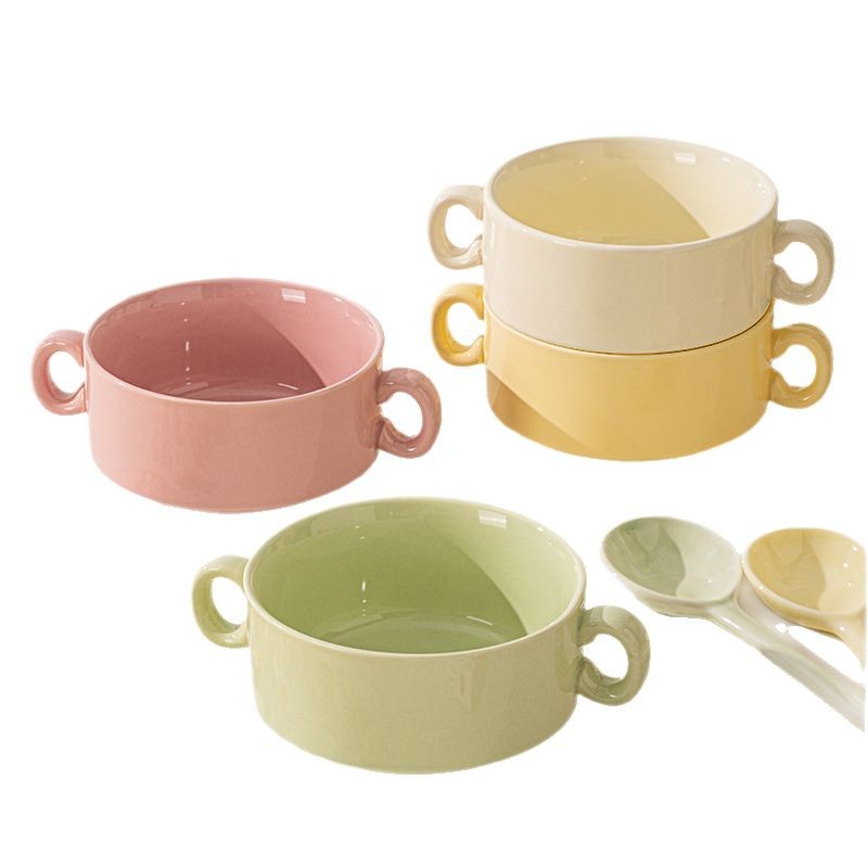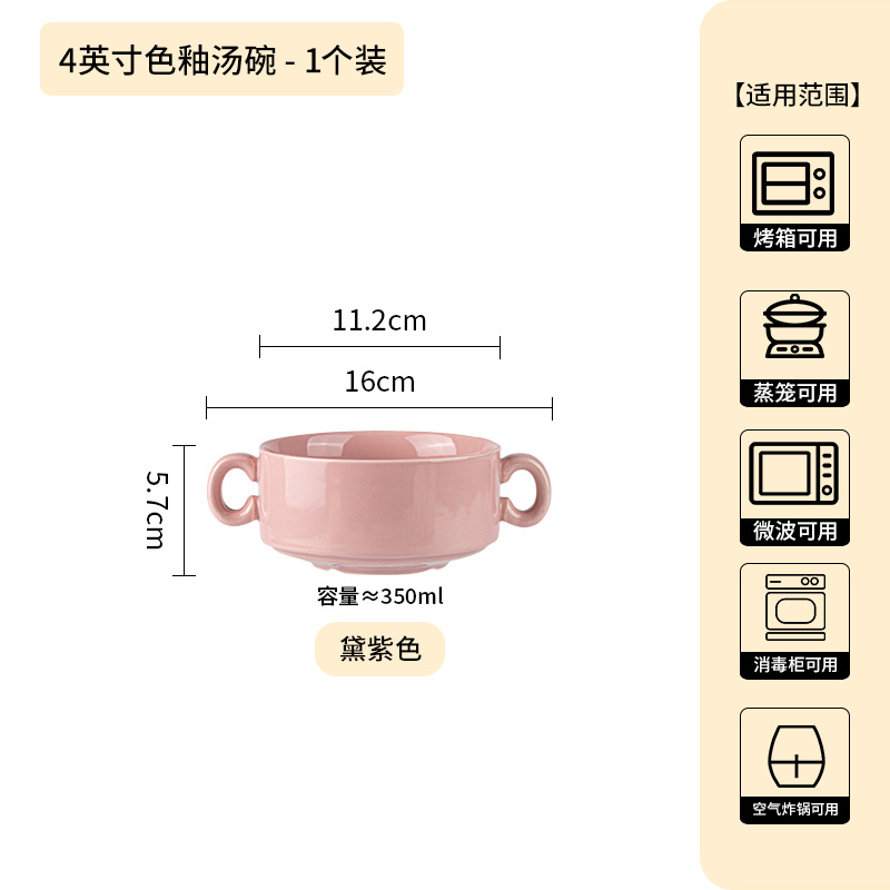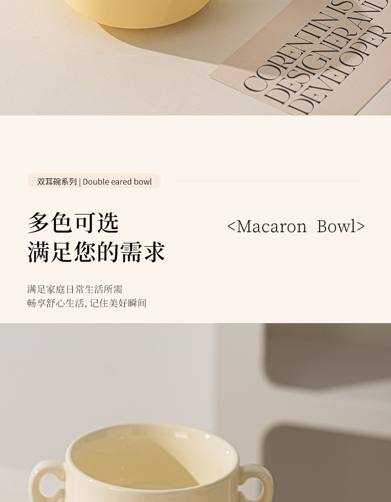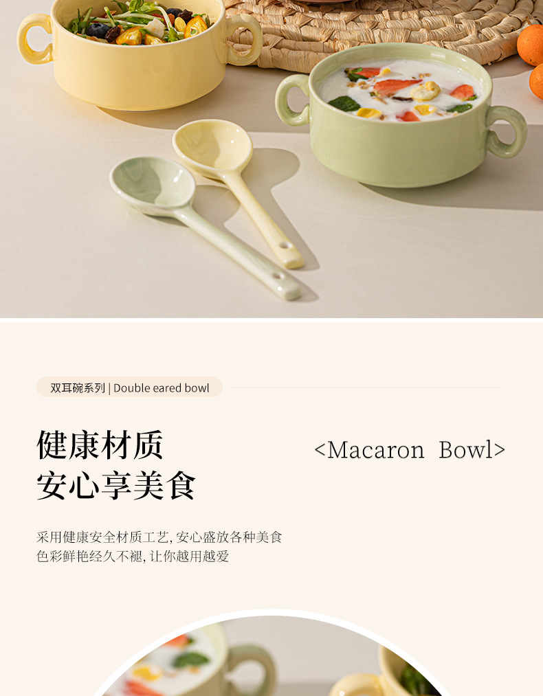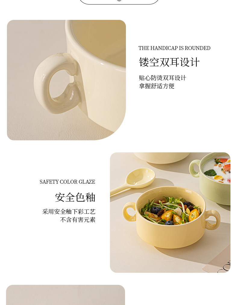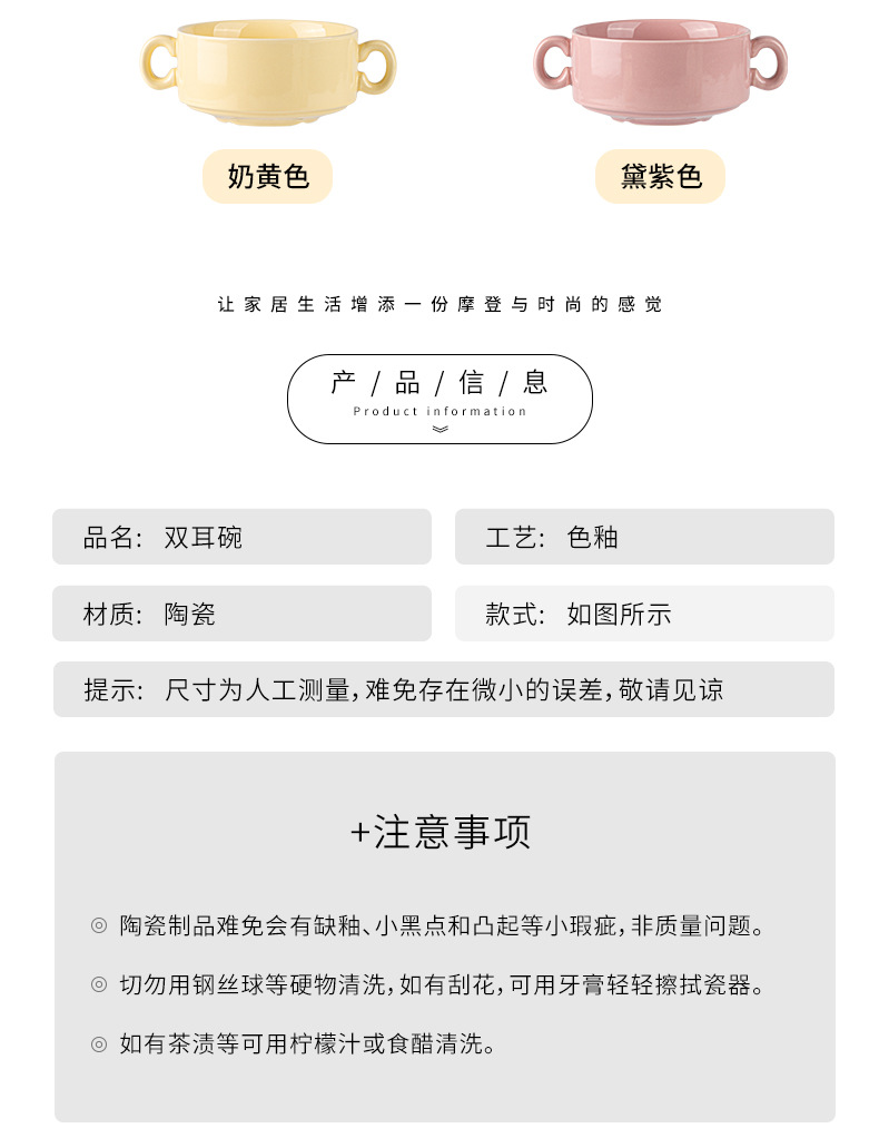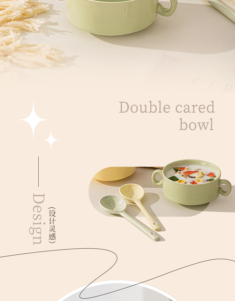 奶油色釉下彩双耳陶瓷碗家用高颜值轻奢汤碗蒸蛋碗酸奶碗陶瓷餐具