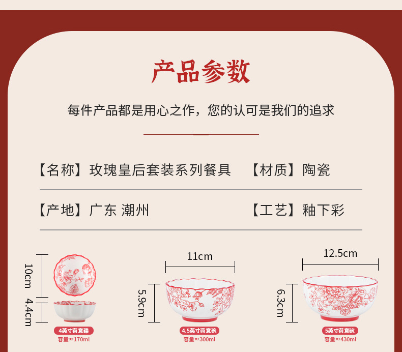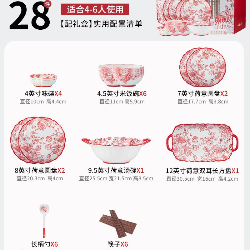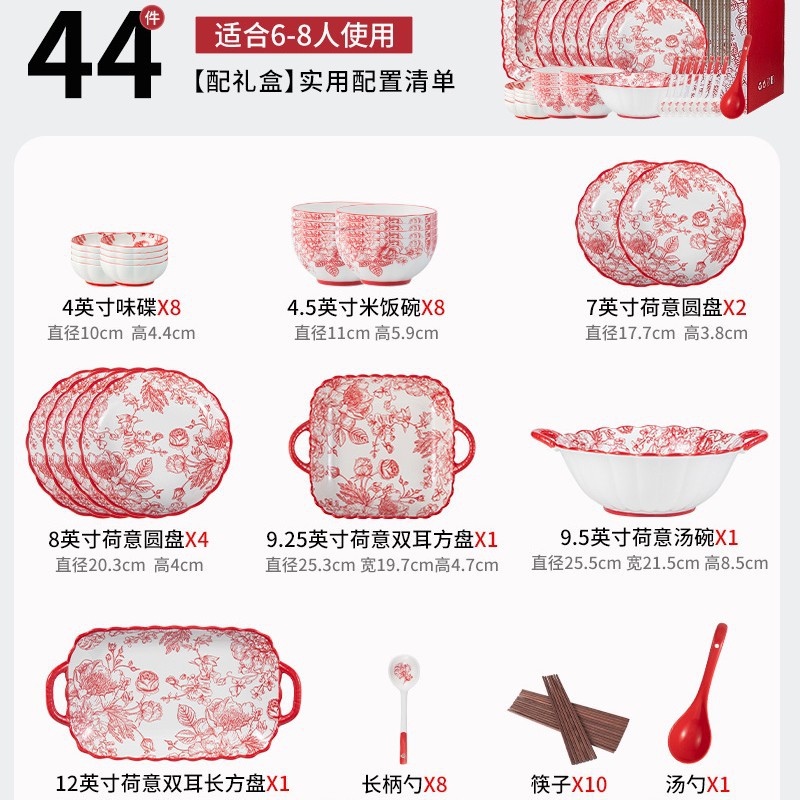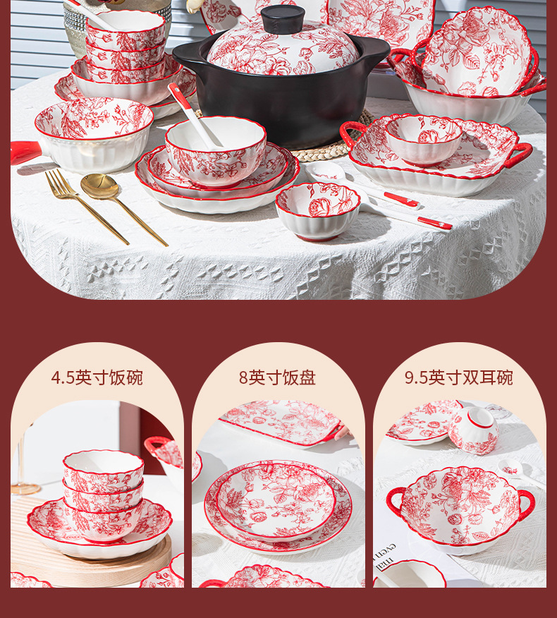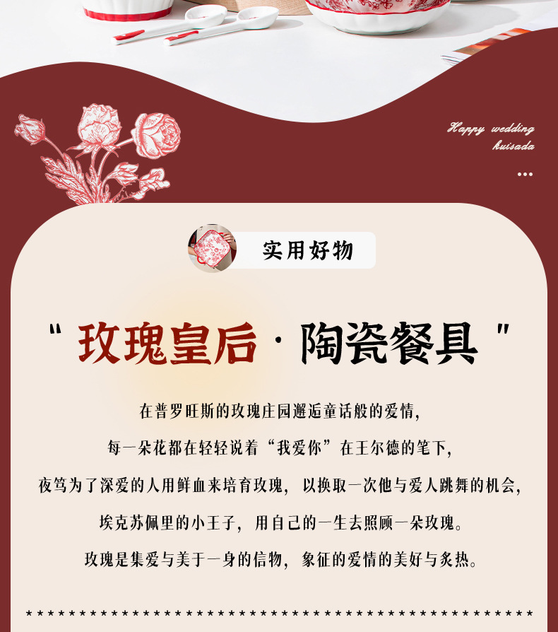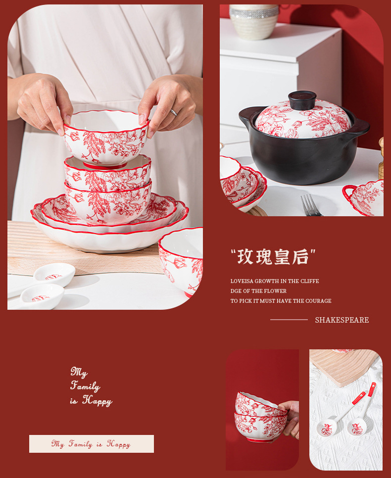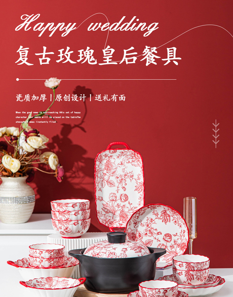 新中式餐具套装国风碗碟盘套装家用新婚礼物玫瑰皇后盘筷餐具套装
