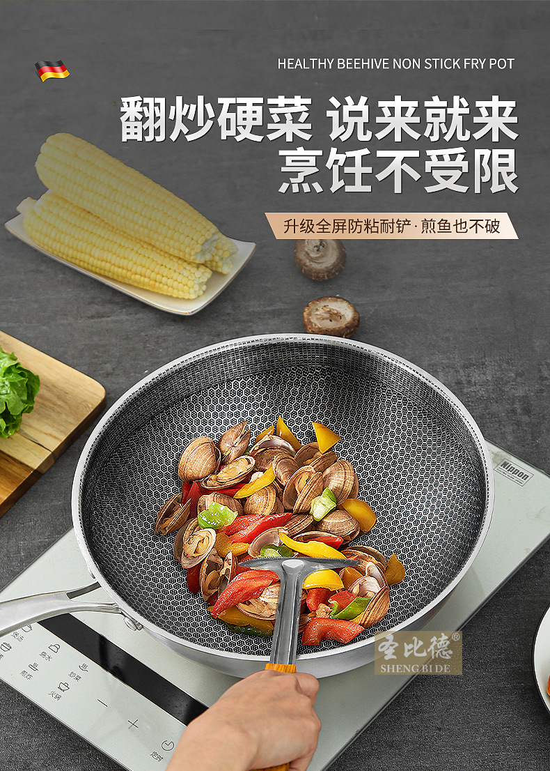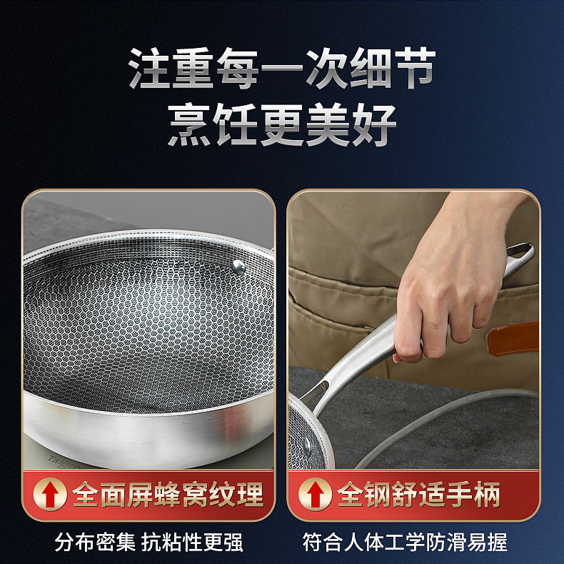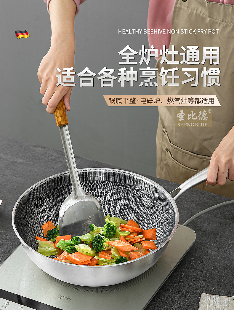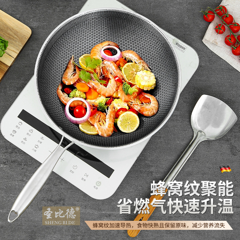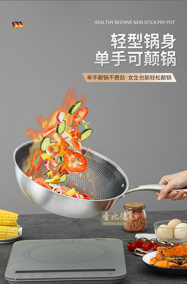 不锈钢炒锅无涂层蜂窝不粘锅炒锅轻油烟炒菜锅家用煤气燃气电磁炉