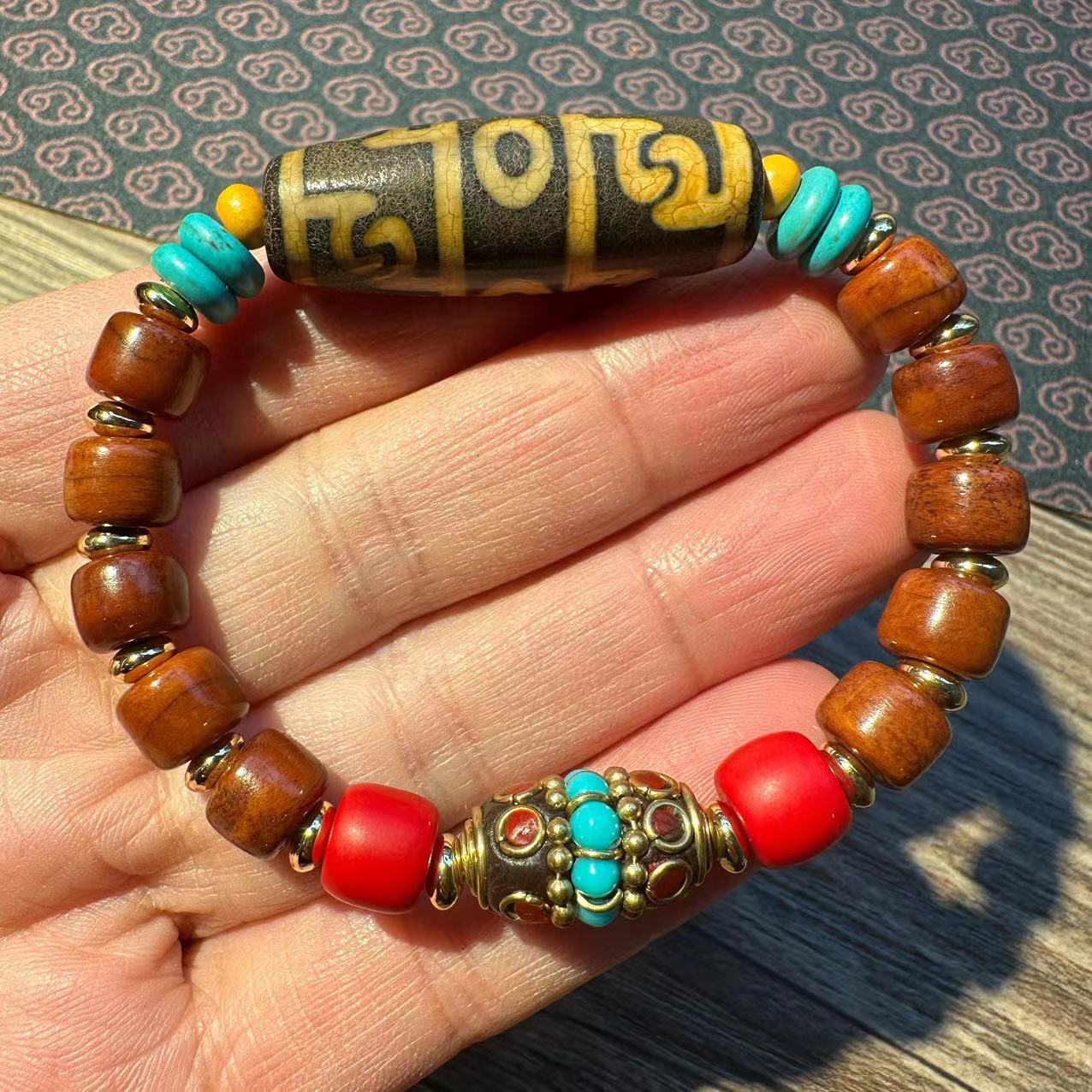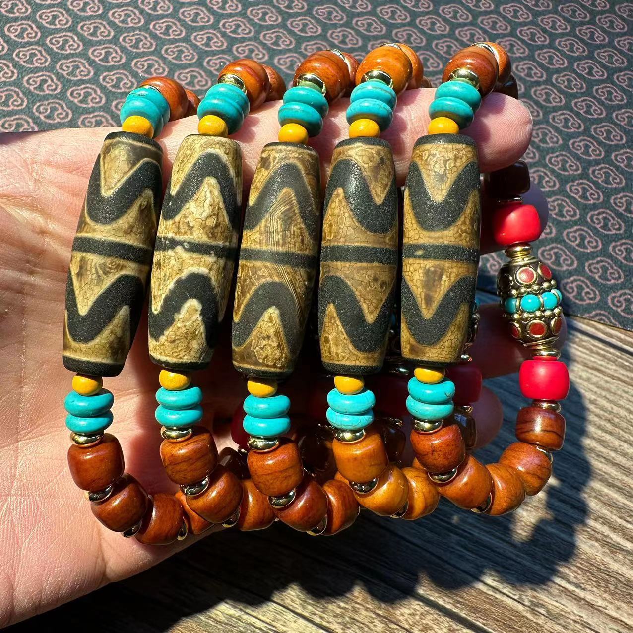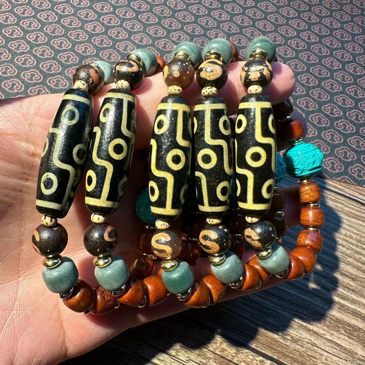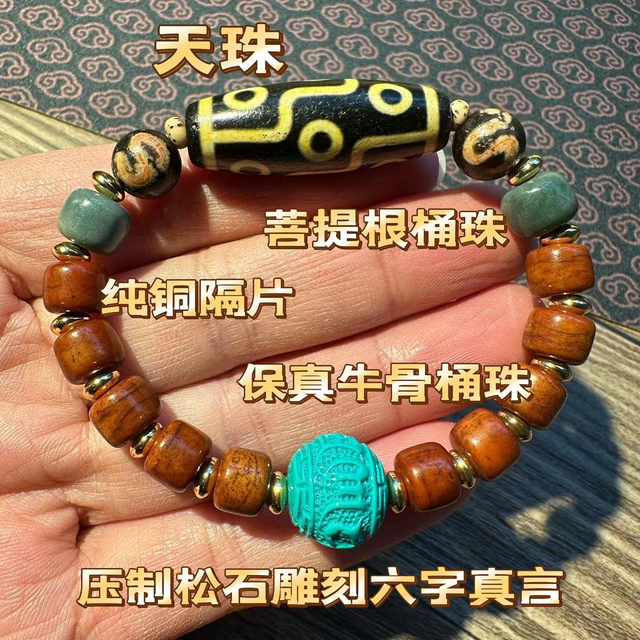 藏式牛骨手串天然牦牛骨尼泊尔铜珠九眼天珠手链骨头文玩佛珠批发